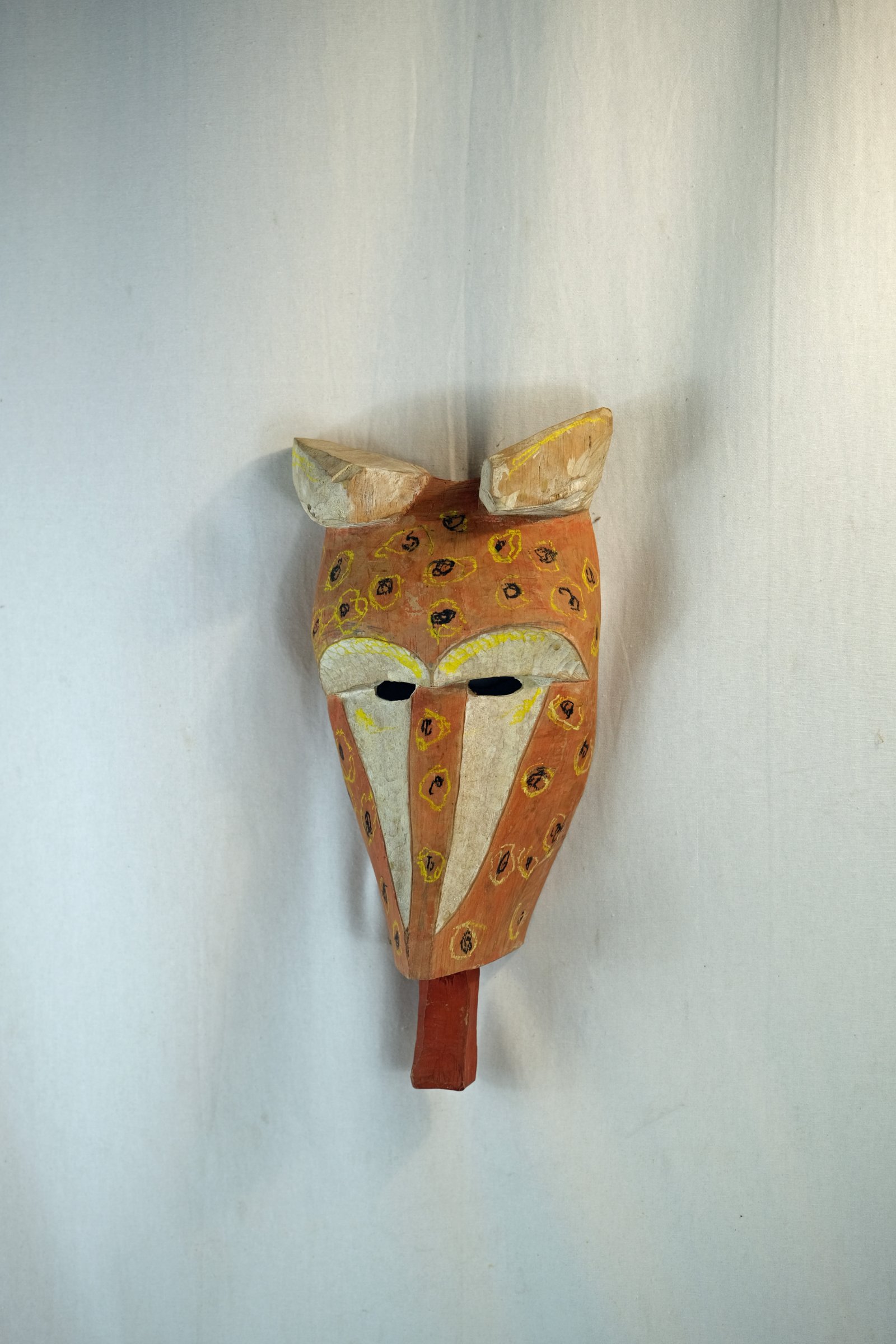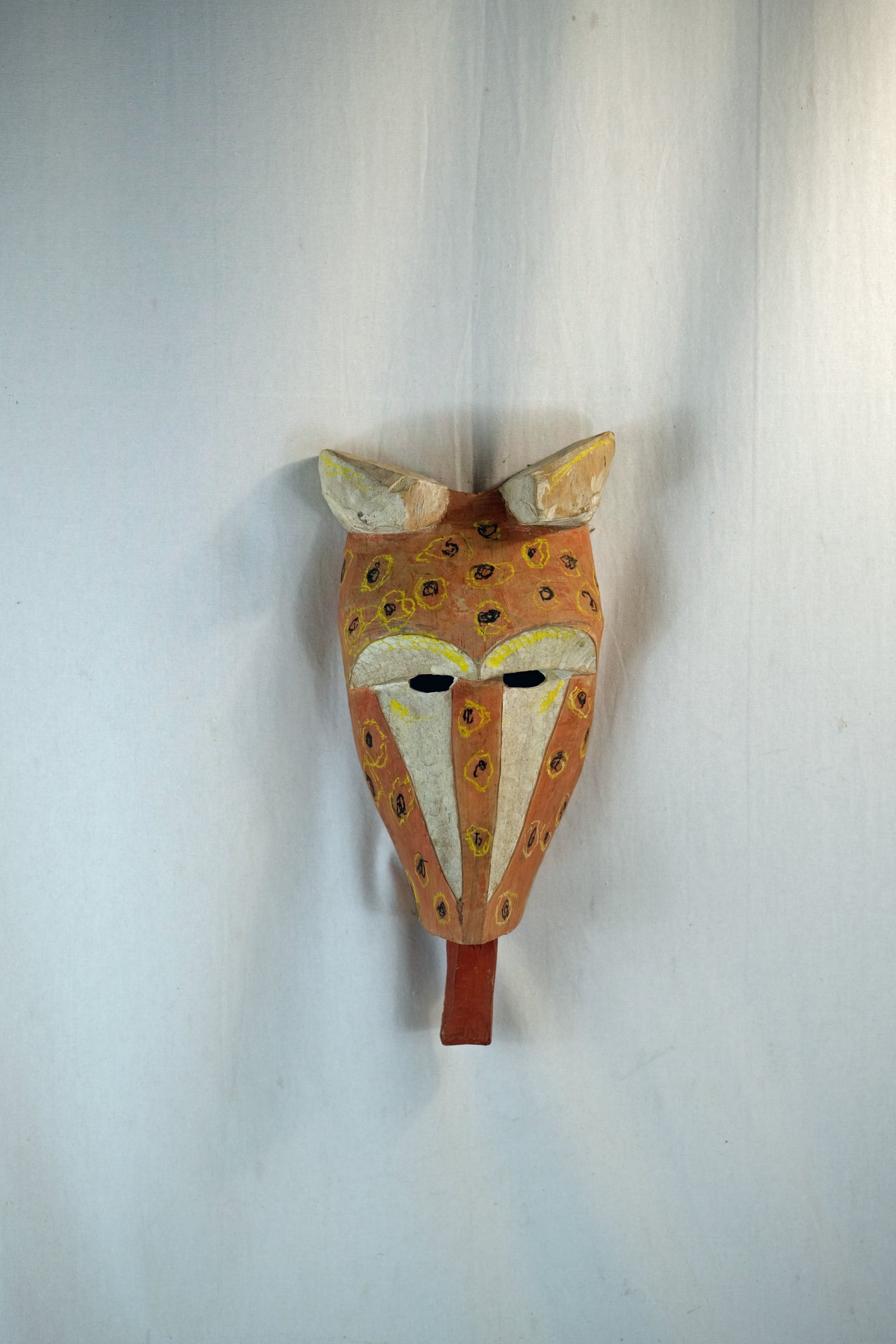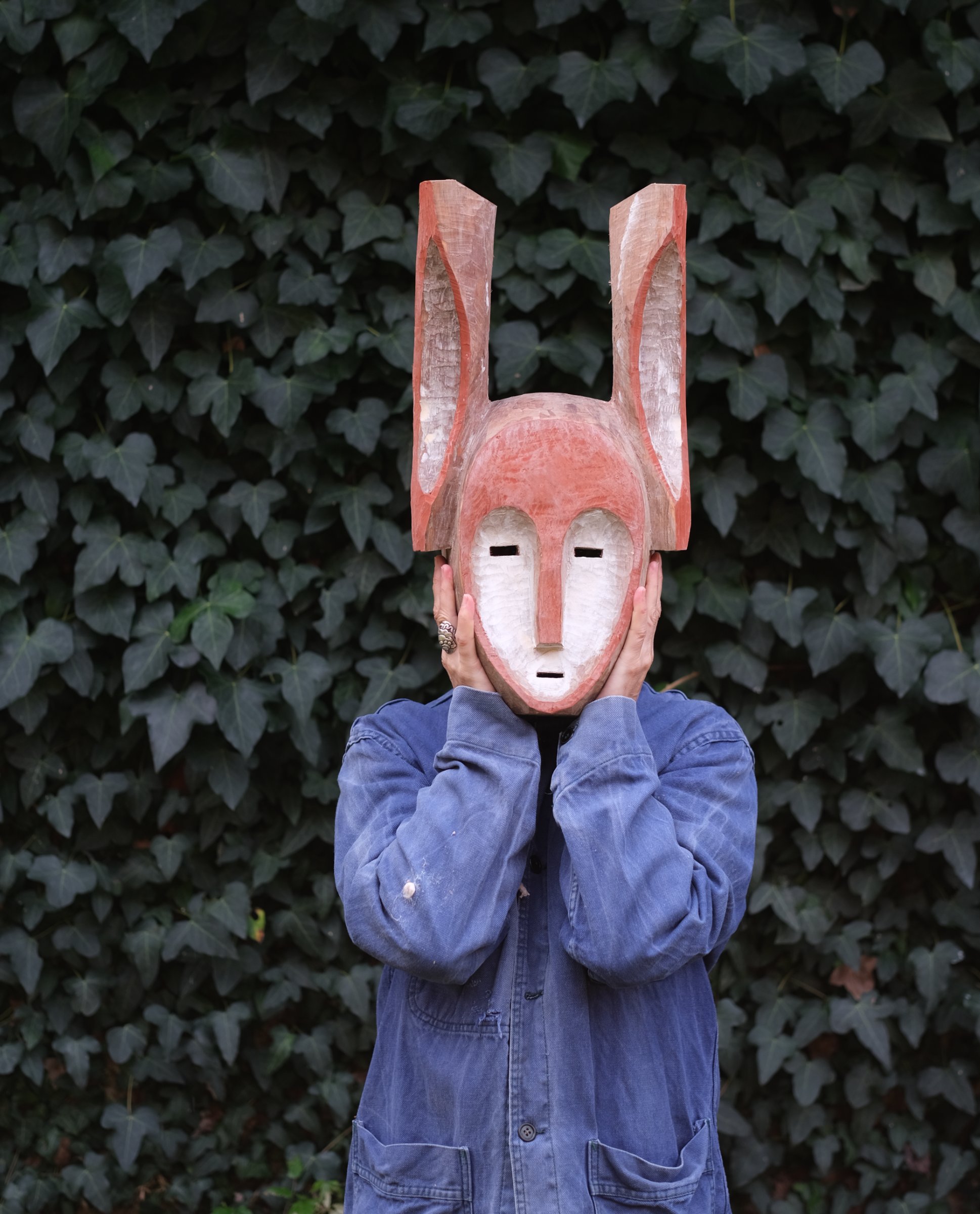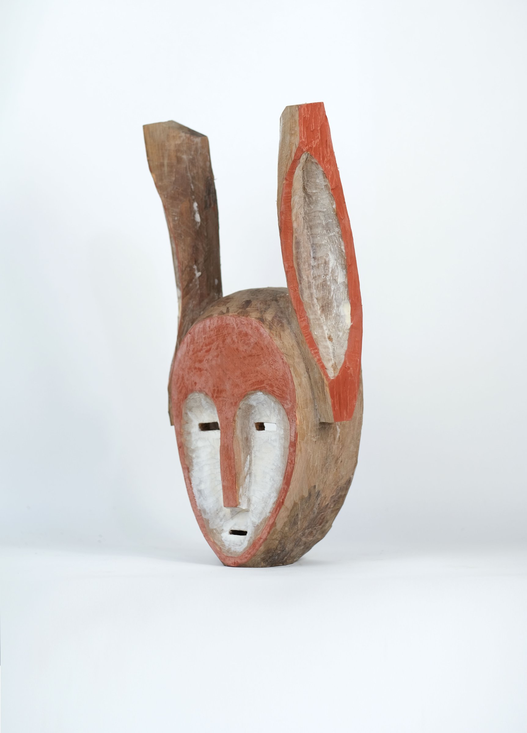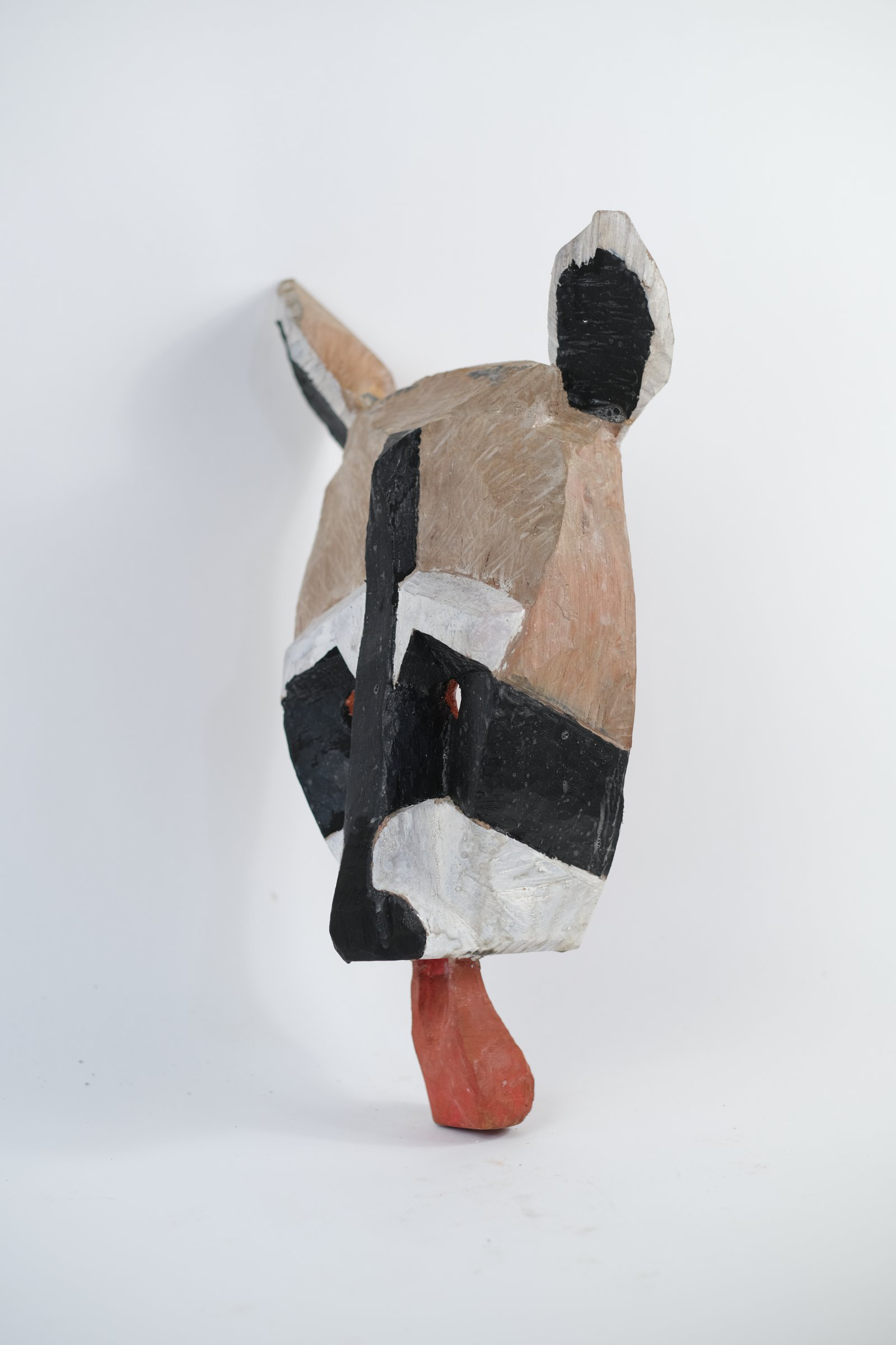 La production de masques est installée dans ma pratique depuis 2017. Autonomes, ces pièces peuvent être présentées sur des cimaises ou des socles, voire être portées. Elles sont également parfois associées à d’autres sculptures, qu’elles complètent (voir Téké (2025)) ou habitent (voir Les métamorphoses de Champey (2020)).