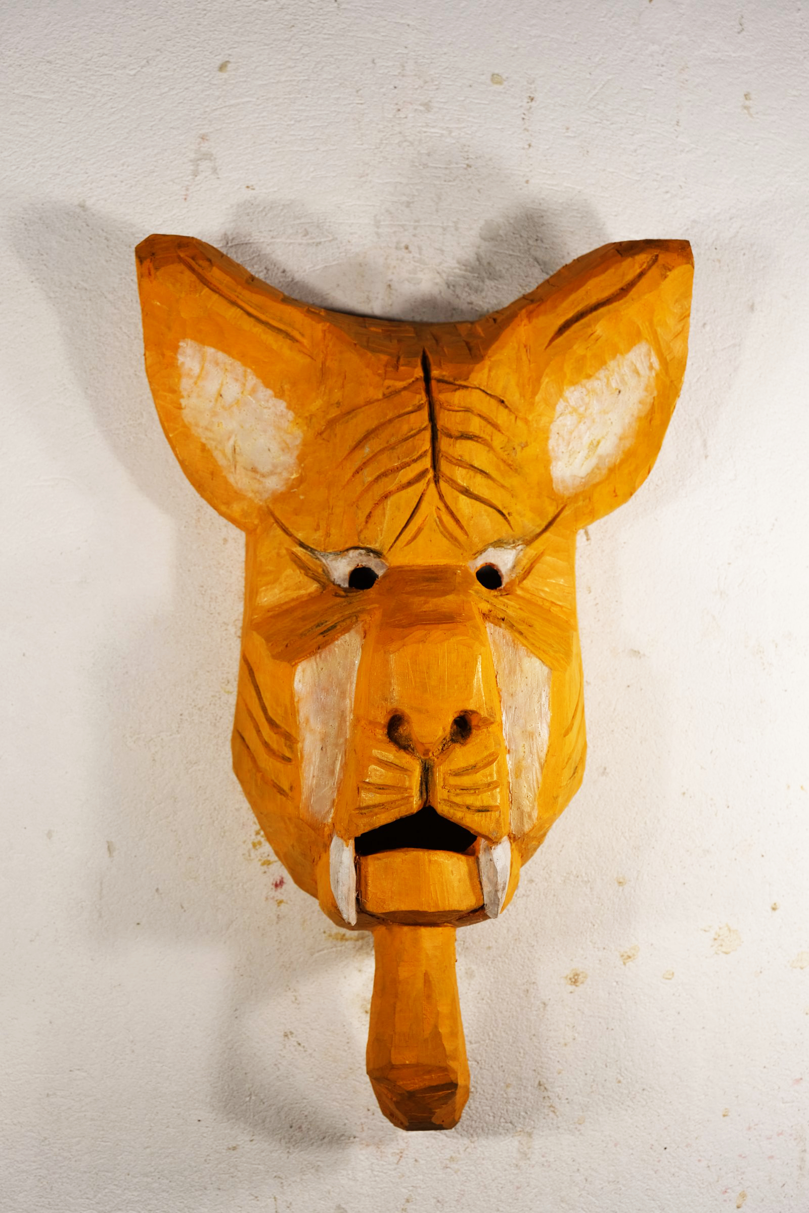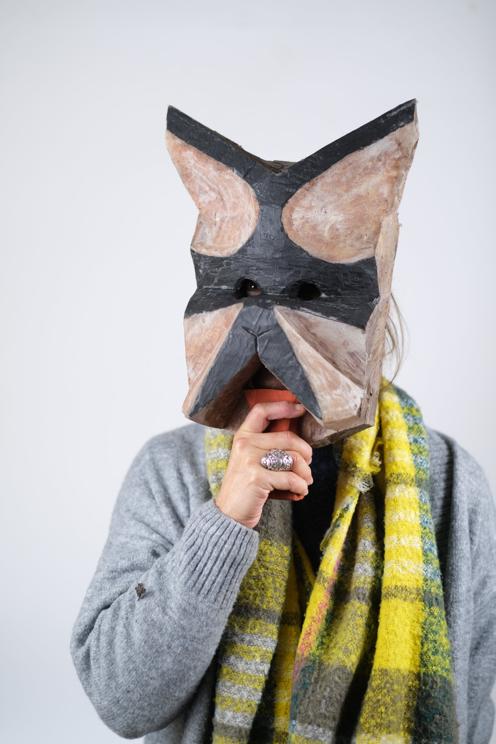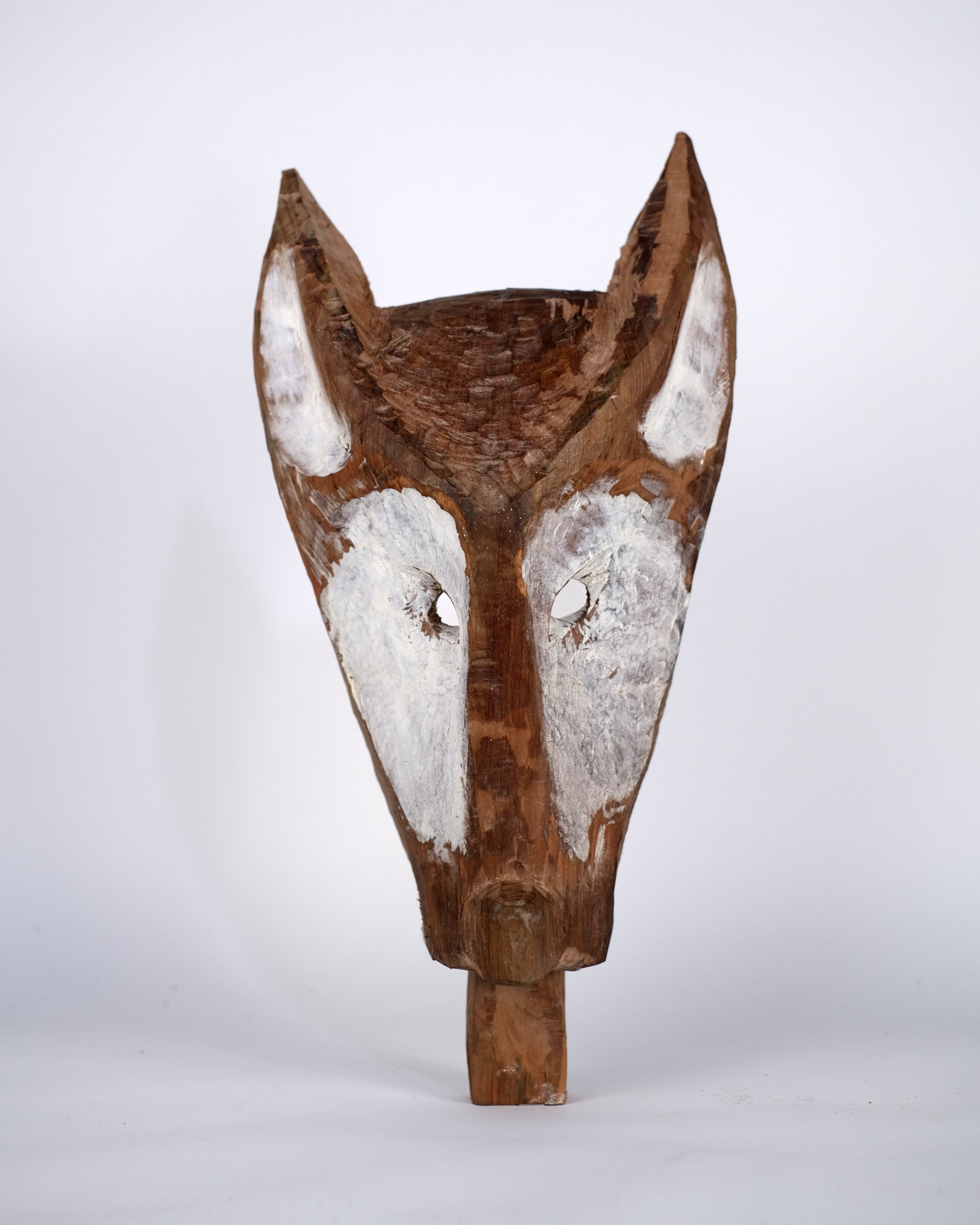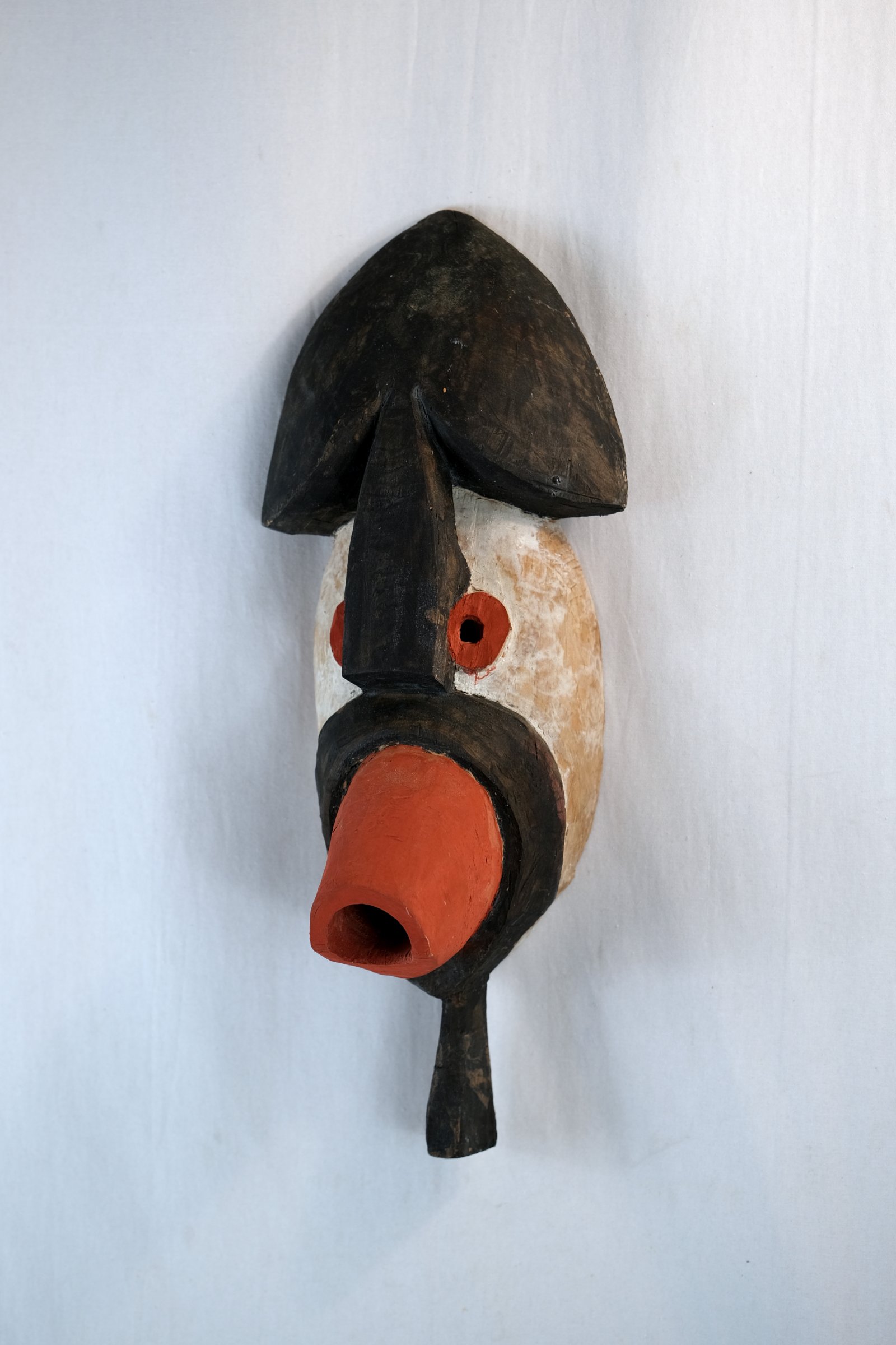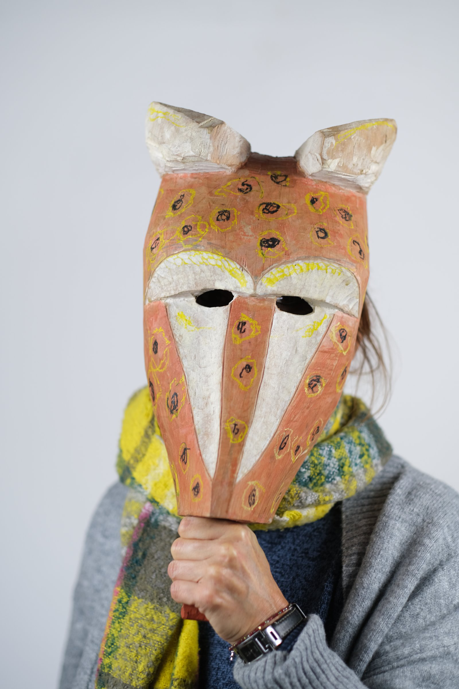 La production de masques est installée dans ma pratique depuis 2017. Autonomes, ces pièces peuvent être présentées sur des cimaises ou des socles, voire être portées. Elles sont également parfois associées à d’autres sculptures, qu’elles complètent (voir Téké (2025)) ou habitent (voir Les métamorphoses de Champey (2020)).
