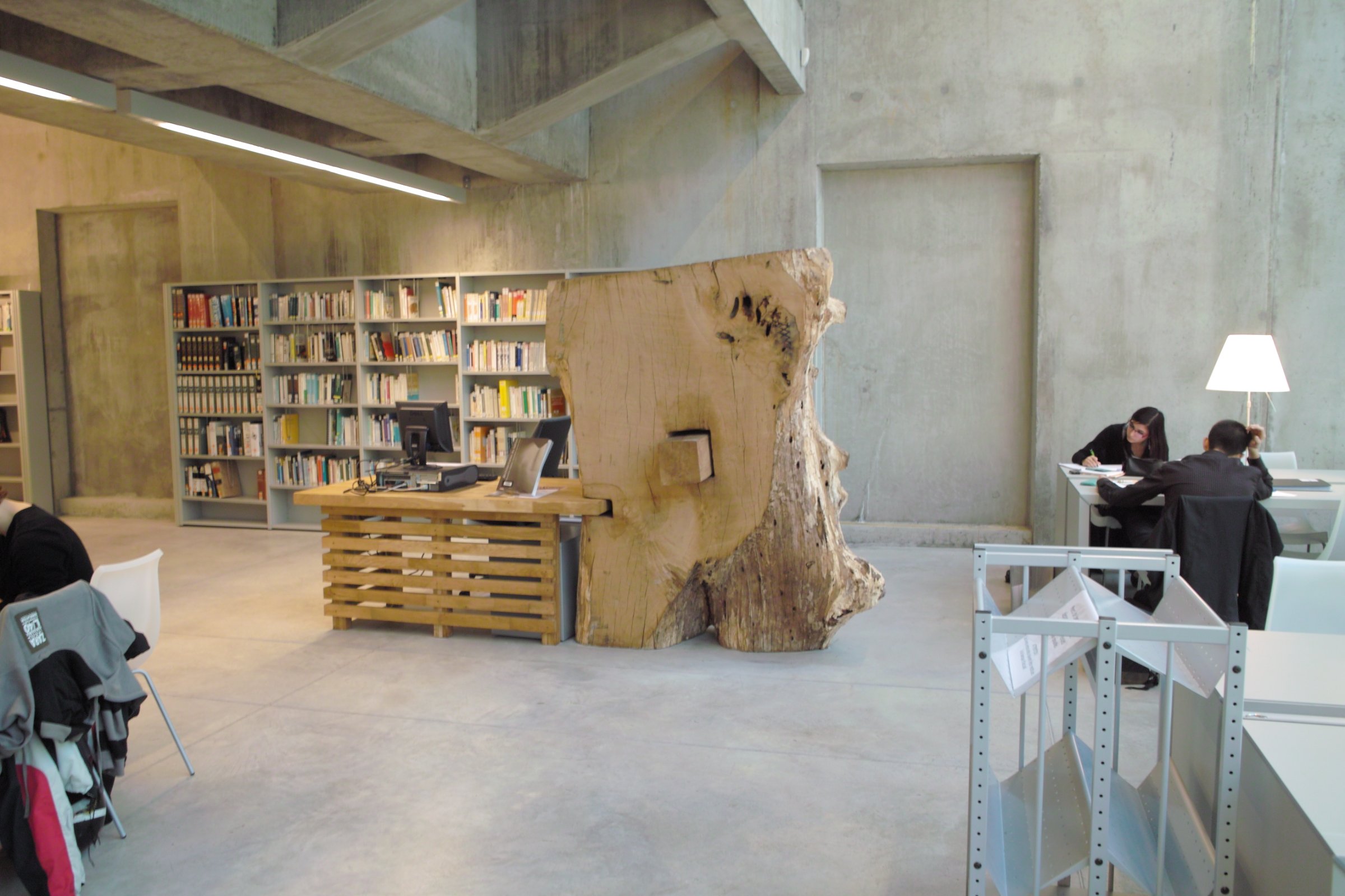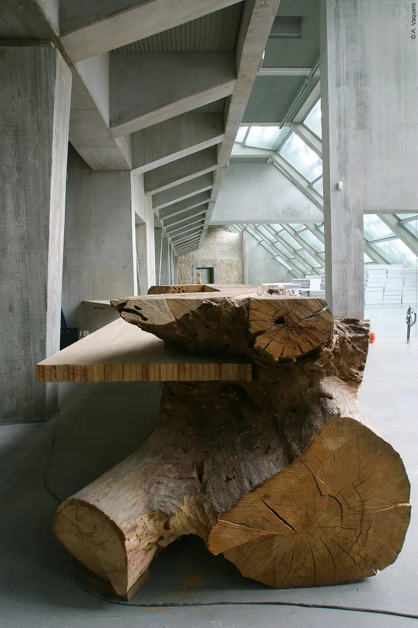La première banque d’accueil, située au sein du pôle documentaire, est réalisée à partir d’un important morceau de tronc d’arbre posé sur un sol de béton. L’une des extrémités laisse apparaître le départ des premières branches quand l’autre s’articule harmonieusement, en dessinant un angle, avec un bureau en bois brut au design contemporain. Du côté des usageres, la sculpture s’offre au regard avec ces accidents, ces courbes et les traces du temps. Du côté du personnel, un plan de travail épais et lisse en bois brut est encastré dans le chêne. La seconde banque d’accueil reprend le même vocabulaire formel. Un morceau de tronc renversé – on observe à la base le départ de deux énormes branches – posé à la verticale, est assemblé à un bureau dont le dessin général est identique au précédent. Quant aux bancs, de même facture, conçus en bois brut également, ils sont installés dans un salon de détente aménagé dans un tunnel en murs de pierre d’époque, découvert au moment des travaux. L’intervention artistique de Christophe Doucet noue un dialogue à la fois contextuel et poétique avec l’architecture inventive et atypique conçue par les architectes Jean De Giacento et Duncan Lewis et permet de conserver, et de rendre visible, une partie de l’histoire du site.