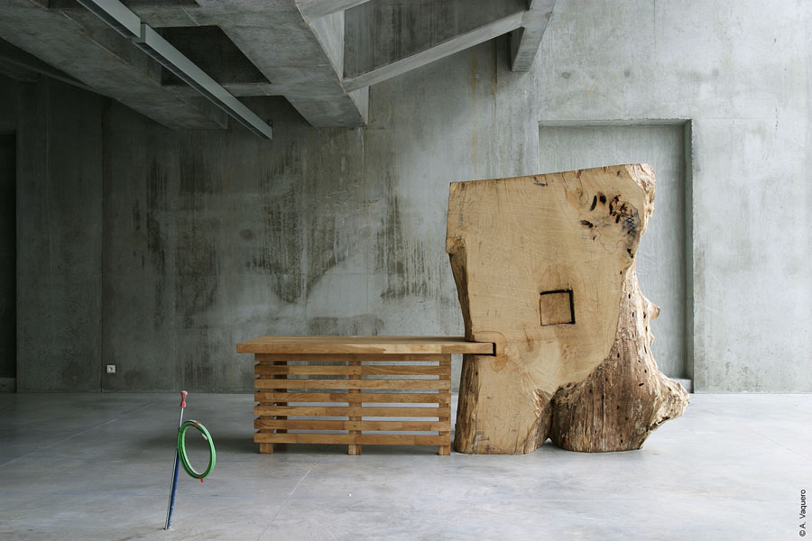 La seconde banque d’accueil reprend le même vocabulaire formel. Un morceau de tronc renversé – on observe à la base le départ de deux énormes branches – posé à la verticale, est assemblé à un bureau dont le dessin général est identique au précédent. Quant aux bancs, de même facture, conçus en bois brut également, ils sont installés dans un salon de détente aménagé dans un tunnel en murs de pierre d’époque, découvert au moment des travaux. L’intervention artistique de Christophe Doucet noue un dialogue à la fois contextuel et poétique avec l’architecture inventive et atypique conçue par les architectes Jean De Giacento et Duncan Lewis et permet de conserver, et de rendre visible, une partie de l’histoire du site.