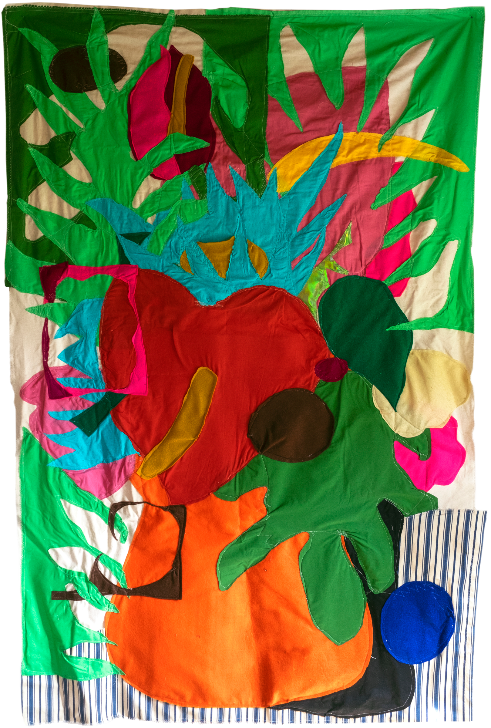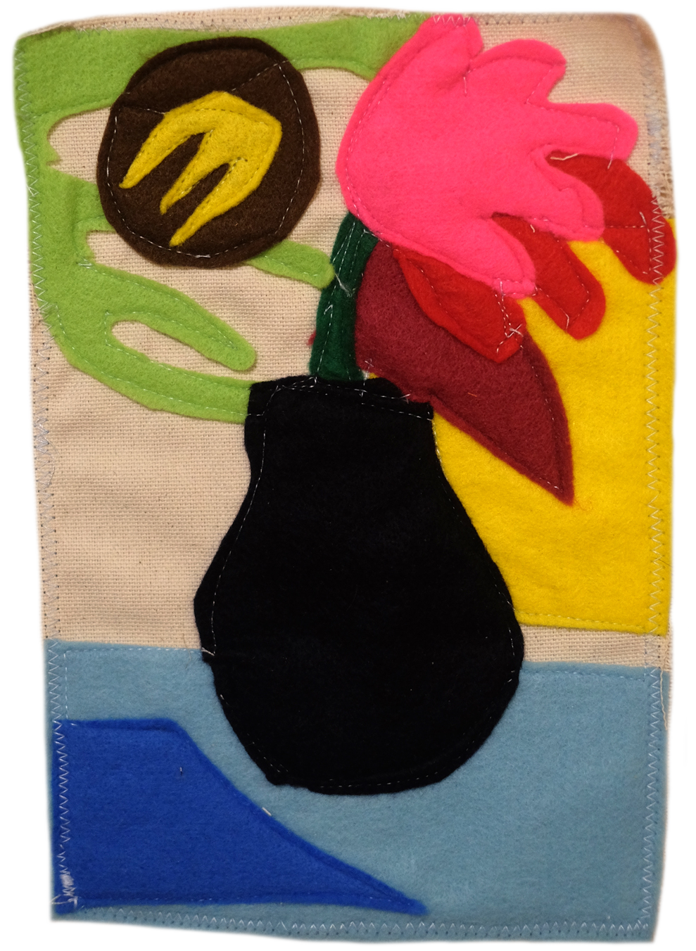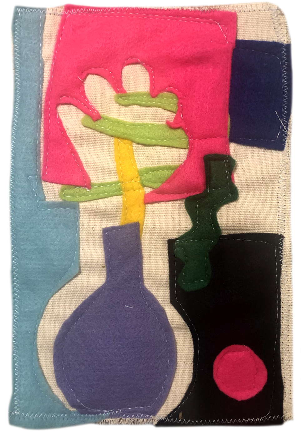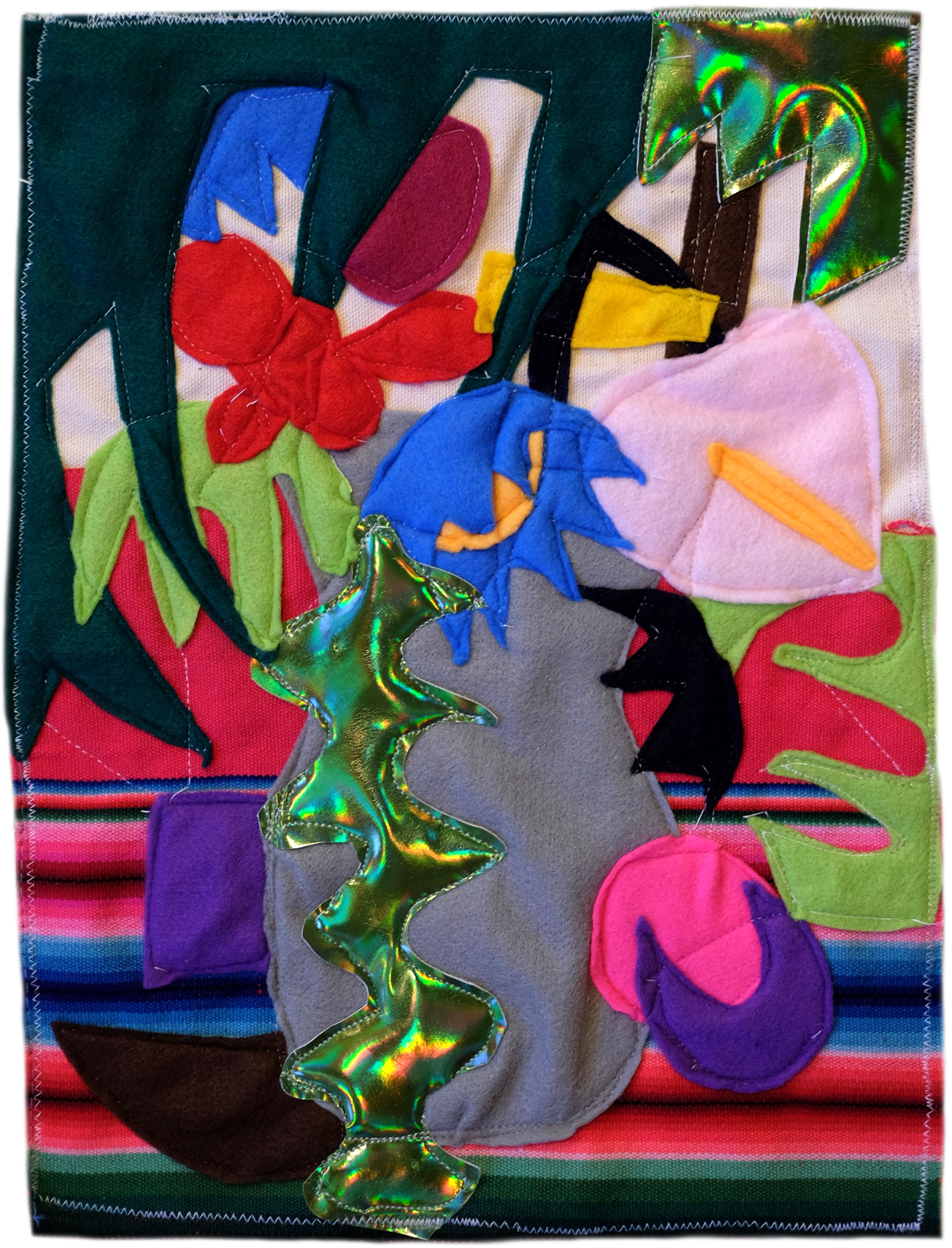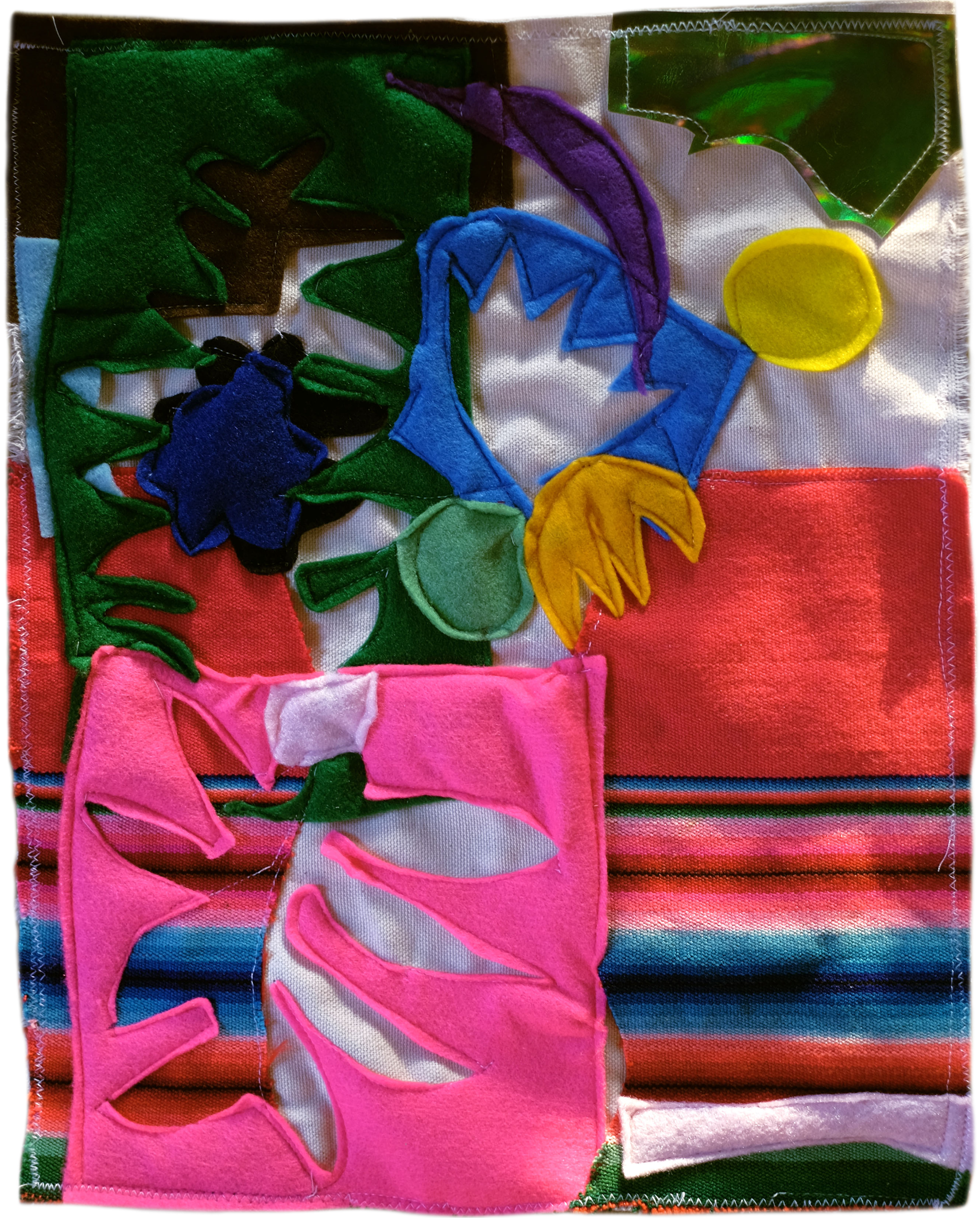 Tissu, feutrine, vinyle et fil, 36 x 26 cm