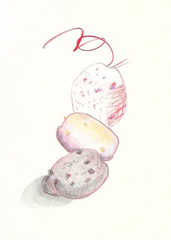 « Mais voilà que depuis quelques jours je me suis mis à dessiner des pommes de terre – c’est idiot mais c’est comme cela, une envie irrésistible de dessiner des patates ! De les dessiner et de les redessiner, d’éprouver cela, cette espèce de relation à l’objet, au regard observant, à sa traduction par du graphe, du geste, par une certaine liberté, laisser-aller de la main… Hier j’ai pensé en réaliser en volume, en bois… Aujourd’hui j’en ai réalisé une en pâte à modeler et une autre en terre ocre rouge…