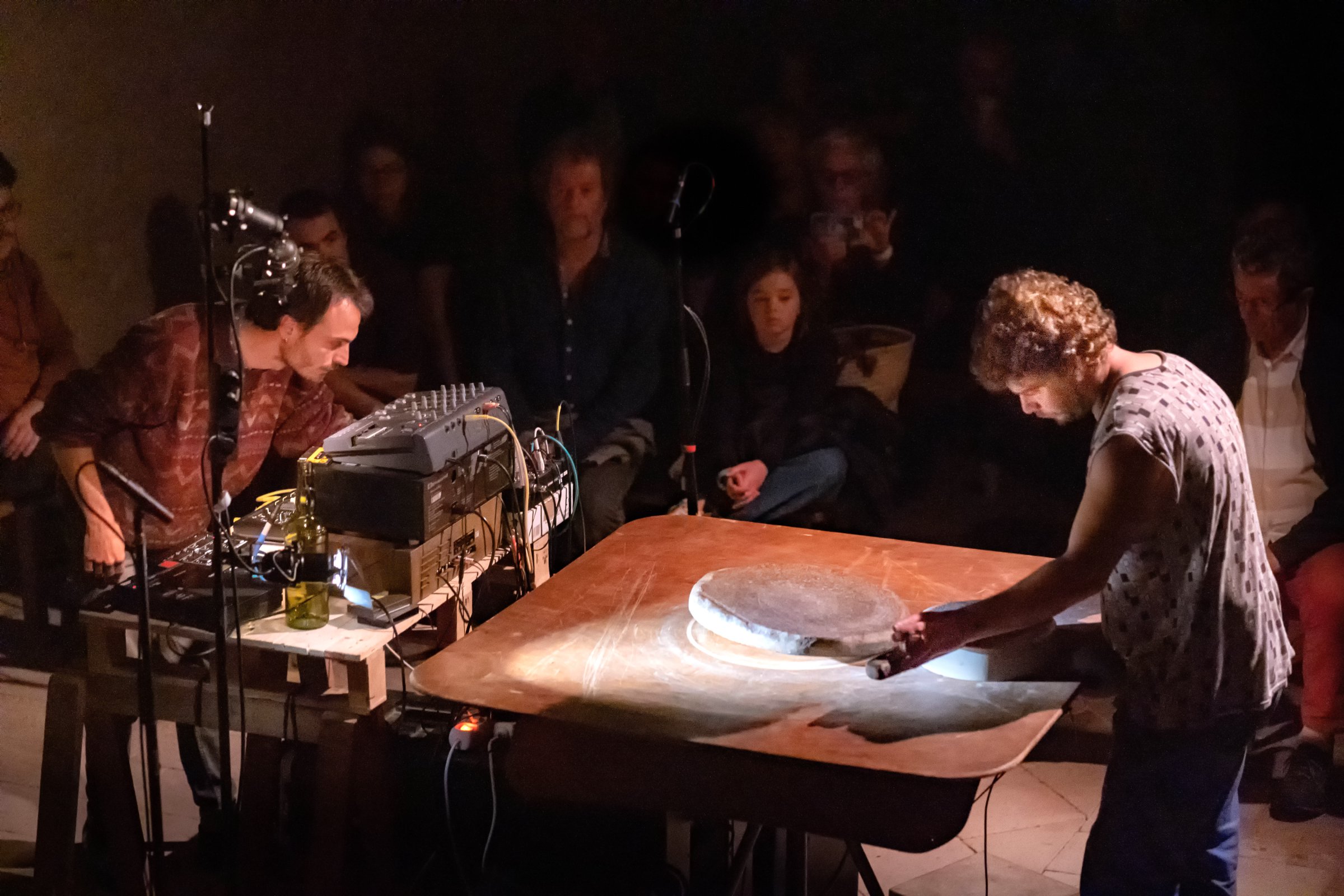 En duo, Alexandre Chanoine et Kevin Orliange mélangent les textures granuleuses des pierres et des bandes magnétiques. Il en résulte une musique qui distord le temps, le rythme et le son.