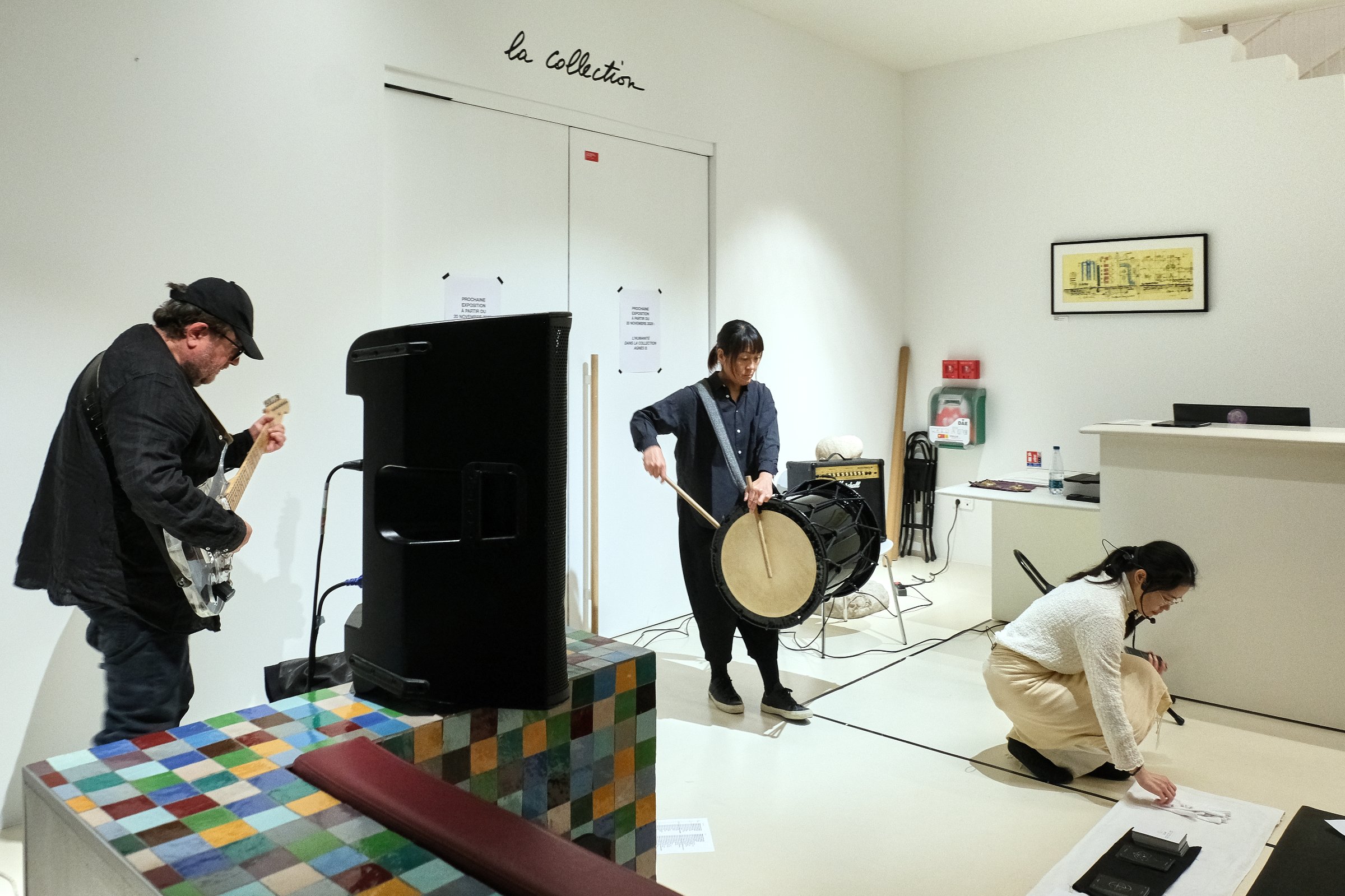Performance musicale du collectif AO (Frédéric Desmesure, Éric Heim, Nori Kajio, Hsin-Yun Tsai) Vue de la performance à La Fab. librairie du jour agnès b., Paris, octobre 2025