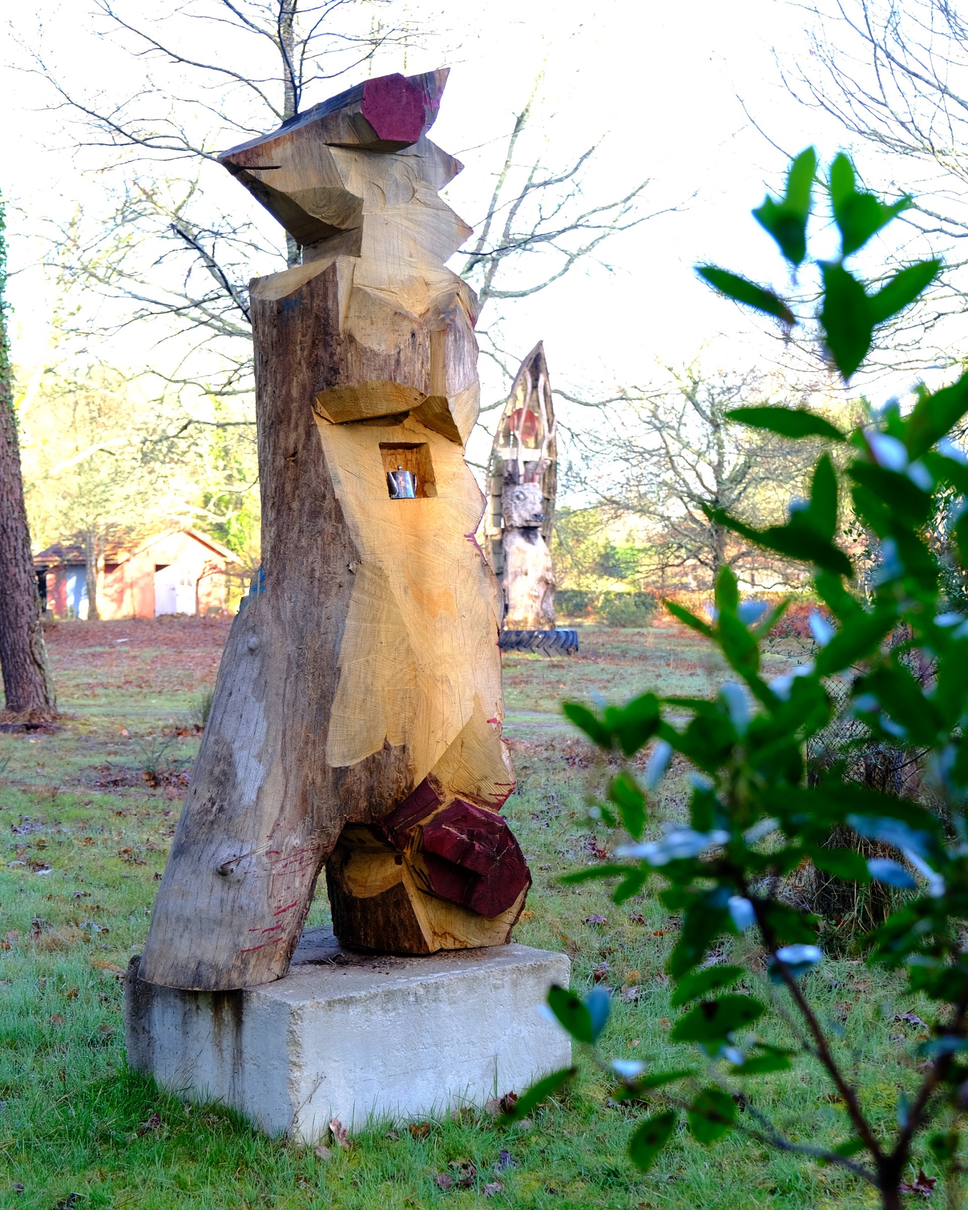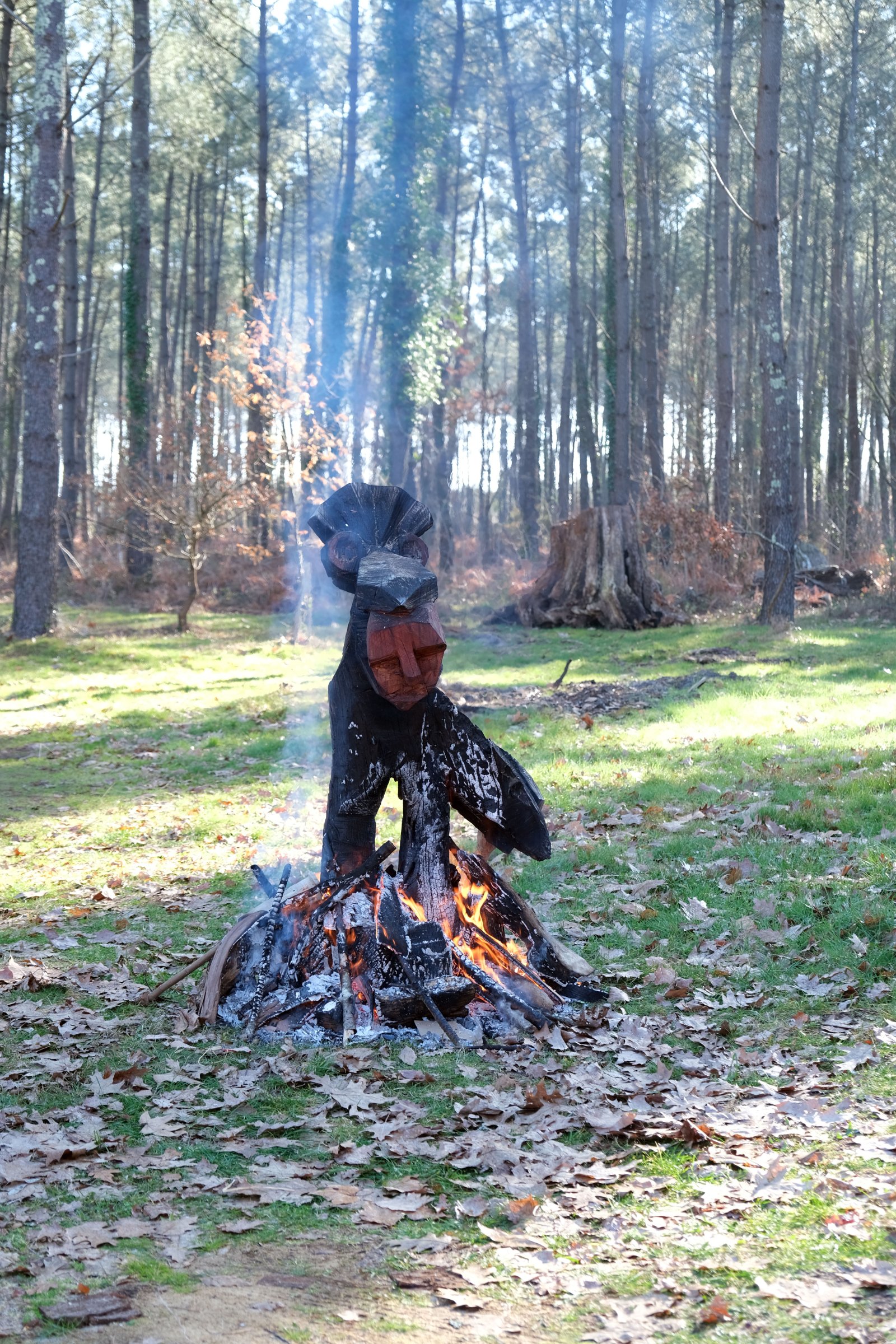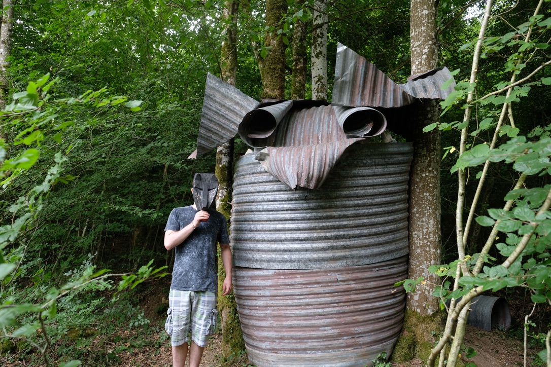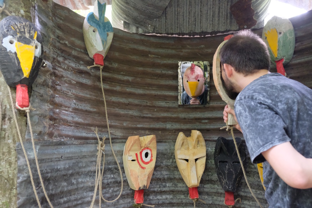 Christophe Doucet partage un ensemble de 15 masques en bois de frêne sculptés et peints aux contours animaliers et anthropomorphes. Au sein d’un petit abris, chaque promeneurse est invitée à s’en servir de façon ludique, à se laisser animer un instant par l’esprit d’un renard, d’un oiseau ou d’un personnage facétieux. En utilisant toute une palette de savoir-faire traditionnels, il réactive avec force le monde imaginaire ancré en chacun : porter un masque, jouer à être un autre, à faire semblant...