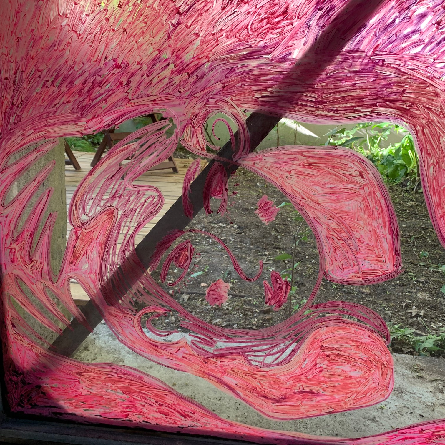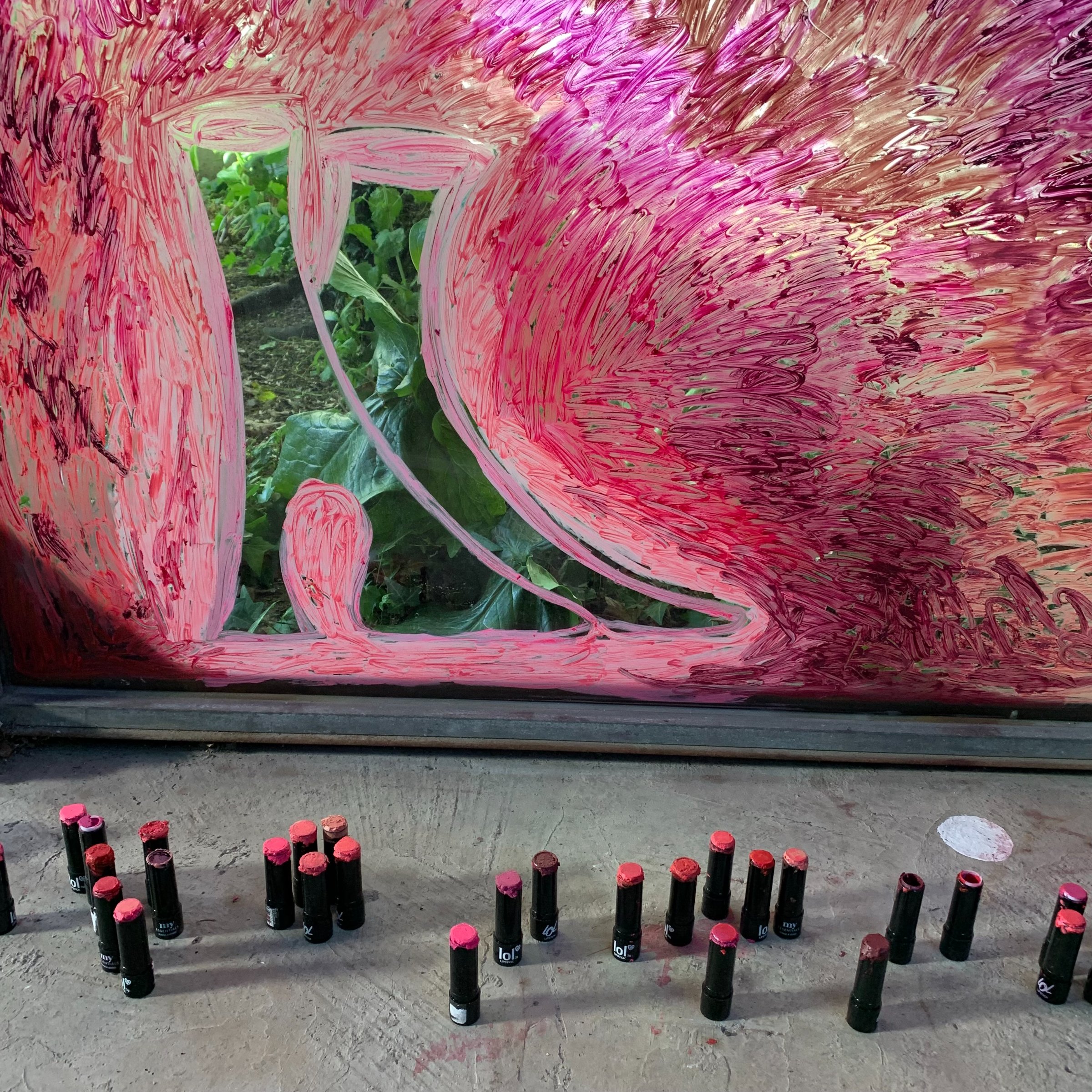 Dessin sur baie vitrée, 85 tubes de rouges à lèvres, 220 x 270 cm