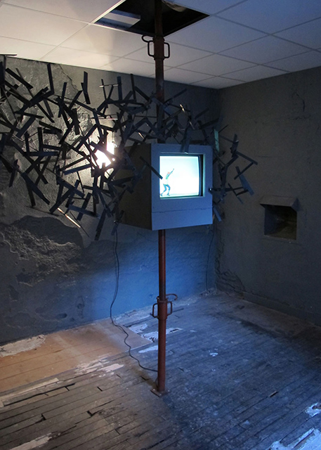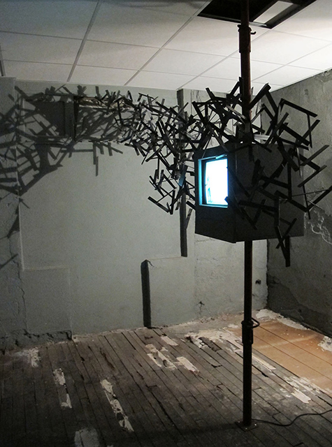 Un petit travailleur construit dans l’espace de l’écran une structure invisible. Cette structure sort du bloc moniteur et se matérialise en petits plats métalliques pour coloniser l’espace.