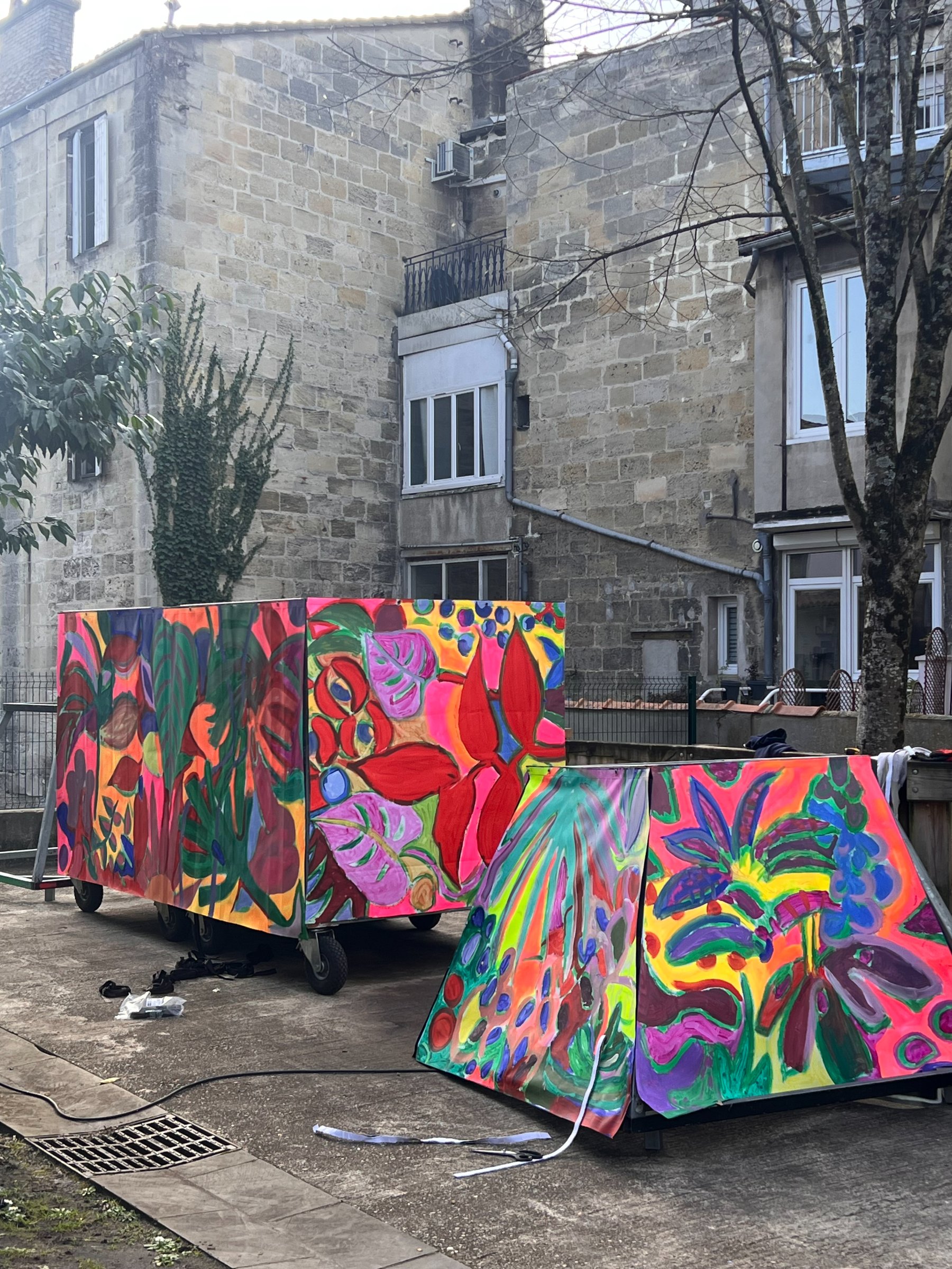 L’Amazonie s’étend sur 9 pays : Brésil, Colombie, Pérou, Bolivie, Vénézuela, Équateur, Guyana, Suriname et Guyane française. [...] L’imaginaire du Carnaval se construit autour de la faune, de la flore, des créatures mystiques et des légendes qui habitent cette forêt, mais aussi à travers les différentes cultures qui peuplent cette région. [...] Entre textile, peinture et dessins, son travail coloré et en mouvement sait nous emporter dans des formes de danse et d’onirisme. Duda Moraes construit en ateliers la scénographie d’un char, des costumes et des étendards. C’est aussi elle qui crée l’affiche du Carnaval. [...]