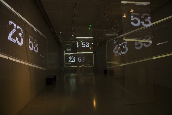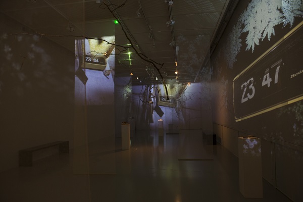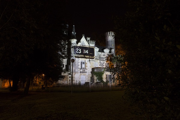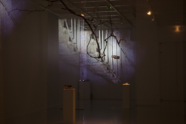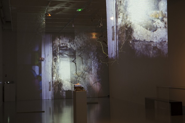 4 vidéoprojecteurs synchronisés, 3 enceintes, divers objets prélevés dans le château du Bois fleuri, tarlatane, grille, dimensions variables