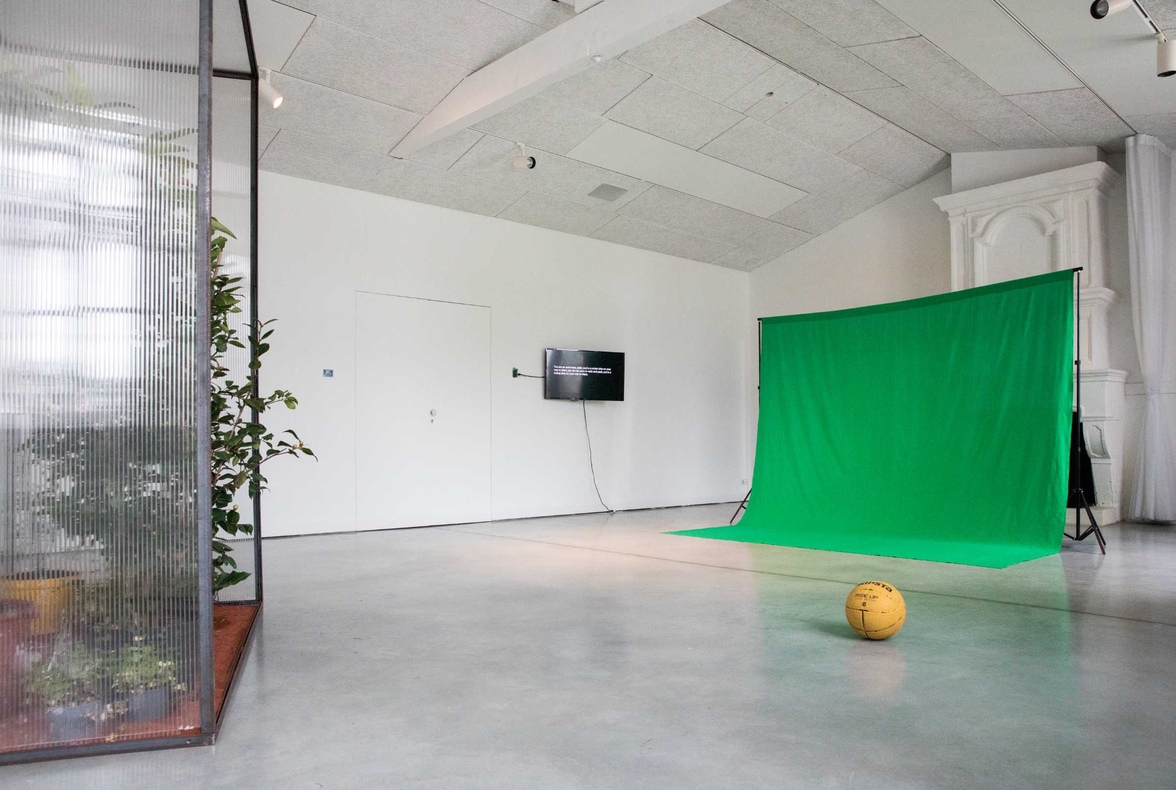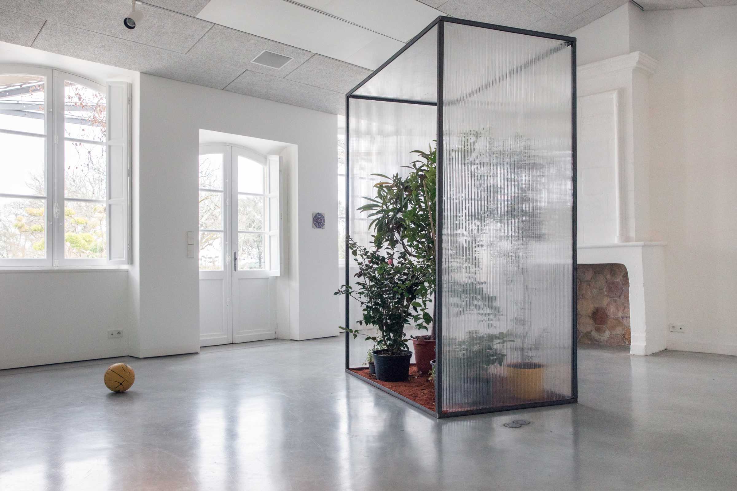 Installation à dimensions variables, fond vert, serre, plantes, ballon de basket jaune