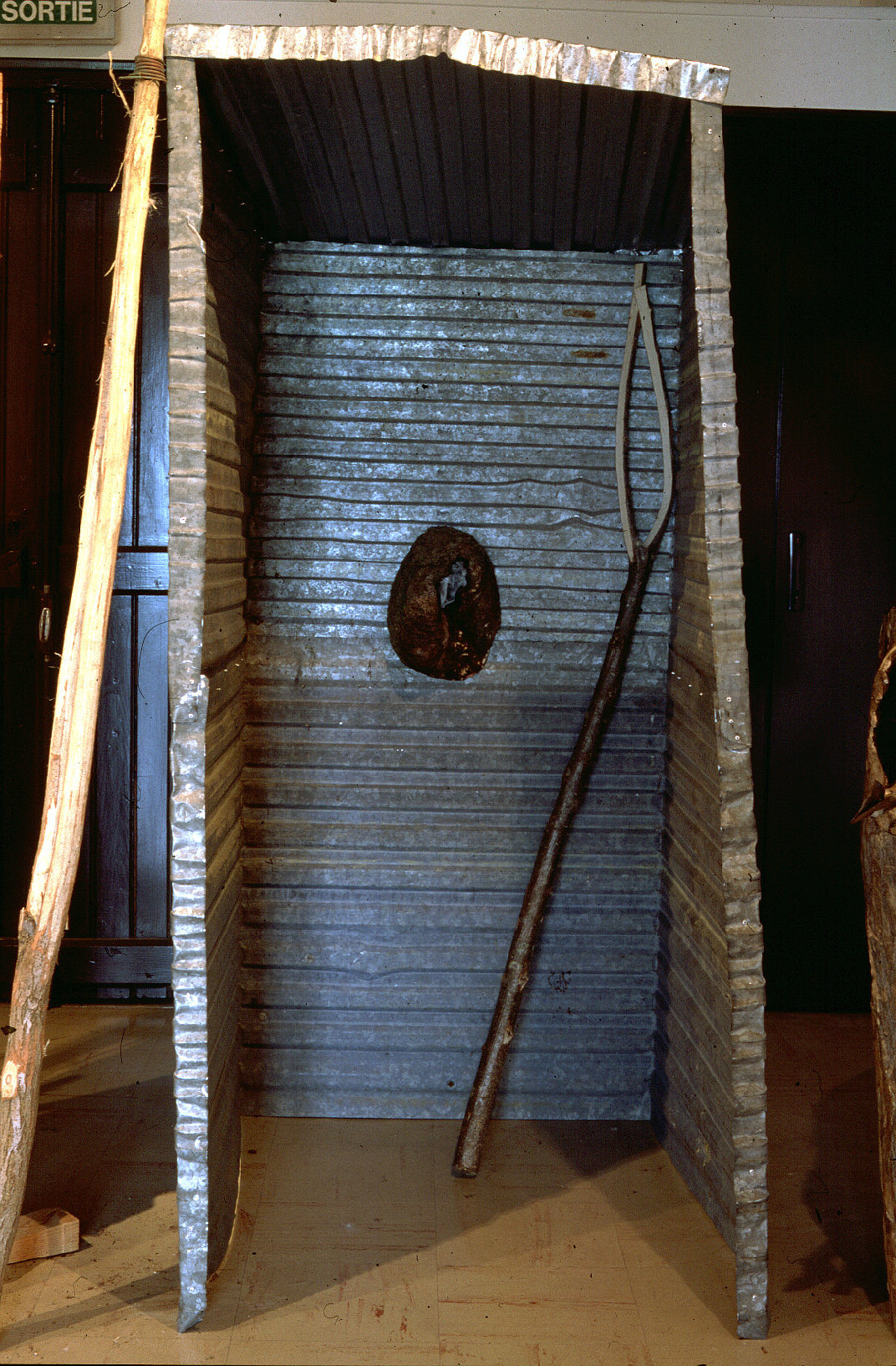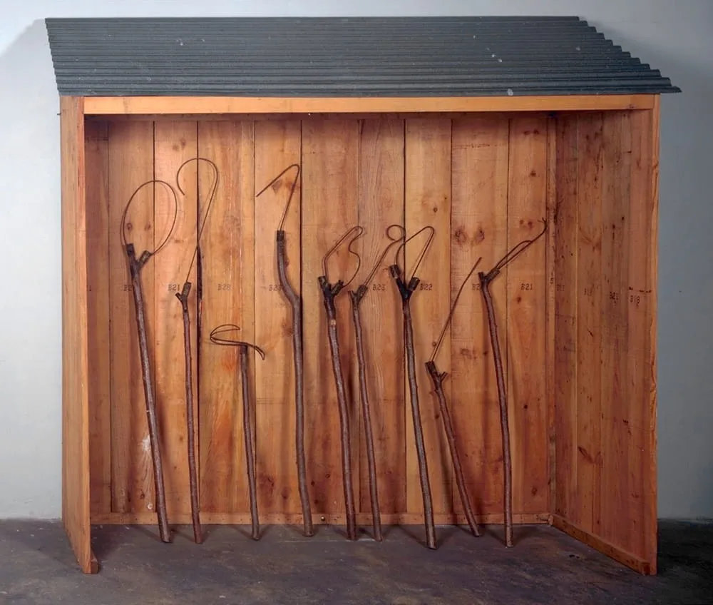 La Grande cabane est constituée de planches de pin, recouvertes de tôles ondulées. Elle ressemble à un simple appentis et abrite neufs « outils » emmanchés sur des branches d’arbres de taille et de formes différentes. De la branche représentant le manche ou de l’outil, il est difficile d’envisager lequel présida au choix de l’autre, conférant à ces objets une évidence, une alliance de la nature et de l’esprit.