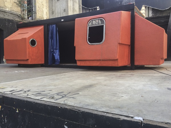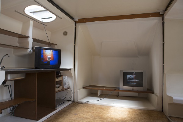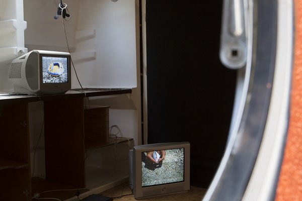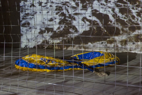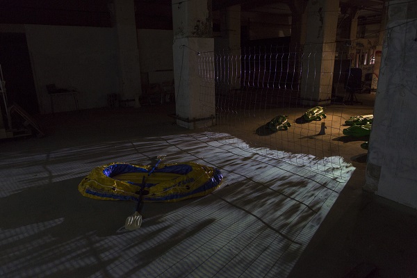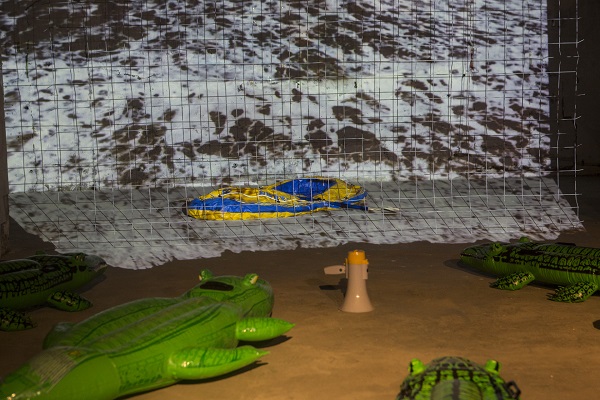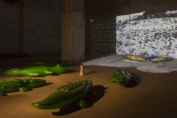 Vidéo, bande sonore, bateau pneumatique, 5 crocodiles gonflables, mégaphone, grille de protection de chantier