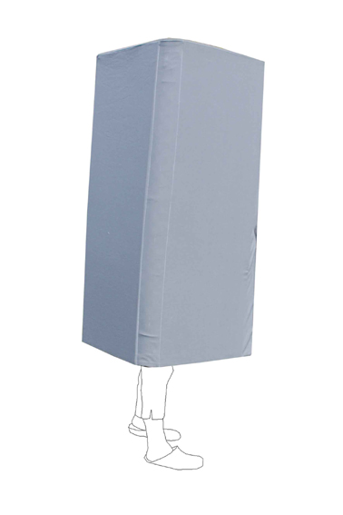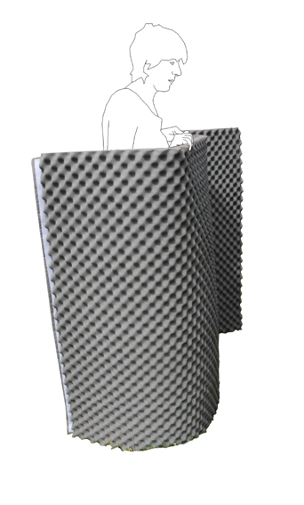 Ce sont des formes élémentaires constituées de 3 ou 4 pans rectangulaires. Les pans sont reliés entre eux et s’articulent ; à l’exception de deux pans qui restent indépendants. Ces derniers peuvent cependant s’accrocher entre eux grâce à un système de fixation ou s’accrocher à une autre forme (en constituant ainsi une nouvelle). Des poignées permettent de déplacer les formes aisément. L’intérieur est constitué d’un isolant phonique en mousse alvéolaire tandis que l’extérieur, en caméléon prend la couleur du sol. 10 modules (1 m x 2 m) sont créés par lieu d’accueil. Chaque nouvelle présentation implique un prolongement et une nouvelle adaptation tout en conservant les modules précédents. Ainsi une mémoire propre à l’œuvre se construit et ouvre par accumulation la possibilité d’un futur étouffement d’espace.