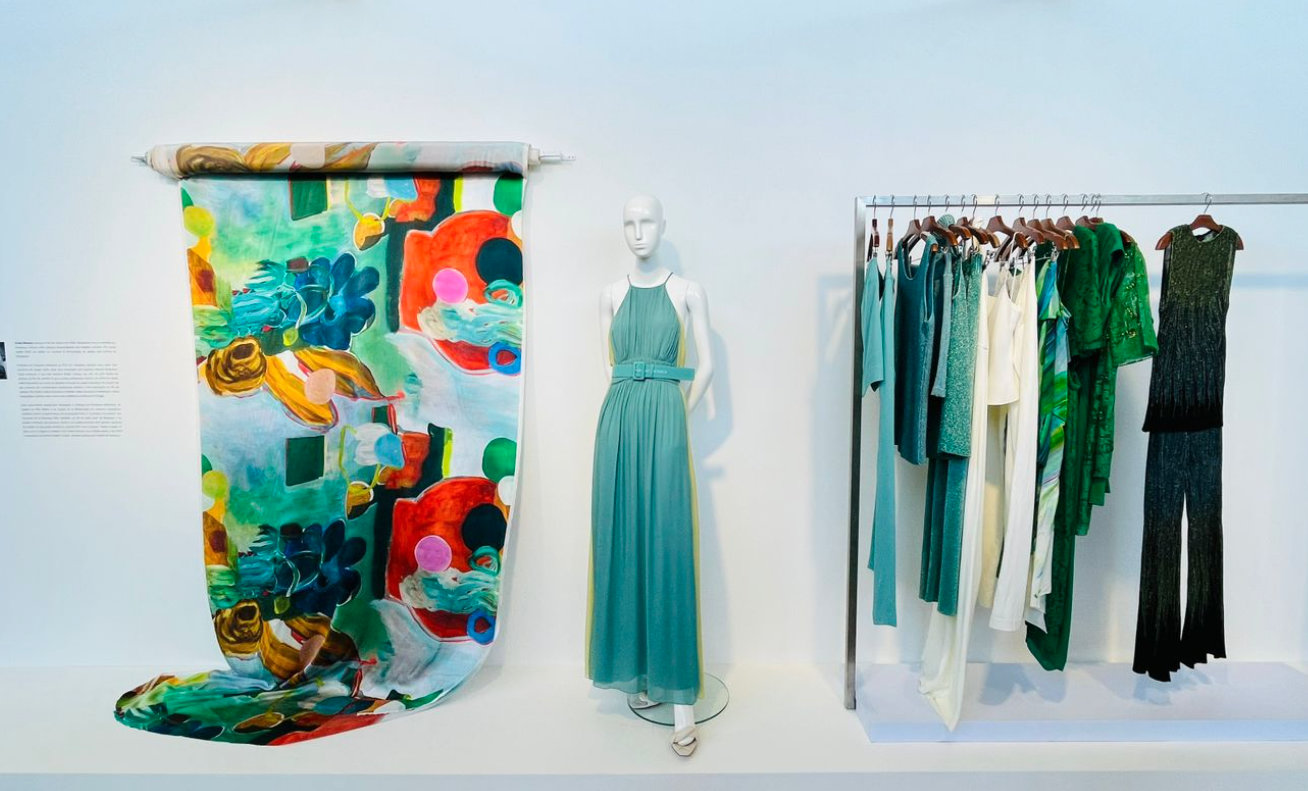 Vue du stand à la Soma Fashion Experience, présentation des tissus de la nouvelle collection été de la marque Animale, Rio de Janeiro (Brésil), 2023 A gauche : motif réalisé par Duda Moraes