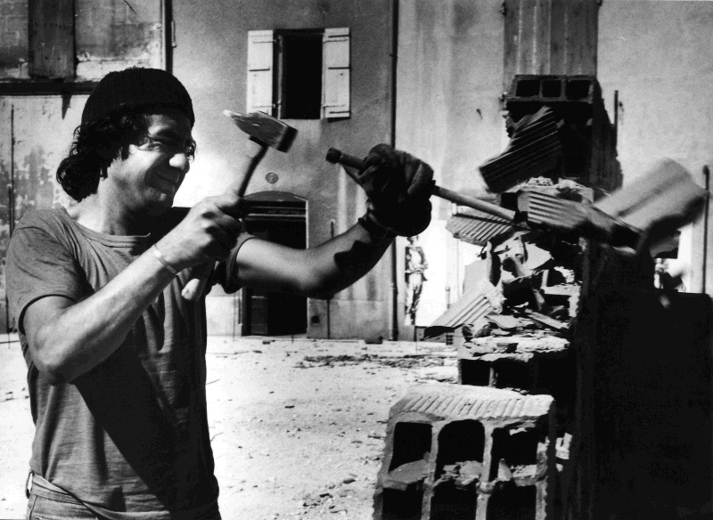 Les chantiers inachevés, 1978Construction pendant 6 jours puis déconstruction pendant 6 autres jours en septembre 1978 d’un mur de 20m de long et 2 m de haut sur la place Saint-Louis à PérigueuxCrédit photographique : droits réservés -