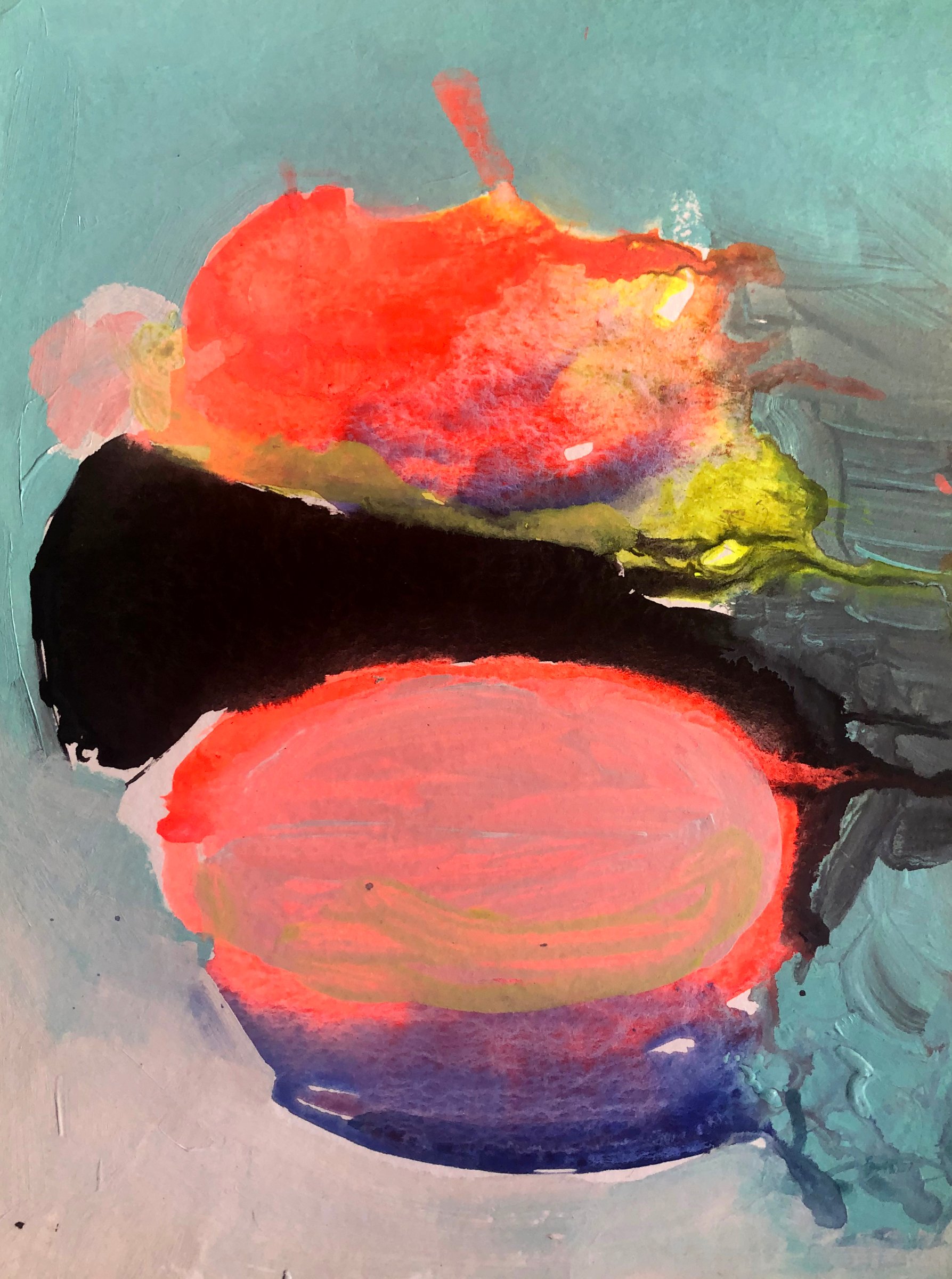 La série Poças — qui signifie « flacon d’eau » — explore les traces laissées par la couleur et l’eau. En utilisant l’acrylique diluée, les formes qu’elle présente sont comme des flaques qui se déploient librement, capturant un instant de vibration et de lumière.