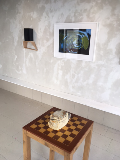 Florian de la Salle m’avait invité à créer une œuvre pour sa galerie l’Ananas Club. Cet échange a finalement donné lieu à une réalisation commune : Réaction (2015). Cette fois ci, j’ai invité Florian à me rejoindre à Venise pour exposer ses derniers travaux avec les miens. Rock, paper, color est née de ce croisement, les pierres, les couleurs et les papiers imprimés dessinant les contours, de notre nouvelle air de jeu. Bien sûr, le titre renvoie au fameux jeu d’enfant « Rock paper scissor » ou « Pierre papier ciseau » qu’on appelle aussi en italien « La morra cinese » ; cette danse des mains des cours de récréation est pratiquée dans presque tous les pays.