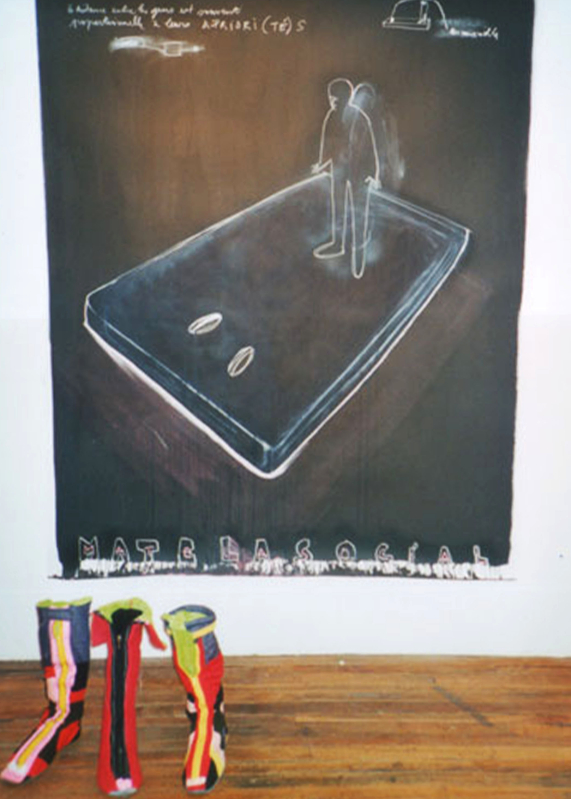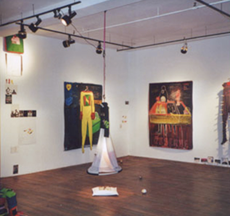 Installation réalisée en duo avec Delphine Herreria : tissus imprimés, bottes, costumes, peintures sur papier, dessins, collages, volumes...