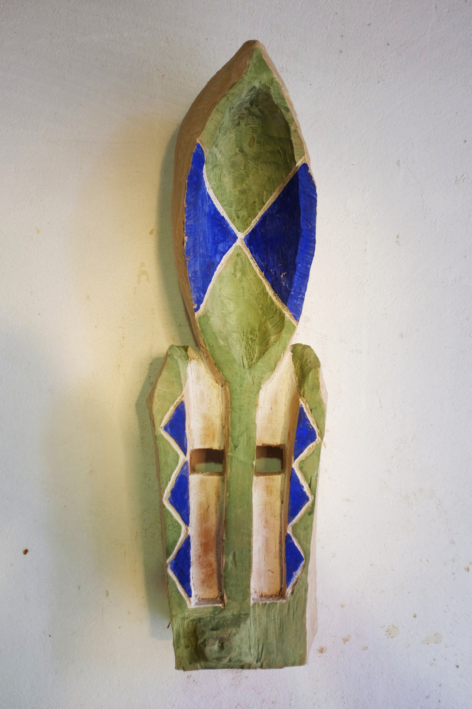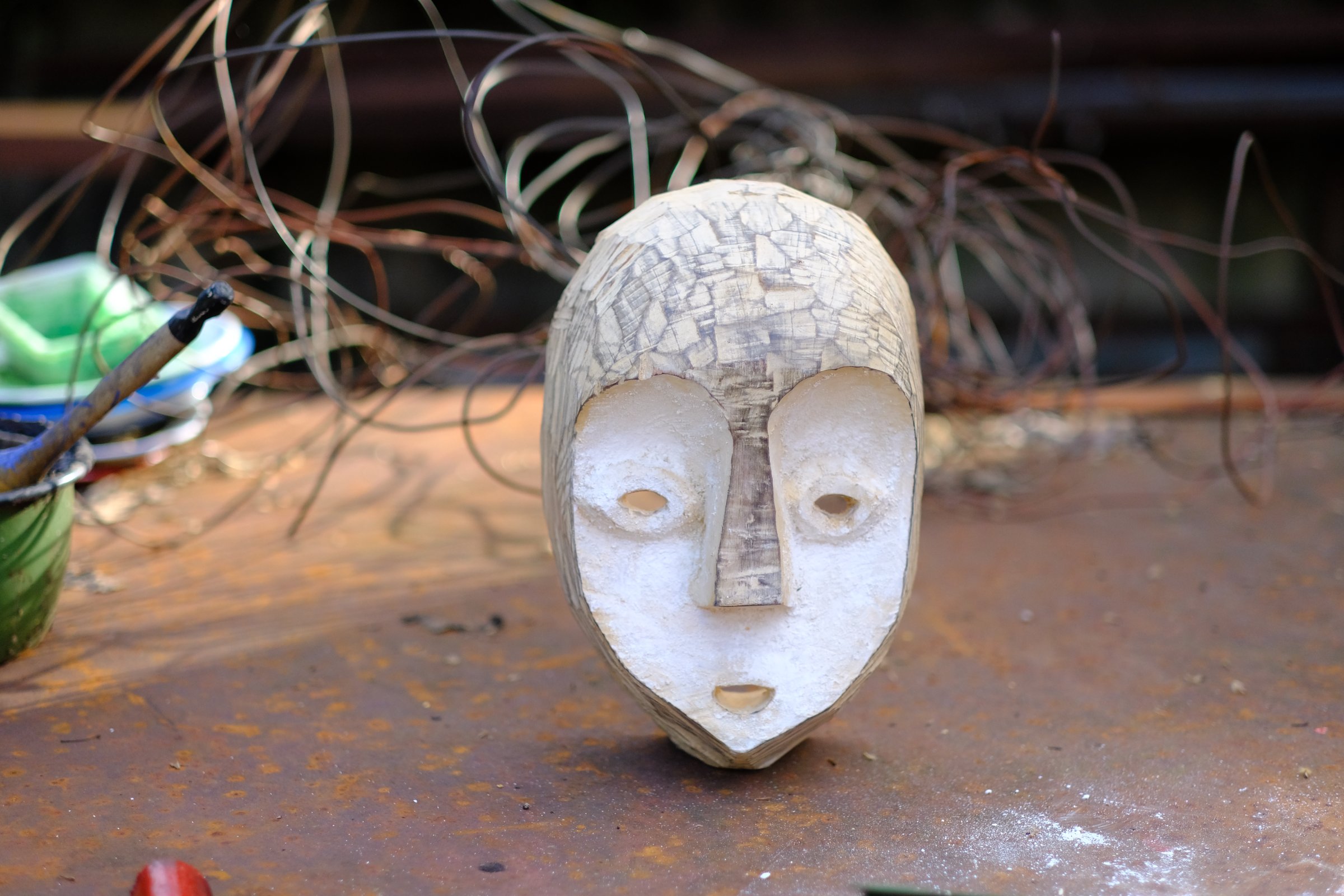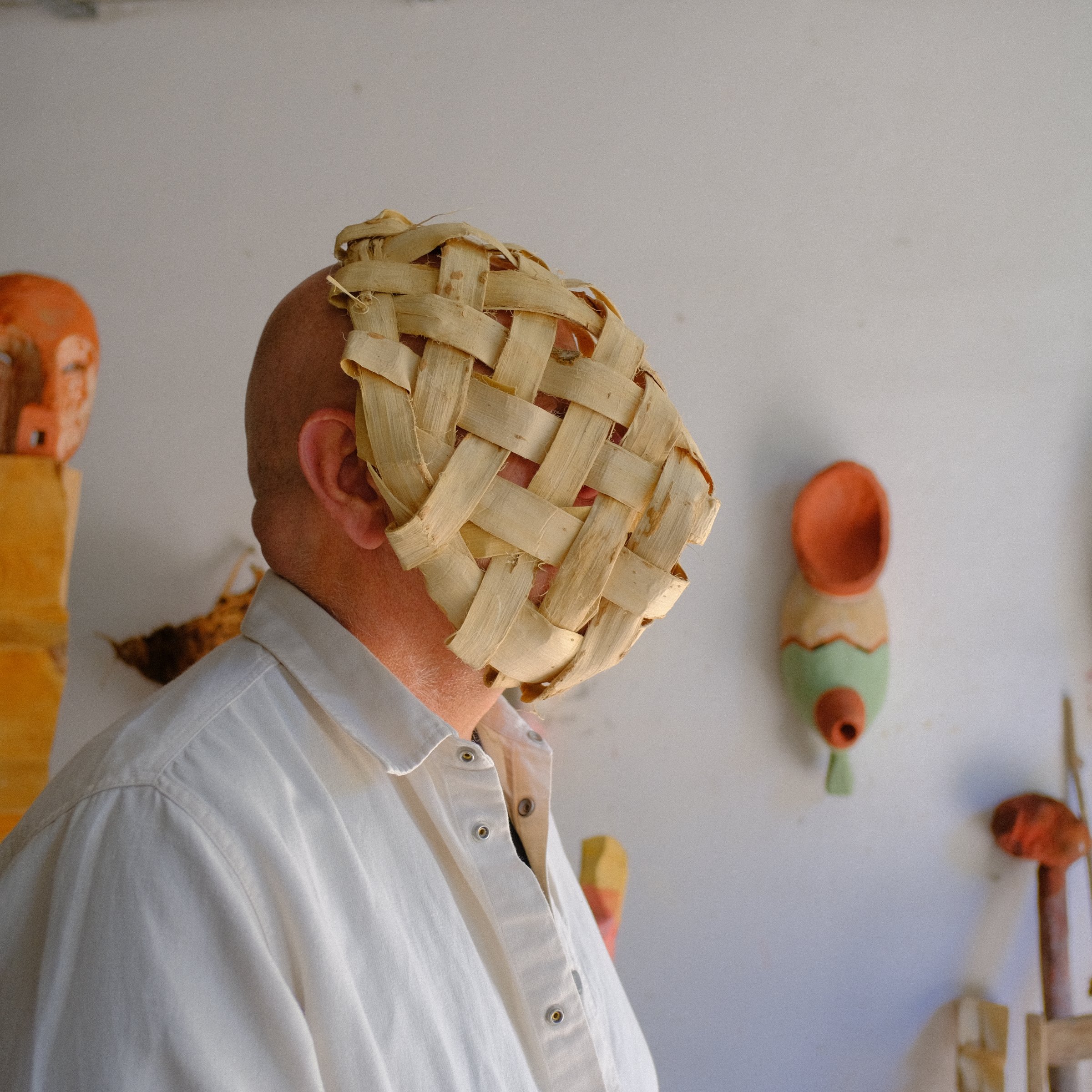 La production de masques est installée dans ma pratique depuis 2017. Autonomes, ces pièces peuvent être présentées sur des cimaises ou des socles, voire être portées. Elles sont également parfois associées à d’autres sculptures, qu’elles complètent (voir Téké (2025)) ou habitent (voir Les métamorphoses de Champey (2020)).