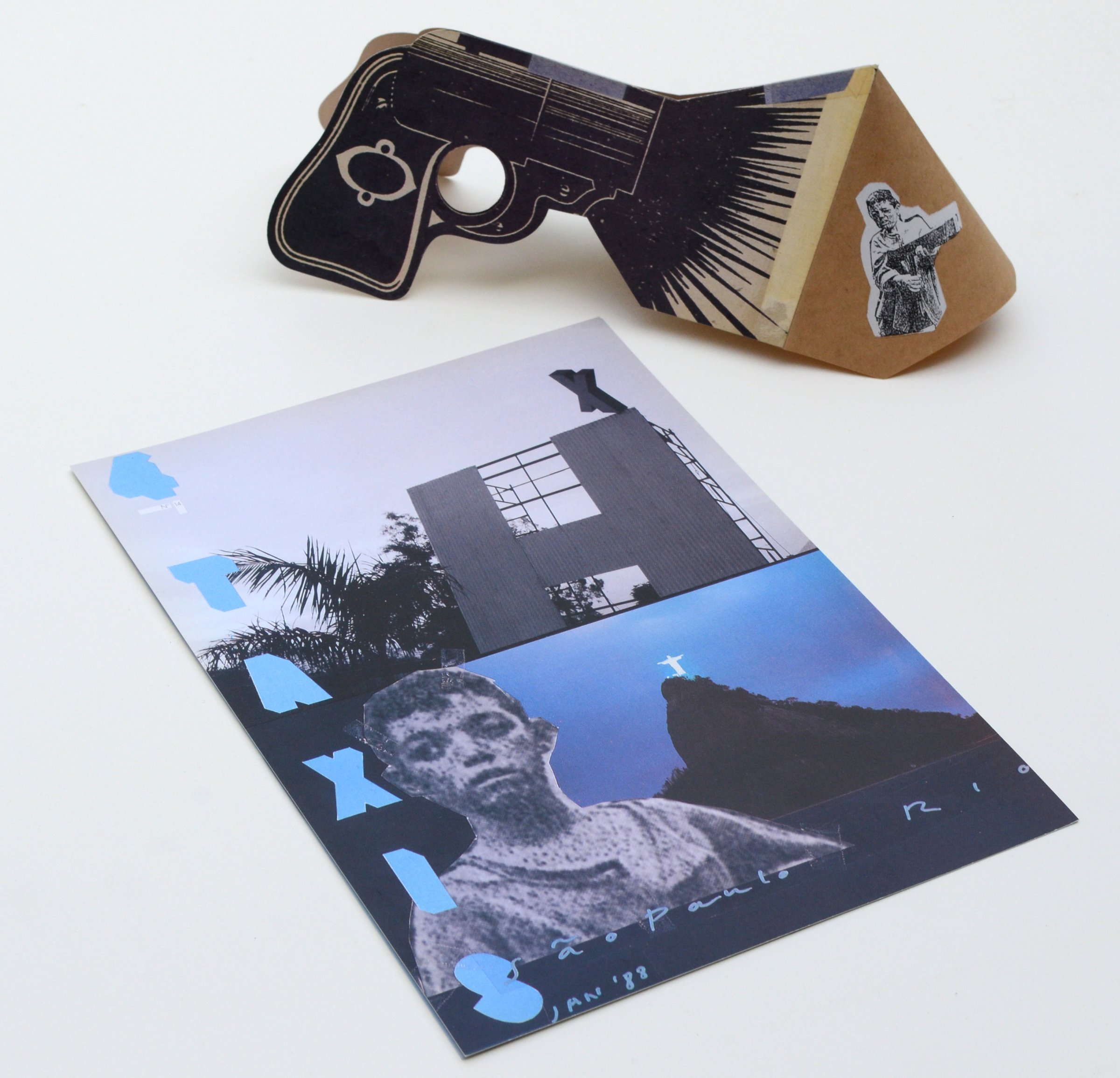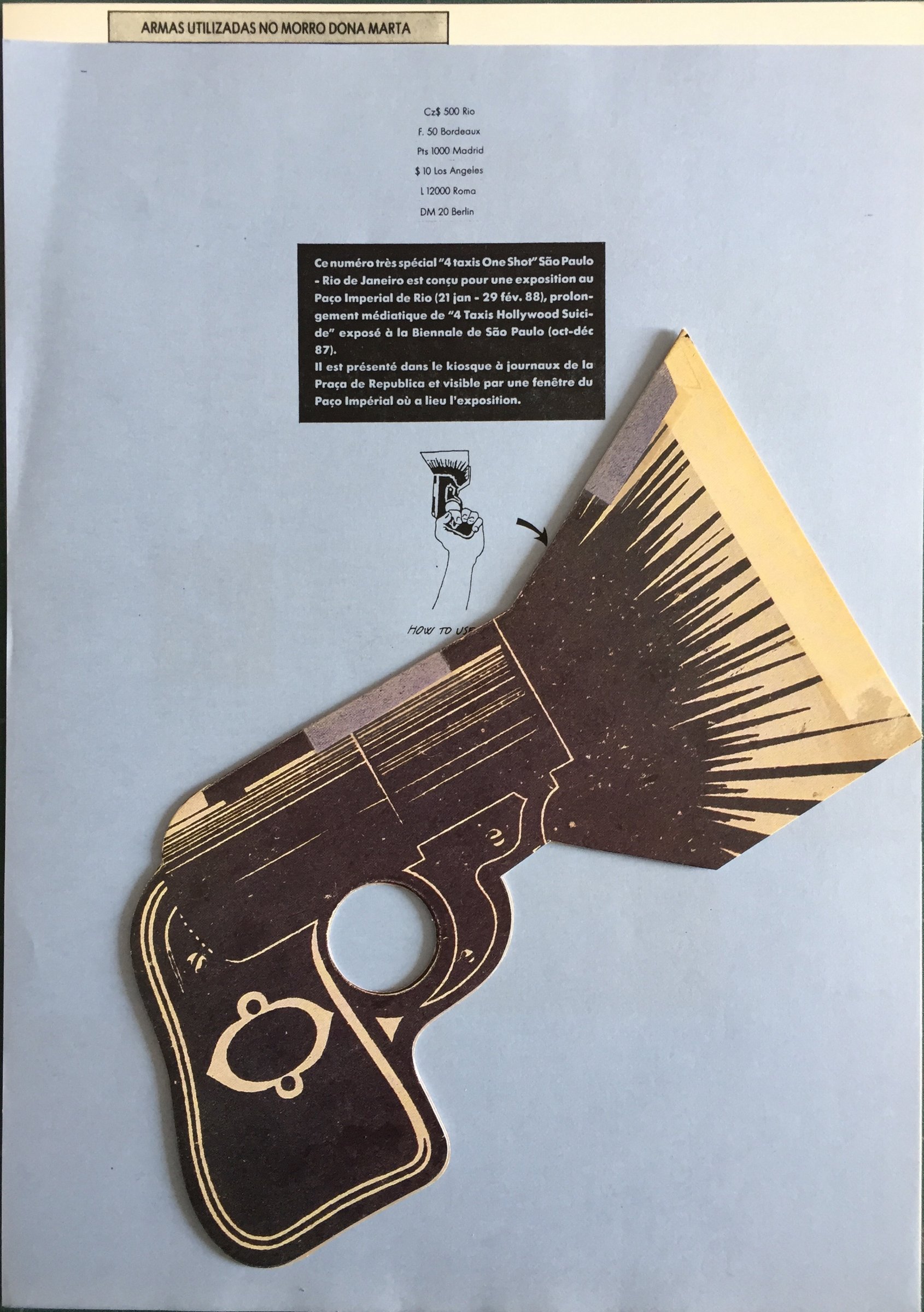 Suite à la participation de 4 Taxis à la Biennale de Sao Paulo, ce numéro – une feuille cartonnée imprimée recto verso accompagnée de l’édition d’un pistolet en carton sérigraphié conçu pour une exposition à Rio de Janeiro – relate l’histoire de l’installation 4 Taxis Hollywood Suicide à la biennale.