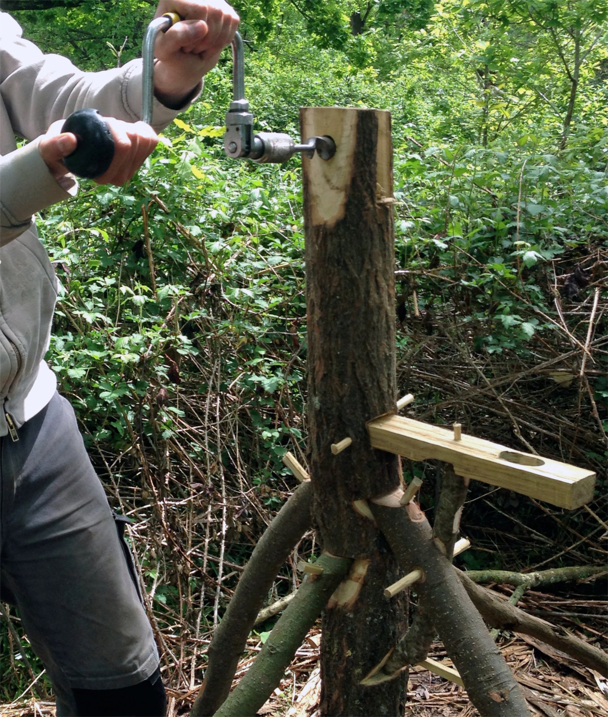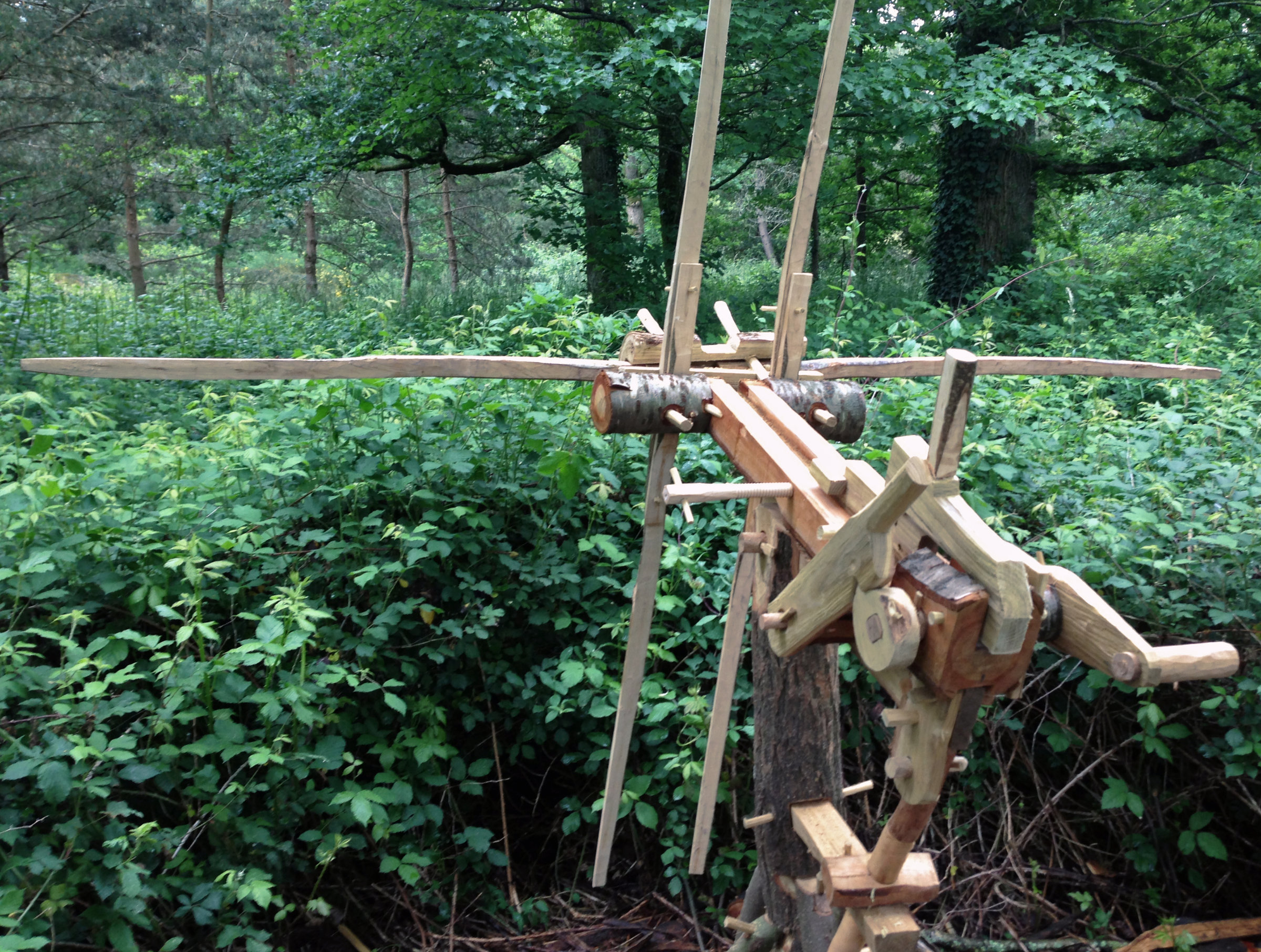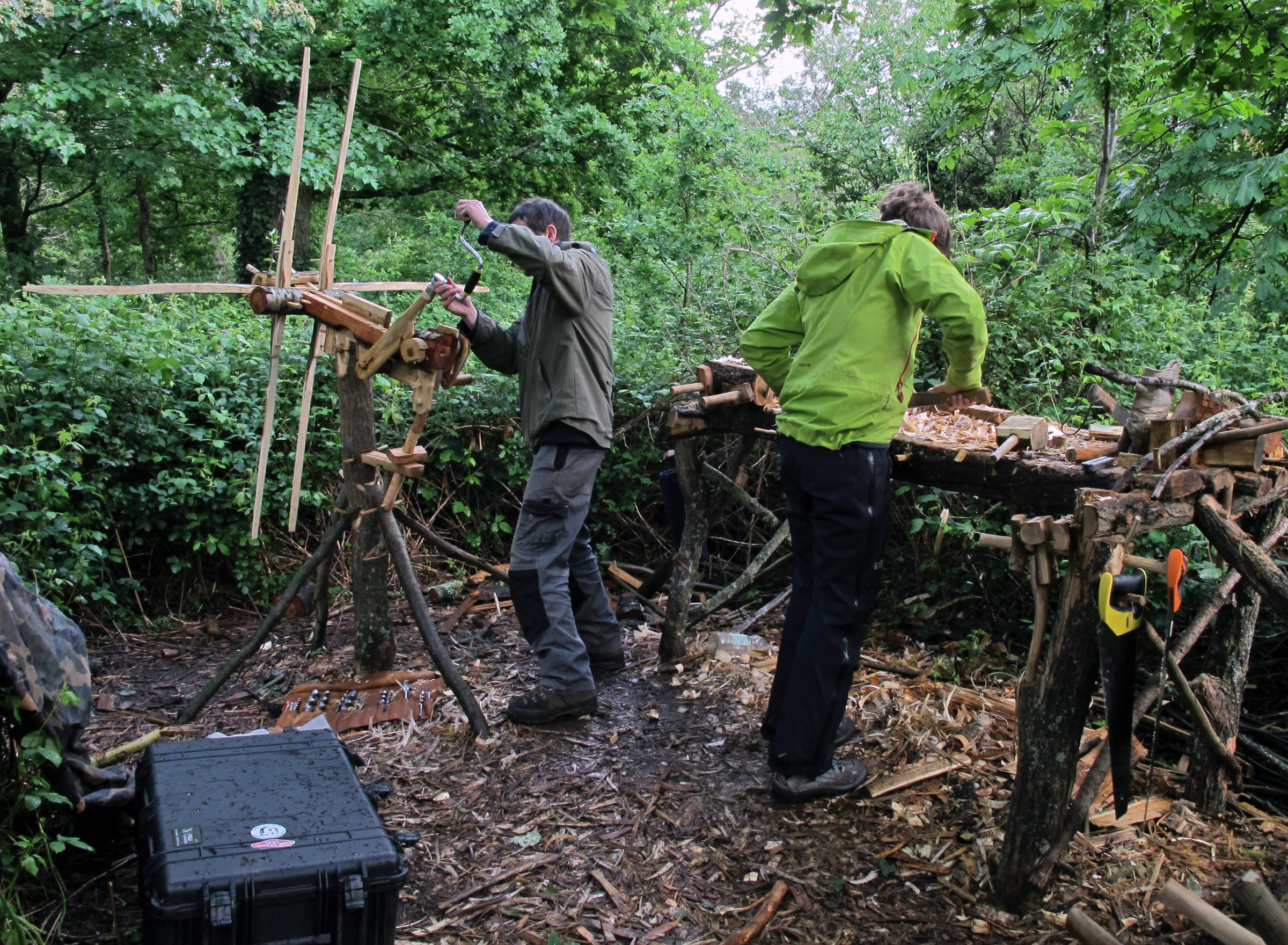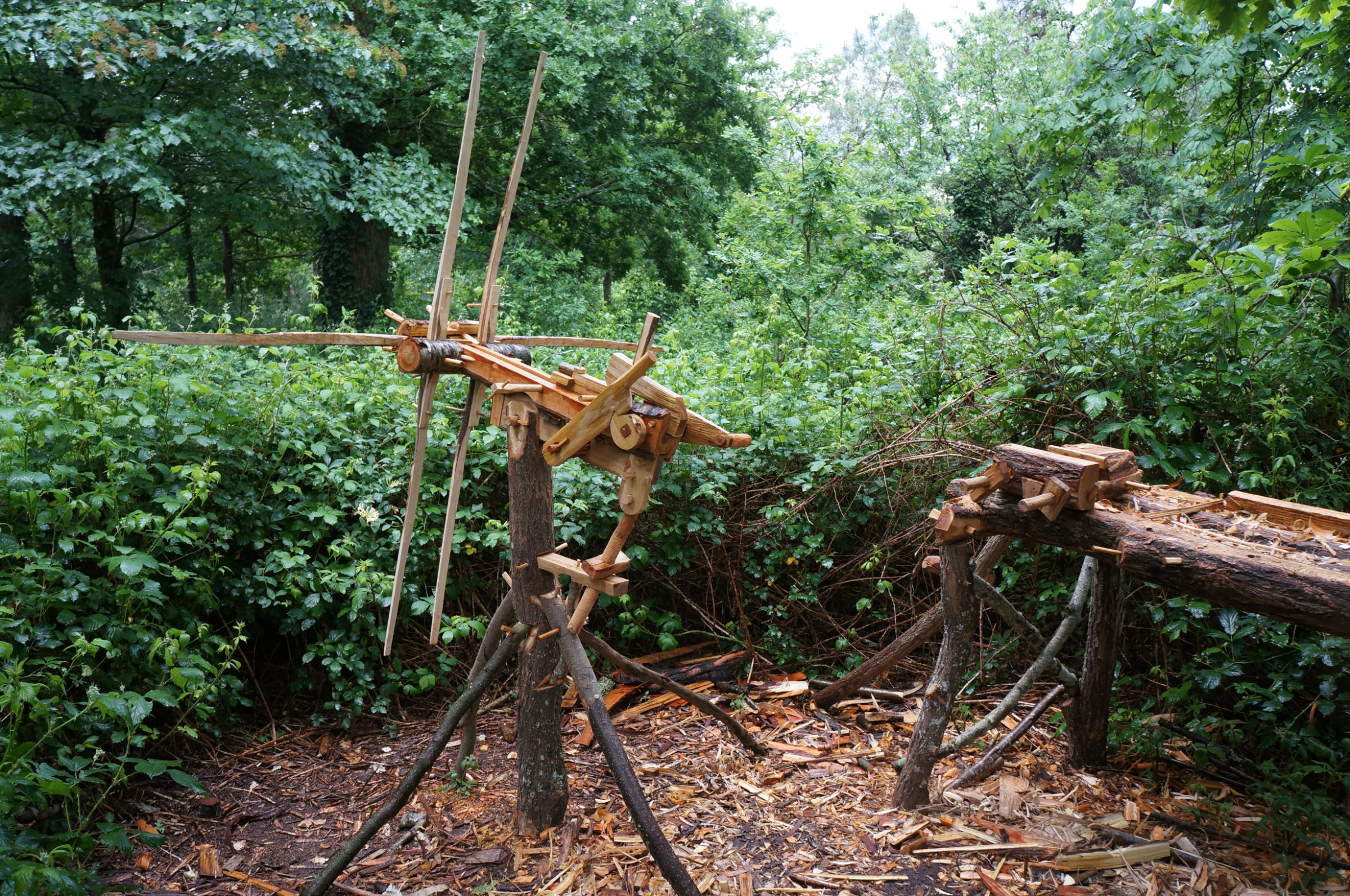 Déjouant à la fois la sémantique de l’ensauvagement et l’argument défensif, l’artiste a surtout éprouvé le besoin de faire une machine à partir de matériaux naturels. Ni clous, ni ficelle, ni vis… Lors de la fermeture, l’atelier, son mobilier et l’arme peuvent retourner à la forêt.