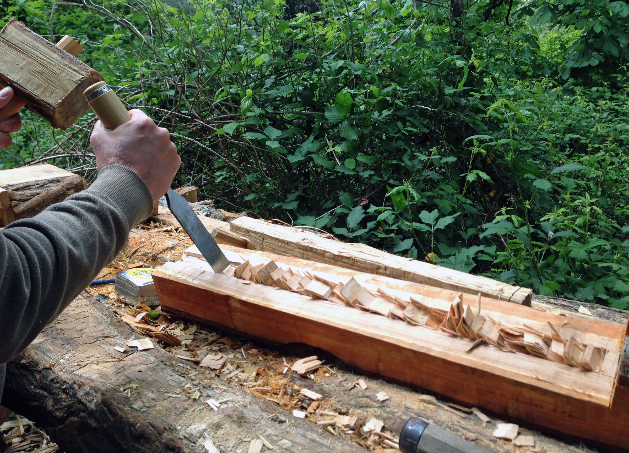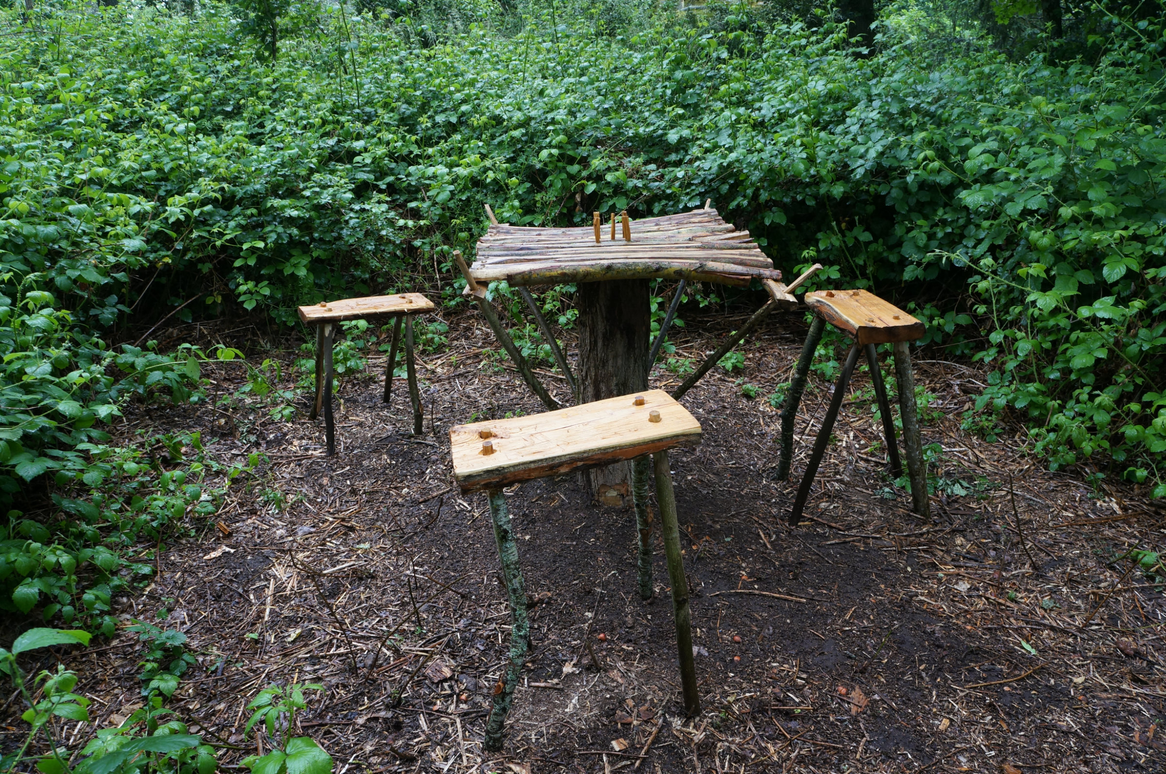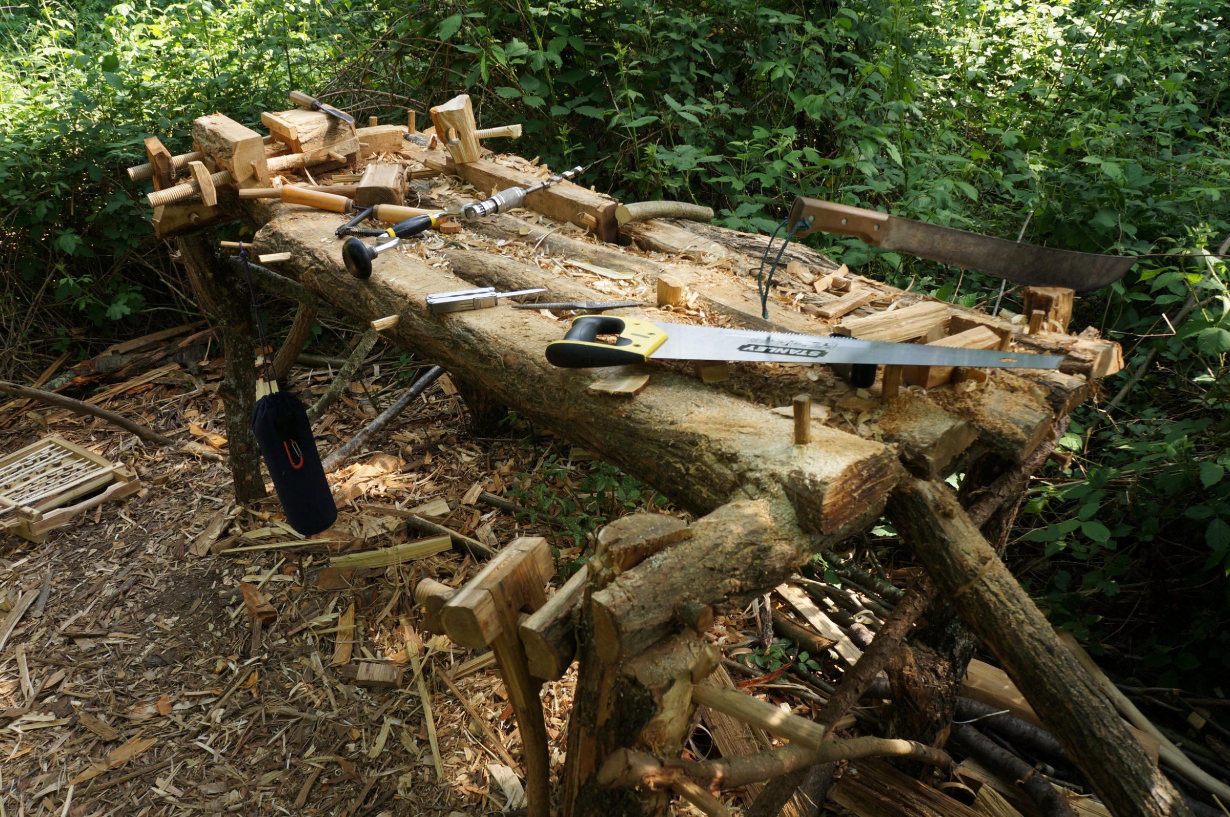 Sur l’ancienne terre de chasse des seigneurs de Clisson, un roncier s’offre comme l’idéal point d’appui. Machette en main, Laurent défriche d’abord le périmètre qui définit son atelier. Naturellement casematé et subtilement dissimulé, l’espace se meuble d’abord de l’indispensable : un établi construit avec les matériaux provenant de son environnement direct, le bois d’un robinier et d’un merisier couchés sur le sol.