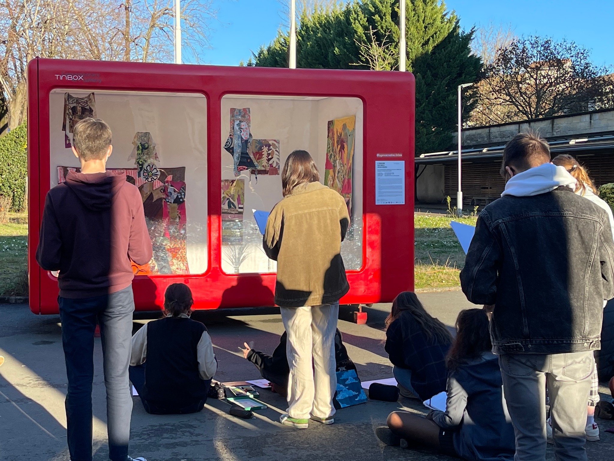 Dans le cadre de l’atelier Floraison, le travail des élèves de terminale option arts plastiques s’est porté sur la mise en place d’un commissariat d’exposition et sur l’ensemble des missions liées à la préparation d’une exposition. Ce projet a été présenté dans la Galerie Tinbox Mobile #5, sur trois sites. L’exposition a été pensée autour d’un dialogue entre des œuvres de Duda Moraes et Joachim Mogarra (Bouquet Perpétuel (1988), œuvre de la collection du Frac Nouvelle-Aquitaine Méca).