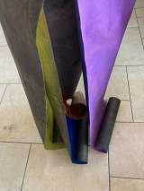 Radmila Dapic Jovandic réalise des peintures géométriques abstraites. Elles répondent à un travail de composition réalisé à la gouache. Deux techniques distinctes sont utilisées pour obtenir un effet « patchwork » : le pliage et l’assemblage au moyen de la couture. Suspendus ou accrochés au mur, posés au sol ou à cheval entre sol et mur, ces objets sont mouvants, tant du point de vue de leur forme, de leur superficie que de leur positionnement dans l’espace.