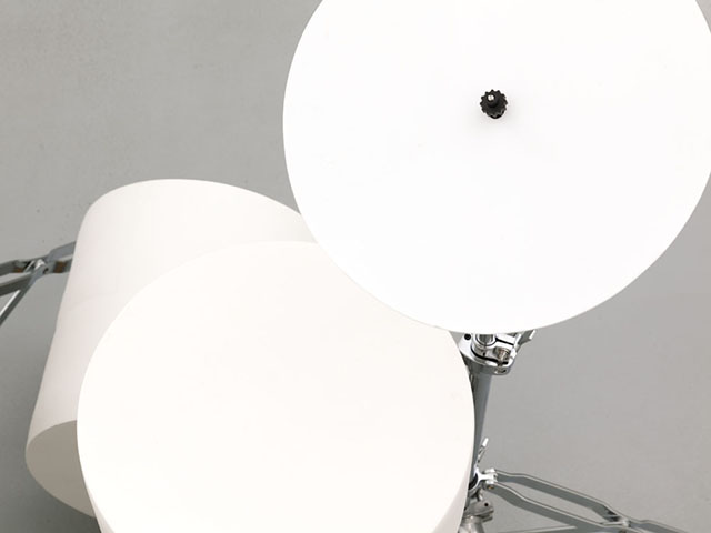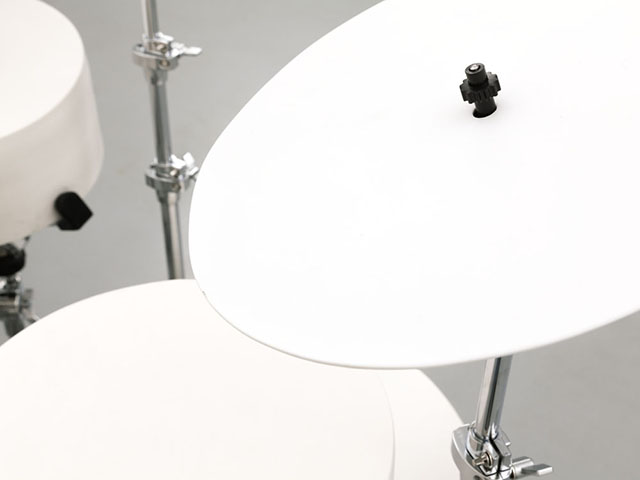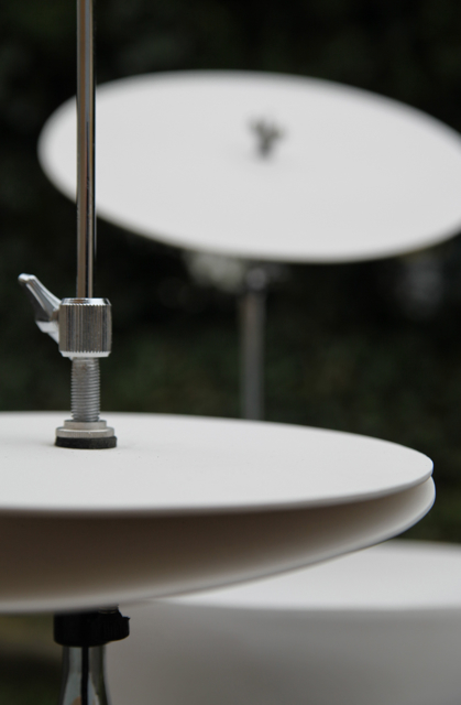 Une batterie comportant un certain nombre de fûts et de cymbales, de formes et de sons différents, fonction de leurs formats et cuissons. Première étape de la recherche : enraciné dans les épisodes précédents de mon travail sonore, notamment la table musicale de Conférence Concertante, la Table de ping-pong en verre, des cymbales en grès réalisées pendant le premier semestre etc. Entre chaque occurrence, les instruments sont améliorés par Marjorie Thébault et les étudiant.e.s impliqués, selon nos observations.