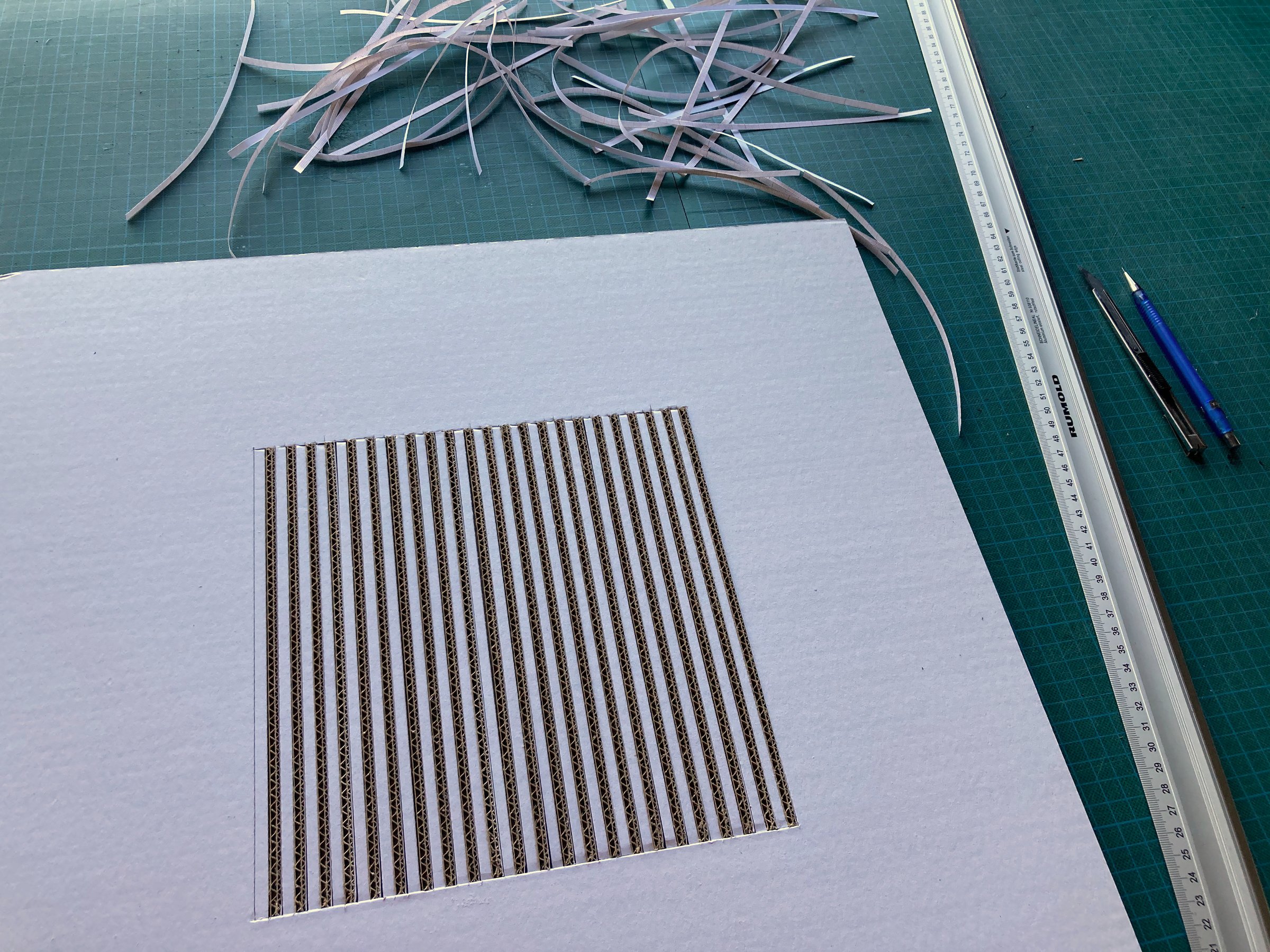 Le papier en surface du carton est retiré à différentes profondeurs et laisse visible des cannelures au motif varié. Les bandes de papier sont ensuite retournées et remplacées par du papier ou des des photographies. Divers effets sont possibles à partir de cette technique.