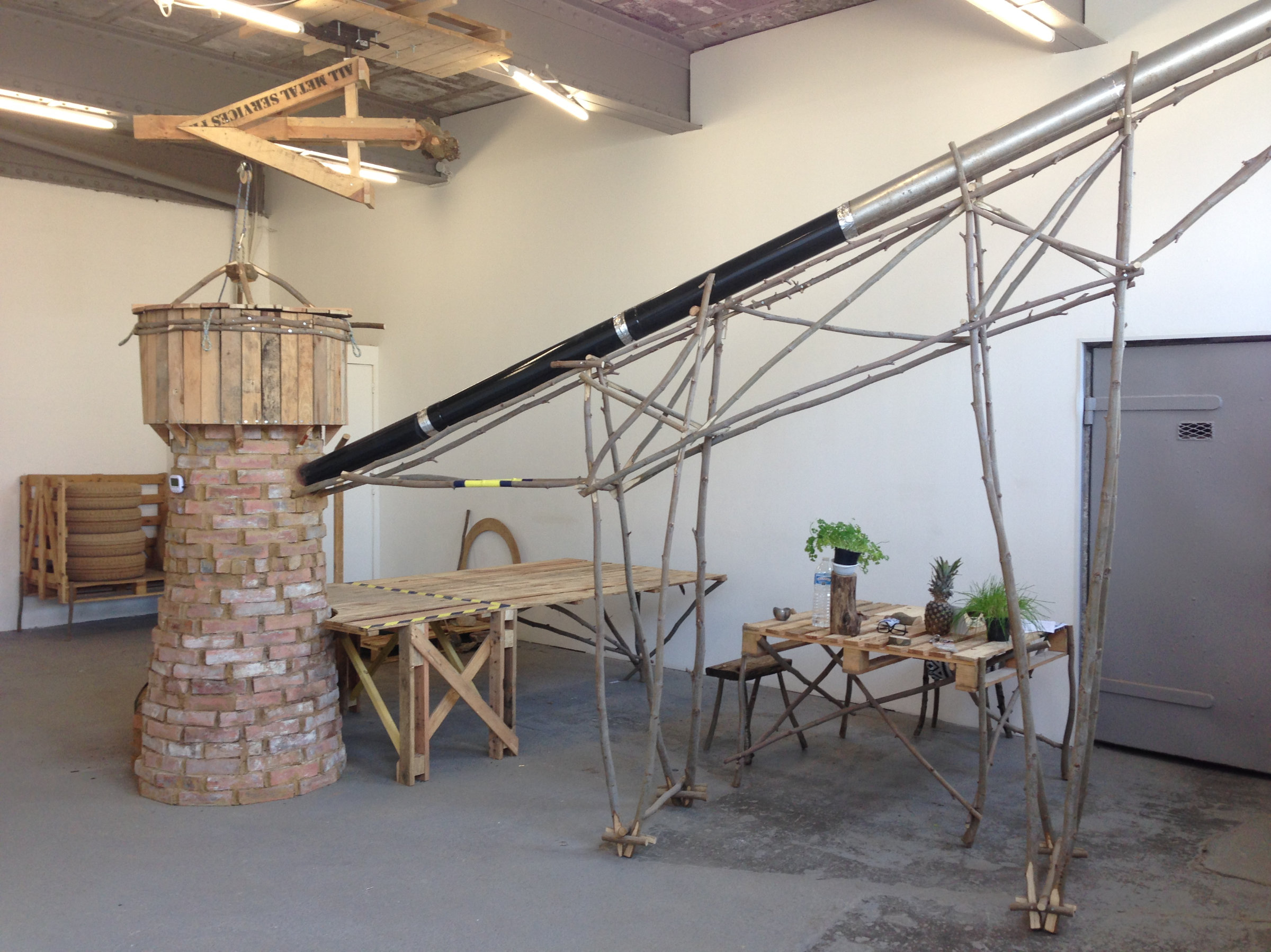 L’usine prend forme petit à petit, s’organisant autour du foyer central, générateur de chaleur pour l’étuve destinée au séchage des pneus. Elle s’équipe progressivement en outils et en mobiliers de travail et de détente : plateforme de production, bureau, salle de repos, meuble de stockage convertible en canapé, machine à spaghettis.