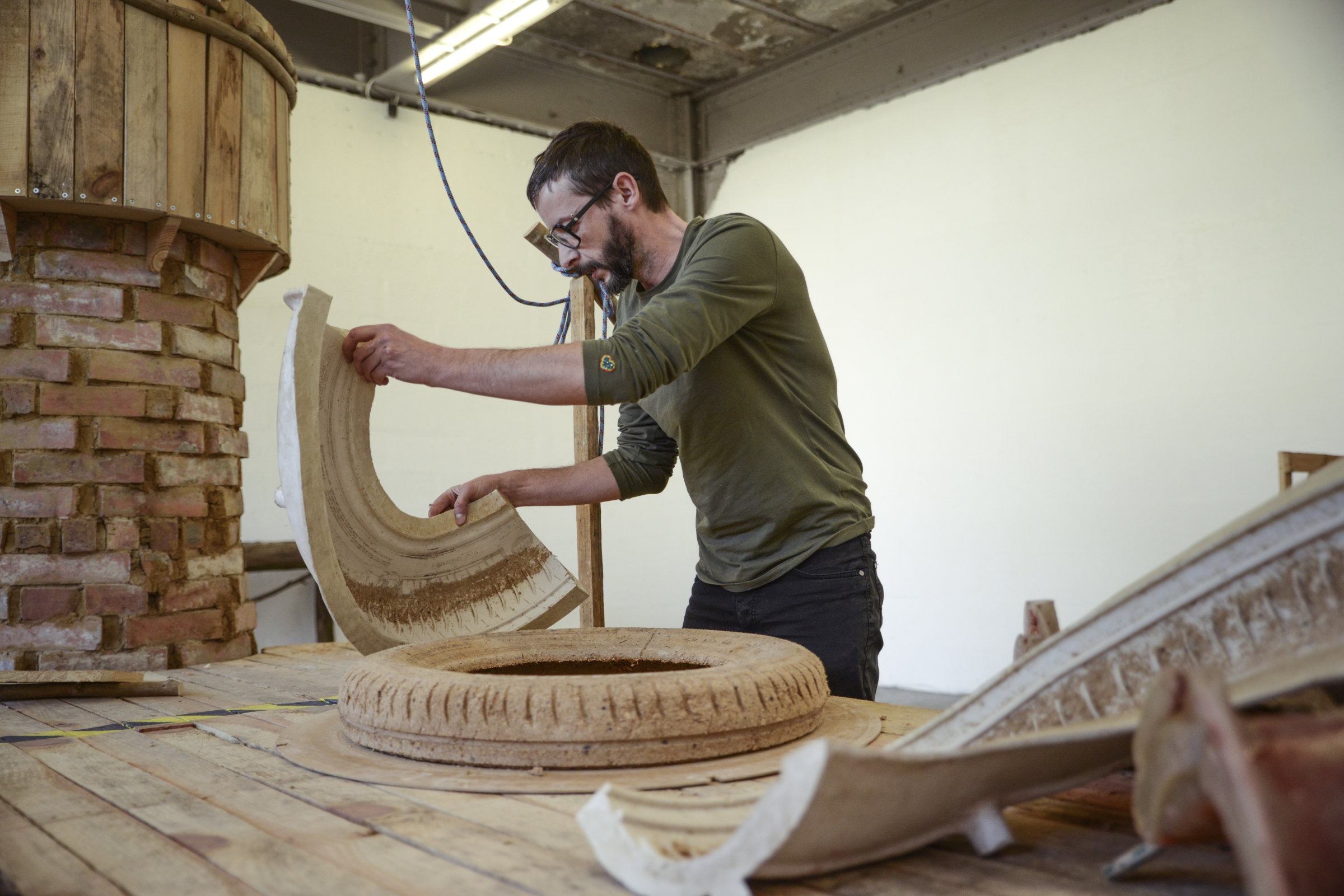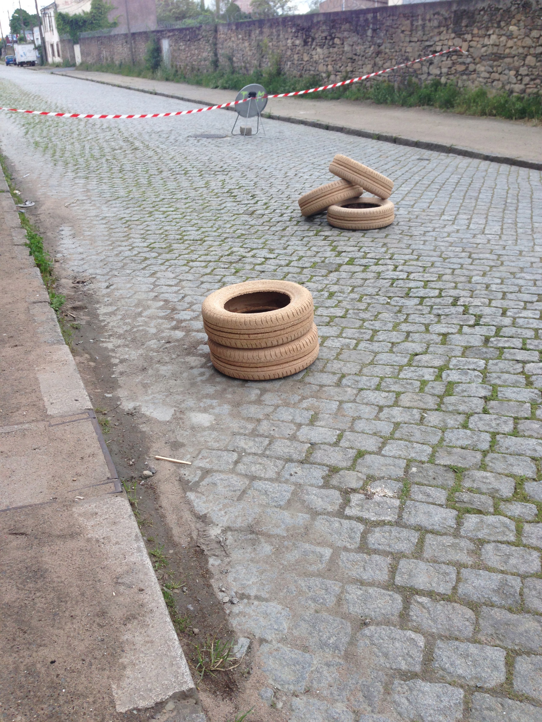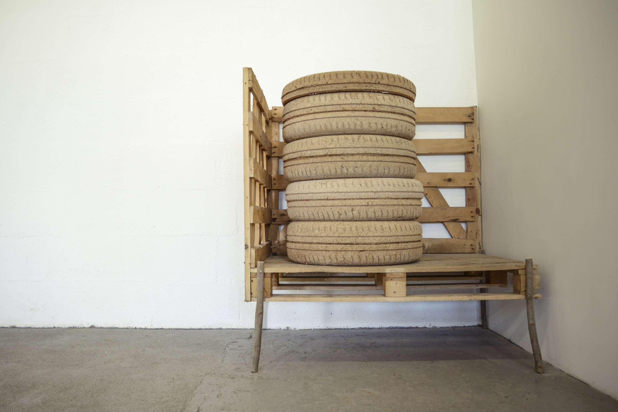 La protohistoire de l’exposition se profile à Nantes entre 2013 et 2014. D’expérimentations en périodes d’incubation, Laurent Tixador devient chimiste. Il cherche, trie, classe, échantillonne et attend. Jusqu’à la mise au point de son pneu éco‑certifié : des copeaux et de la sciure de bois, du papier kraft forment un aggloméré destiné à être moulé. Le pneu obtenu ne produit pas de fumée noire durant sa combustion.