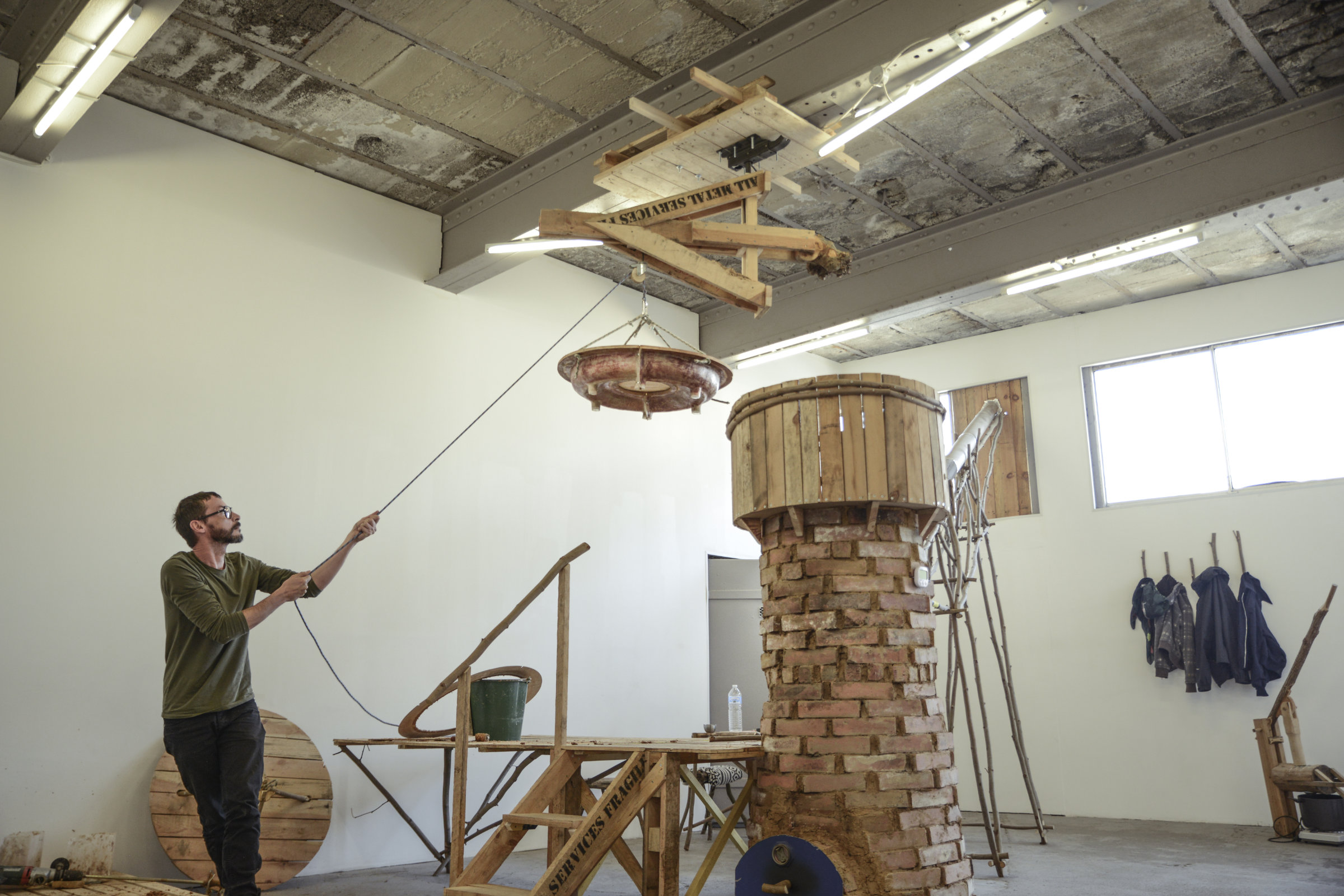 Tout est fabriqué sur place, en fonction des opportunités. Seul l’établi est un élément de réemploi issu d’une mission de sauvetage. Sa présence se justifie pleinement dans la généalogie symbolique de Florange : construit en bois de robinier, il a été extirpé de la mise sous cloche d’un environnement devenu intolérant au climat artistique.
