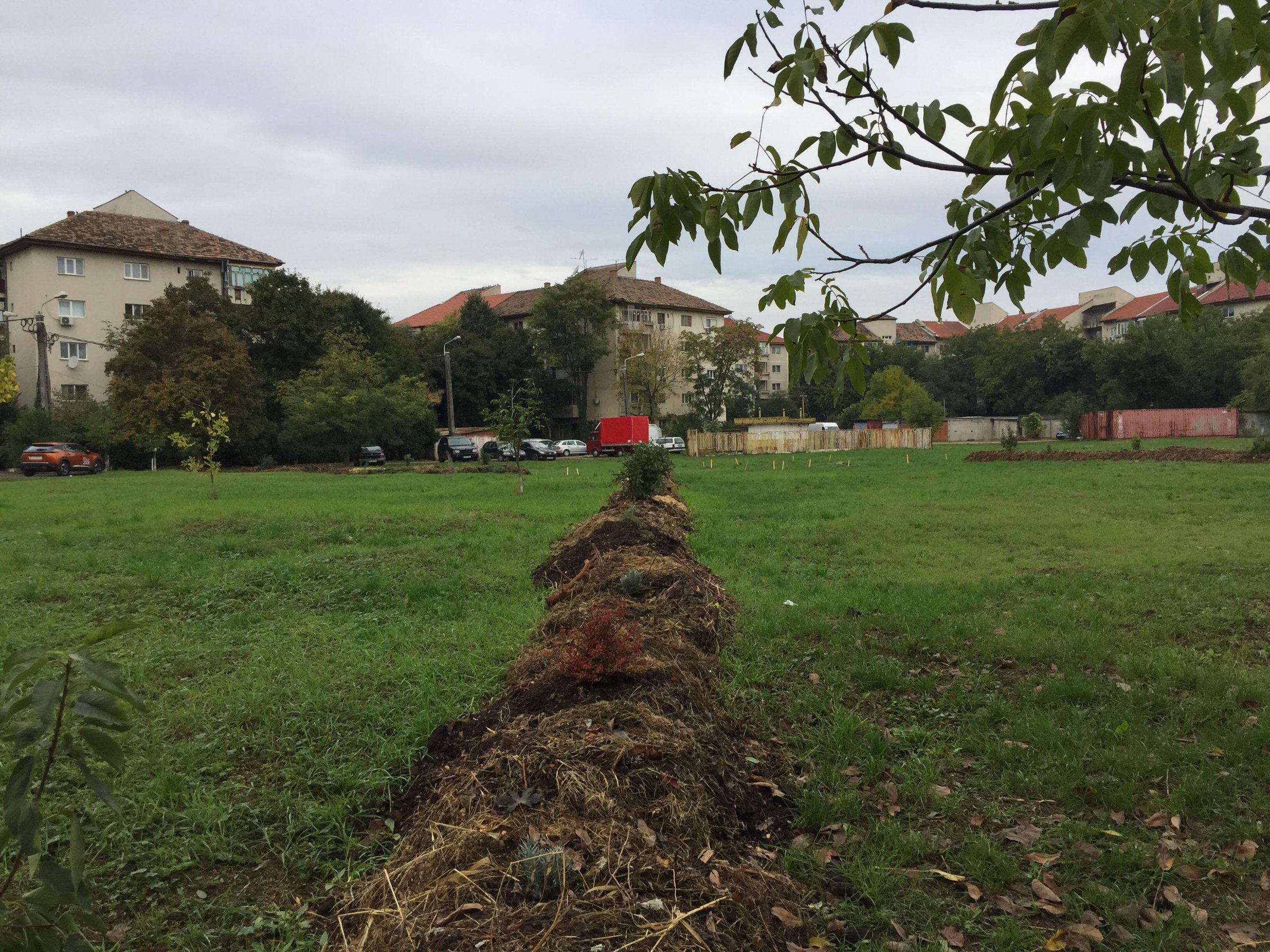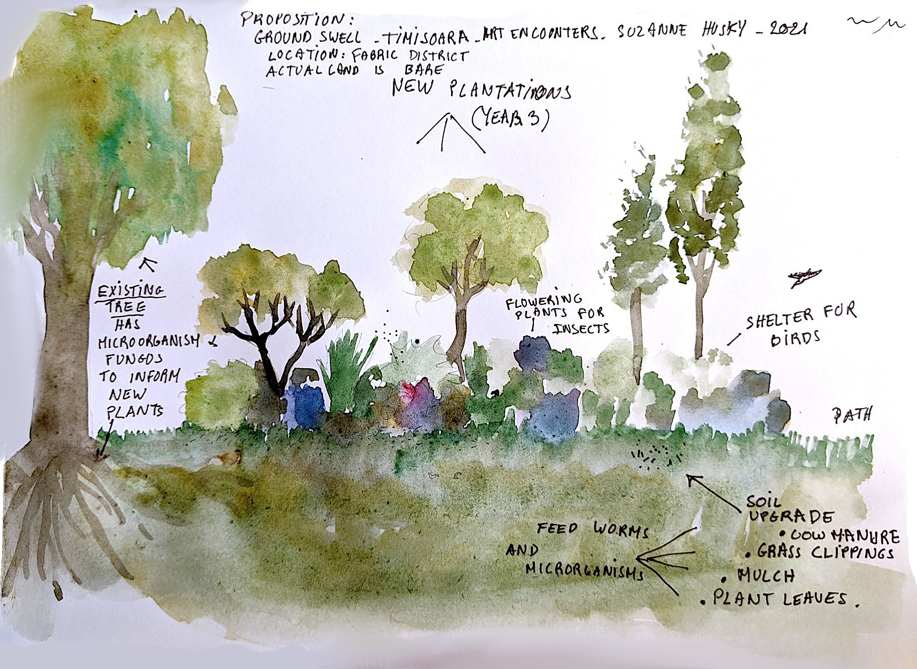 Sous terre, le sol est régénéré par l’apport de tontes de gazon, de vieux fumier, de feuilles et de paillis plusieurs mois avant la biennale afin que les processus naturels de décomposition ou de fermentation puissent être activés. Puis une ligne continue d’arbres, d’arbustes et de plantes vivaces est plantée pour relier les arbres déjà présents. Ce dispositif a pour objectif de favoriser la création d’un corridor mycélien : les réseaux de champignons qui vivent sous les arbres établis peuvent ainsi se déployer et soutenir l’adaptation des nouvelles plantations dans ce sol transformé.