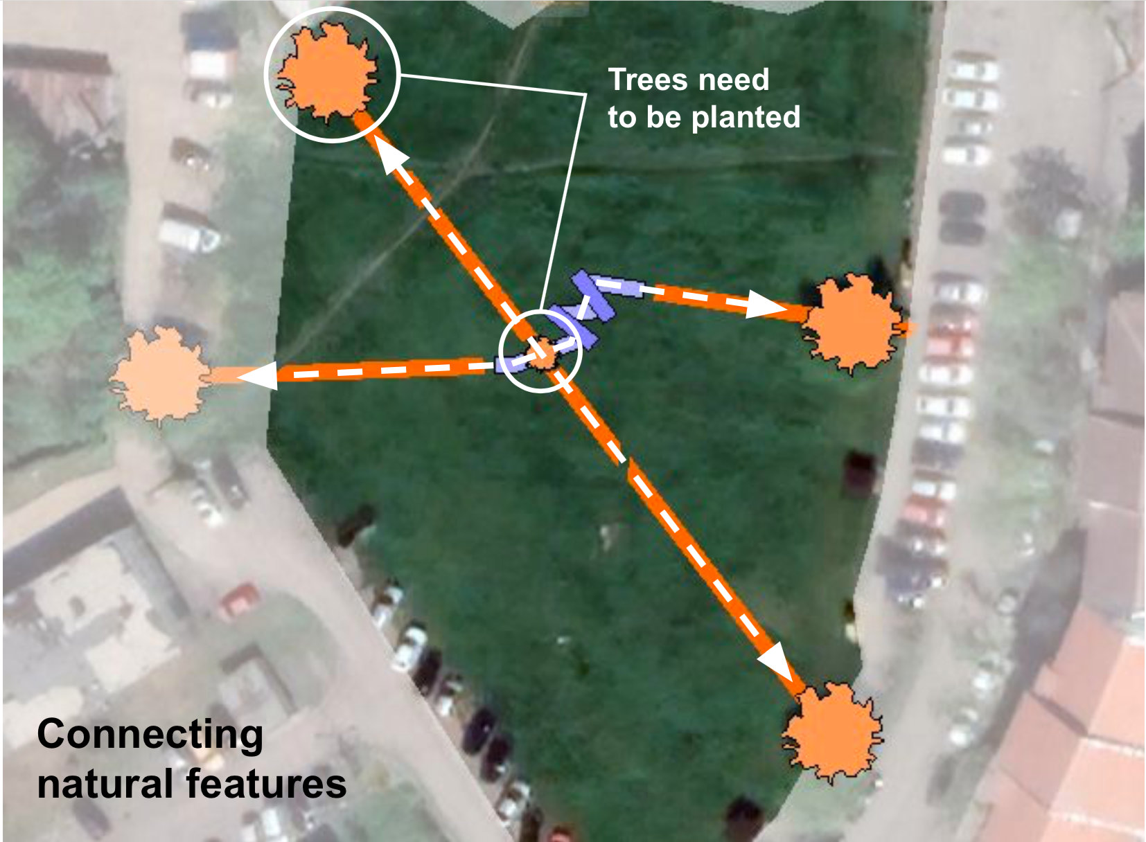 L’espace urbain du parc du Fabric District est imberbe et tondu, le sol a été bâti, puis remblayé, et terrassé. Avec Groundswell, nous installons deux corridors de vie — l’un souterrain, l’autre en surface — qui se déploient entre les arbres périphériques existants.