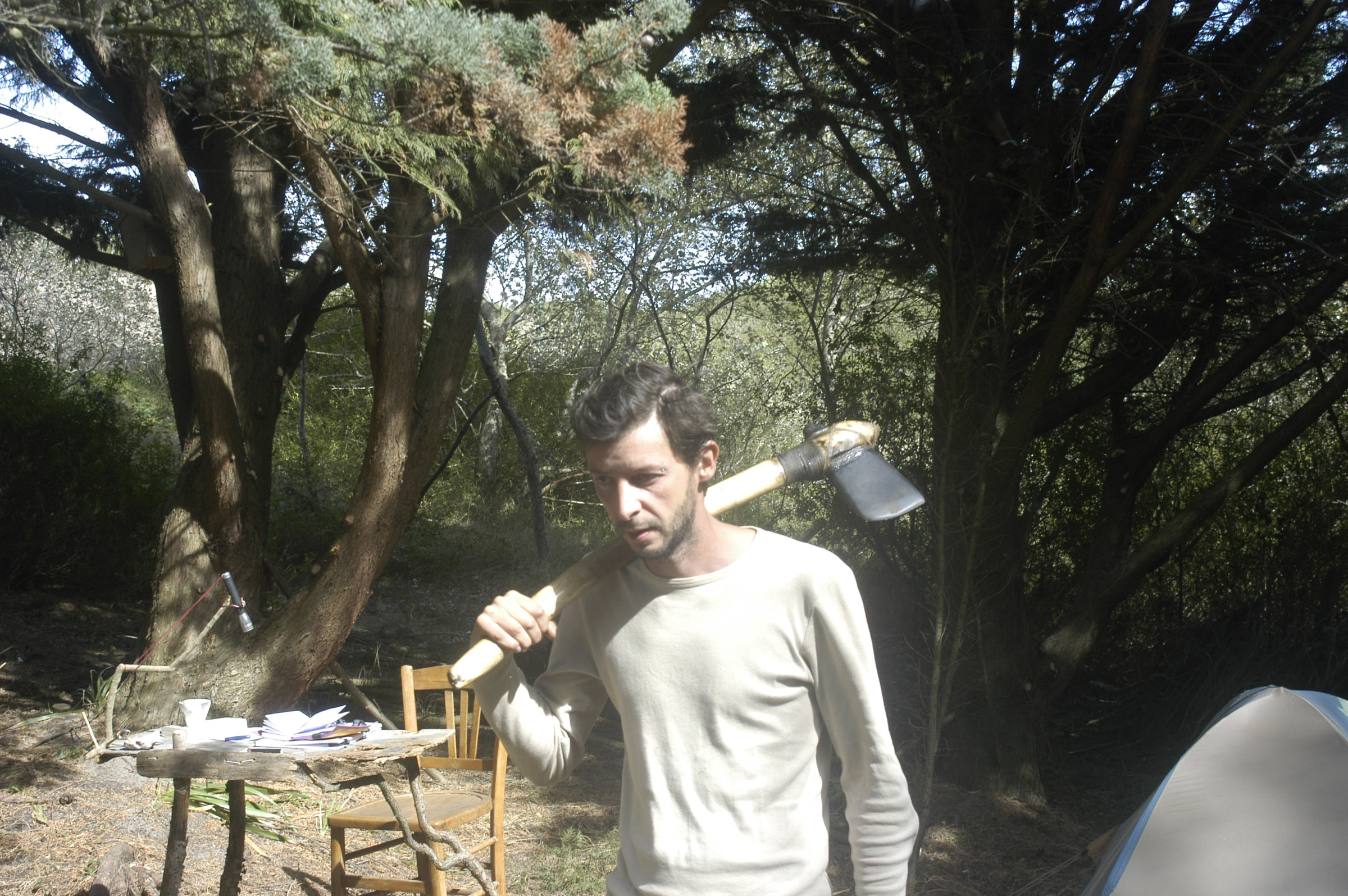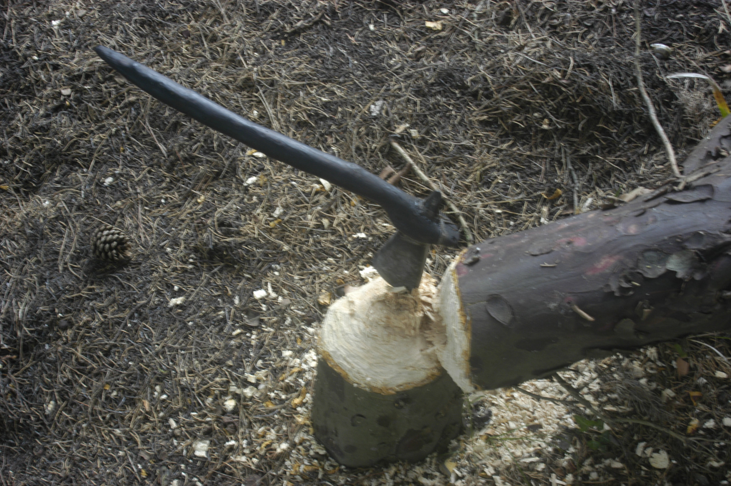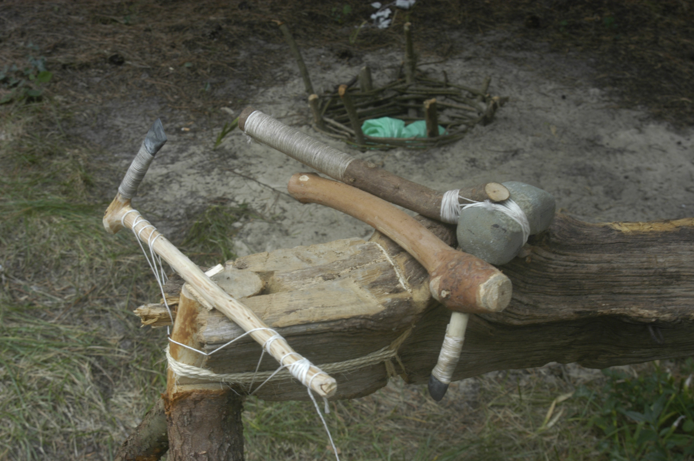 Il faut commencer par ramasser un galet. On doit ensuite consacrer trois ou quatre journées à le polir afin de lui donner du tranchant. Quand on est satisfait, on peut couper une branche avec, l’emmancher pour en faire une hache puis couper un arbre.