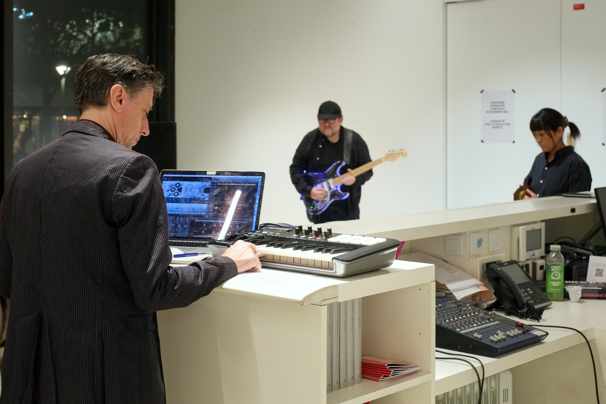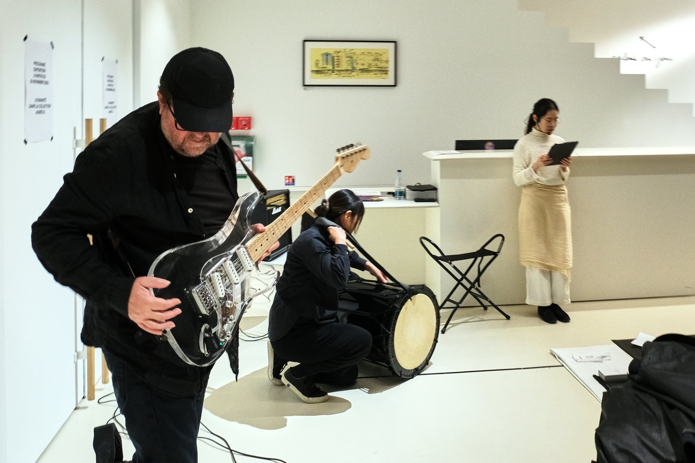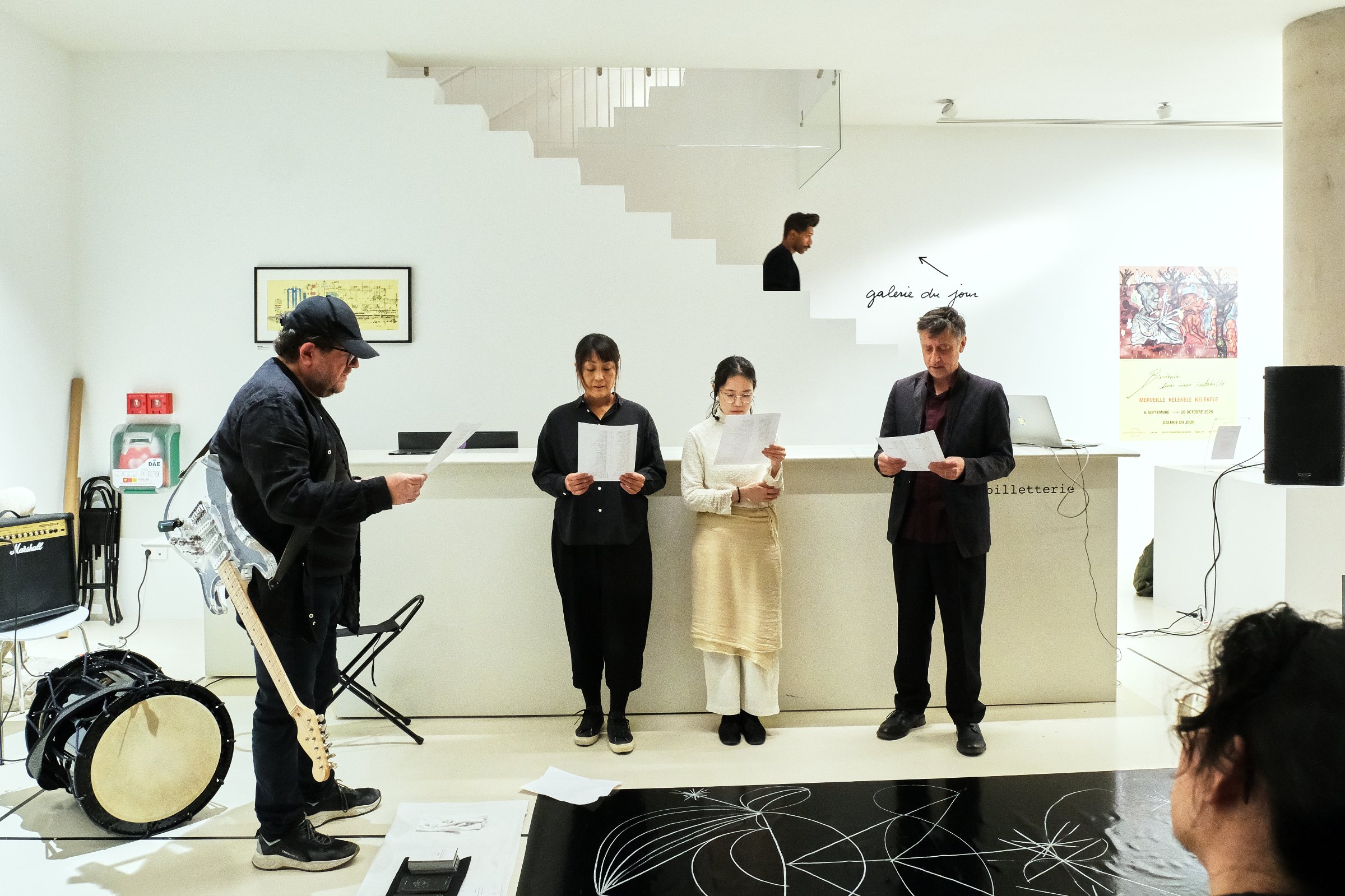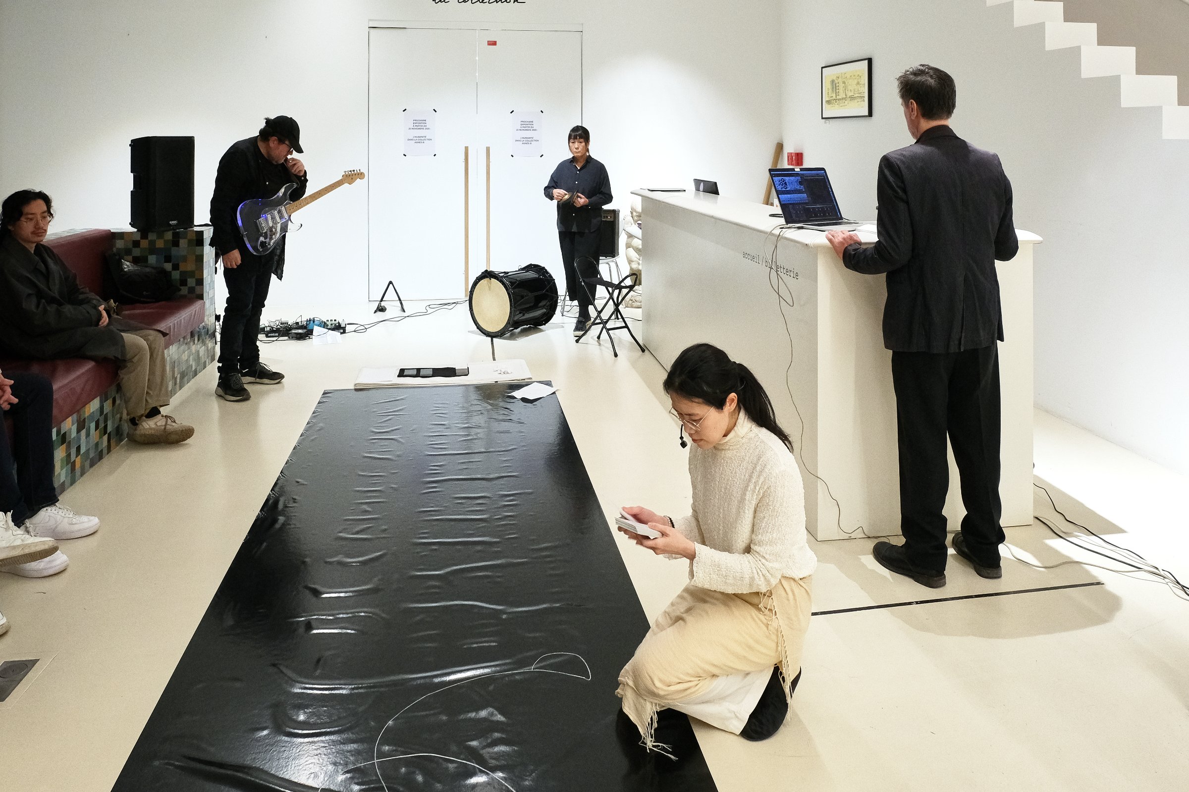 Performance musicale du collectif AO (Frédéric Desmesure, Éric Heim, Nori Kajio, Hsin-Yun Tsai) Vue de la performance à La Fab. librairie du jour agnès b., Paris, octobre 2025