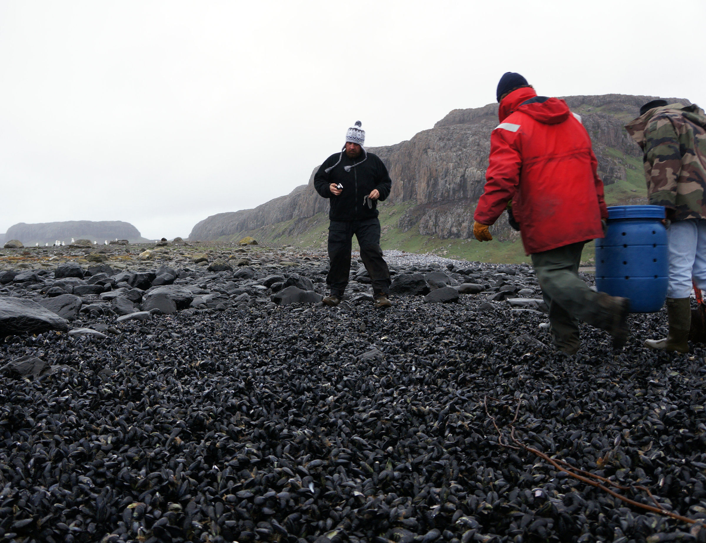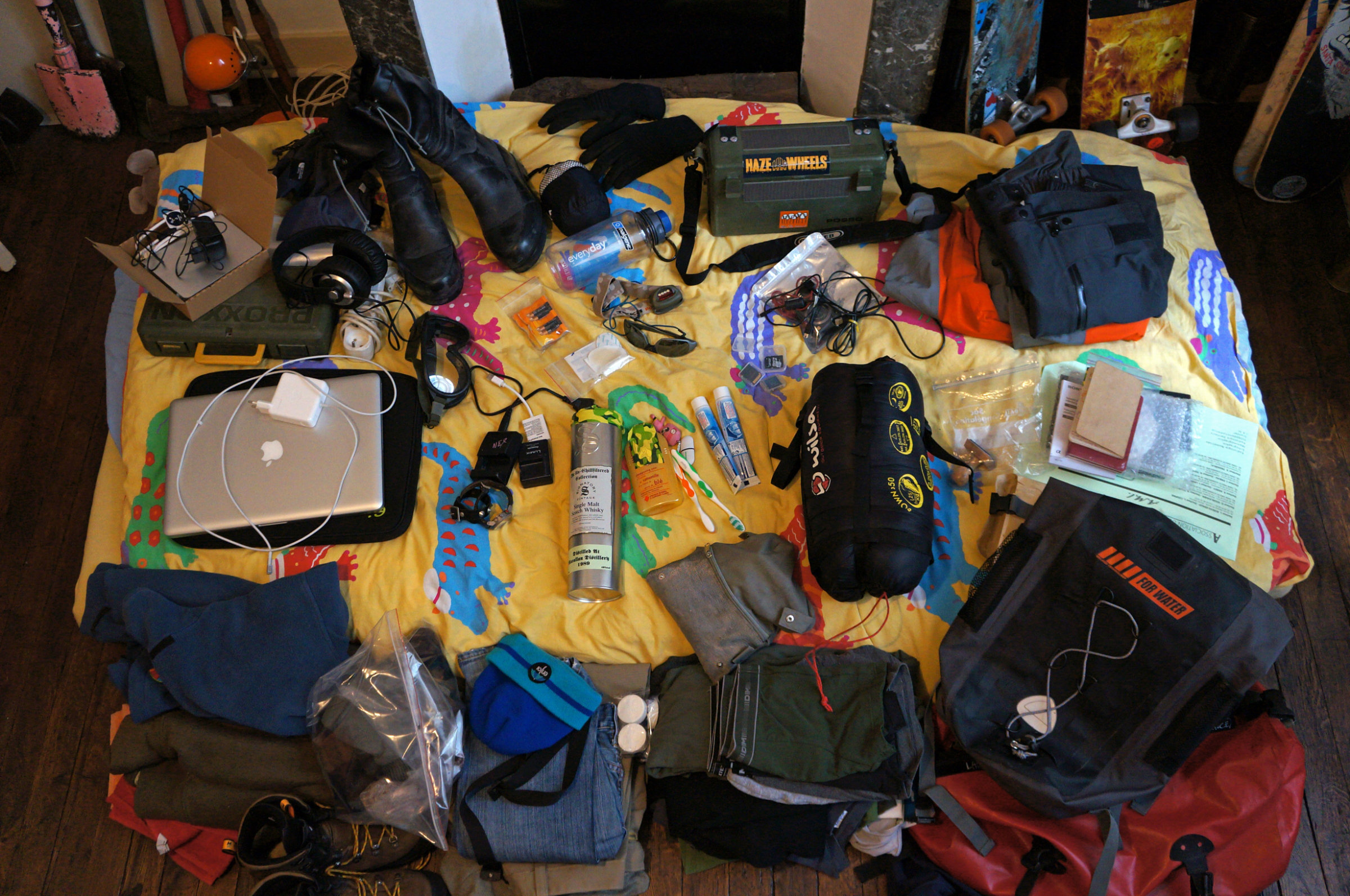 Je crois qu’il y a tout ce qu’il faut. Un gros sac à dos de 50 litres et un petit de 20 litres étanche, un dossier médical, une veste et un surpantalon en gore-tex, un appareil photo dans une mallette étanche, un sac de couchage super-puissant, des sous-vêtements chauds dont un collant en soie, un Leatherman et un couteau suisse, une trousse de toilette, une lampe frontale, une paire de lunettes de soleil, une bouteille Nalgène, un thermos 500 ml, deux paires de gants et une paire de gants de soie, une paire de gants avec des chaussons, un masque de ski, une bouteille de whisky écossais, deux pantalons de travail, un bonnet, de la lessive, une paire de chaussures de montagne, deux vestes polaires, un ordi, un disque dur, une clé USB, un casque audio, une petite caisse à outils.
