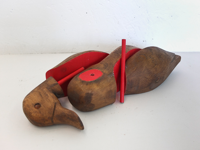 Statue de canard en bois découpée, percée et peinte à la manière des jouets de La vastringue, 37 x 14 cm
