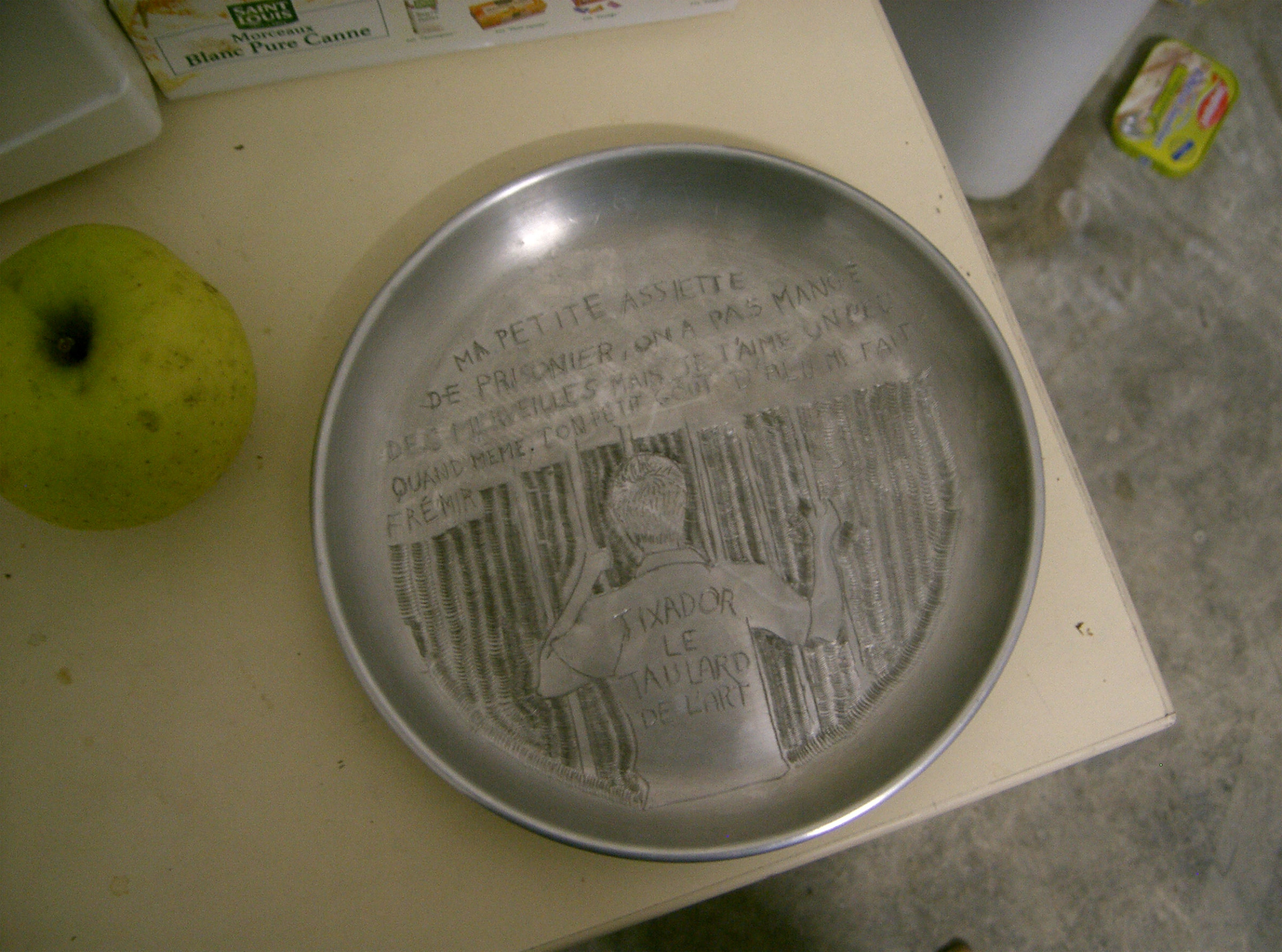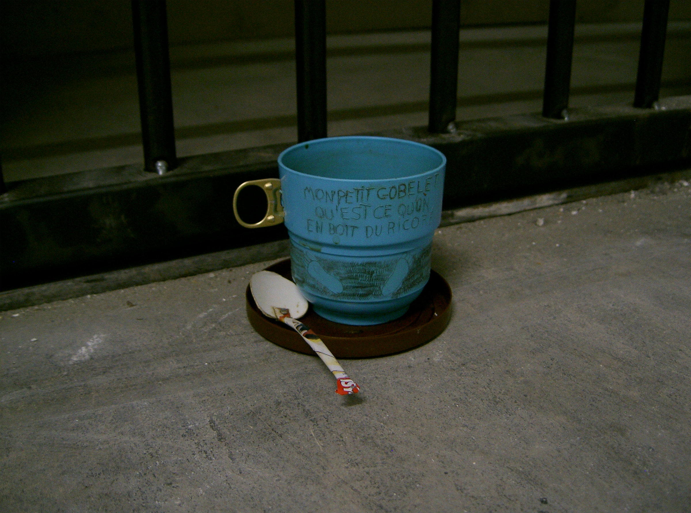 11 h 20, soit à peine deux heures plus tard. Mes pensées sont parties en vrille. Je me relève pour faire une Ricoré. Je n’ai plus aucune responsabilité à part me laisser vivre. Rien ne peut distraire ou préoccuper mon pauvre cerveau : je suis un gros salaud, quelle belle découverte ! Pour oublier ça, je me refais une Ricoré, je fais un peu de ménage, je tords une pointe de ma fourchette sur un barreau de la porte et je fais un petit trou à côté du miroir pour y insérer un minuscule bout de carton roulé. C’est le crochet idéal pour la capsule de mon pot de Ricoré. Je ferai un dessin dessus plus tard.