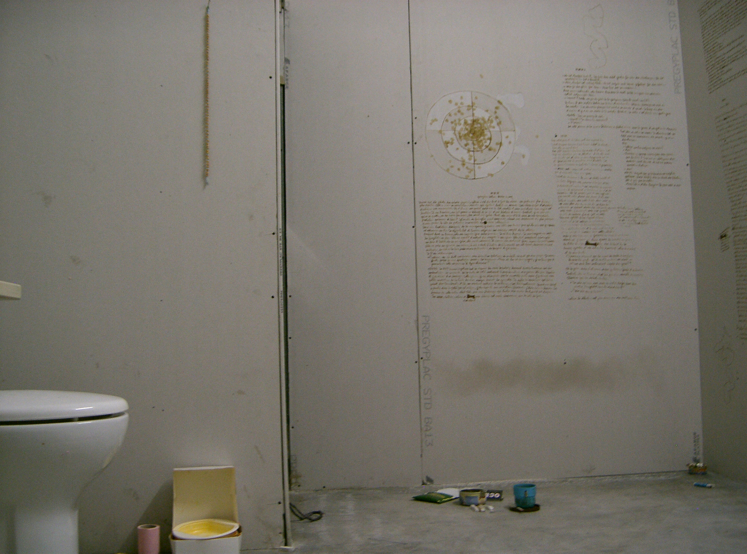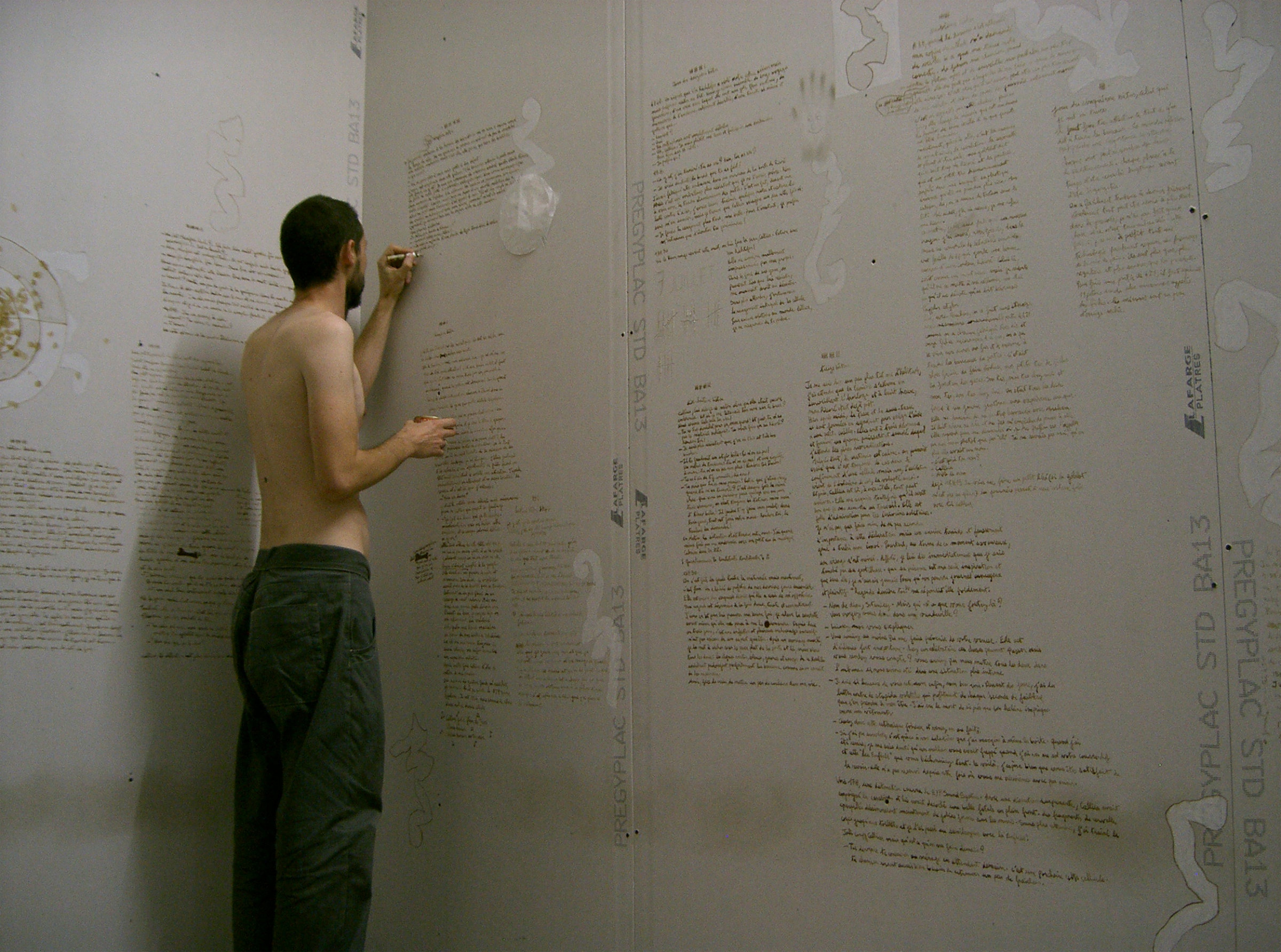 18 h 50. Pour écrire sur le mur, j’ai enroulé très serré le papier alu d’une plaque de chocolat aux éclats de noisettes : ça écrit presque aussi bien qu’une mine de crayon. Pour pallier sa trop grande souplesse, je l’ai entouré d’un carton d’emballage de moussaka collé avec une étiquette du lavabo. Pour atténuer les nuisances sonores de Enlarge Your Practice, j’ai fabriqué deux cônes de mie de pain que j’ai enfoncés dans mes oreilles."