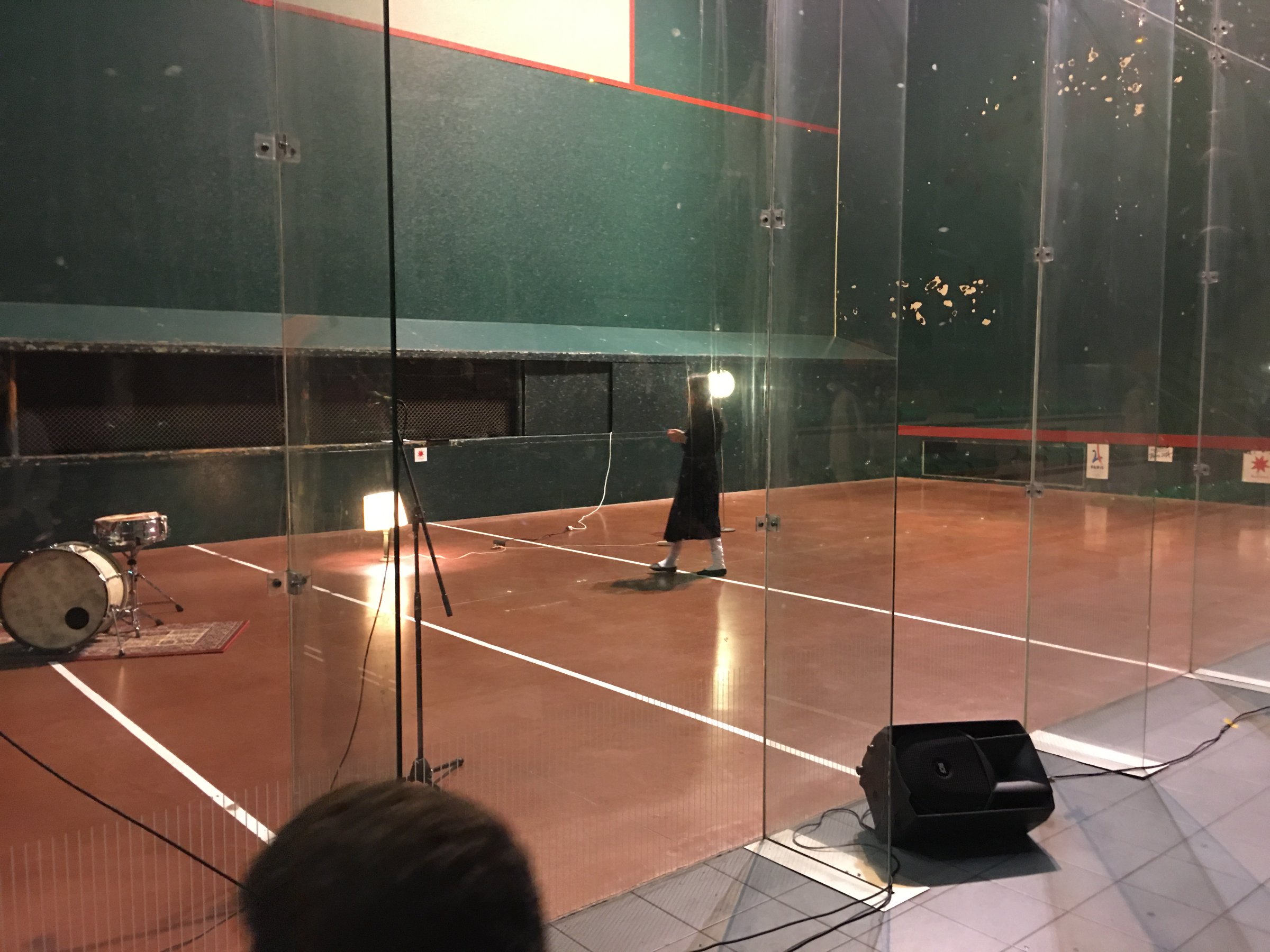 Dix participant·es réalisent diverses actions qui s’apparentent à une répétition générale. Des haut-parleurs installés côté gradins amplifient nos micros tandis que le reste de nos discussions, répercuté par la cloison transparente, reste inintelligible. Que se passe t-il au juste ? Un texte écrit par Geoffrey Lowe, lu par Madeleine Roger-Lacan, évoque la complexité de la situation.