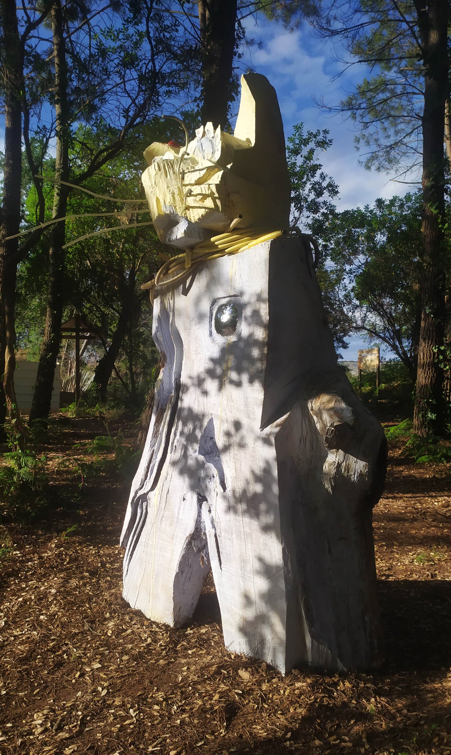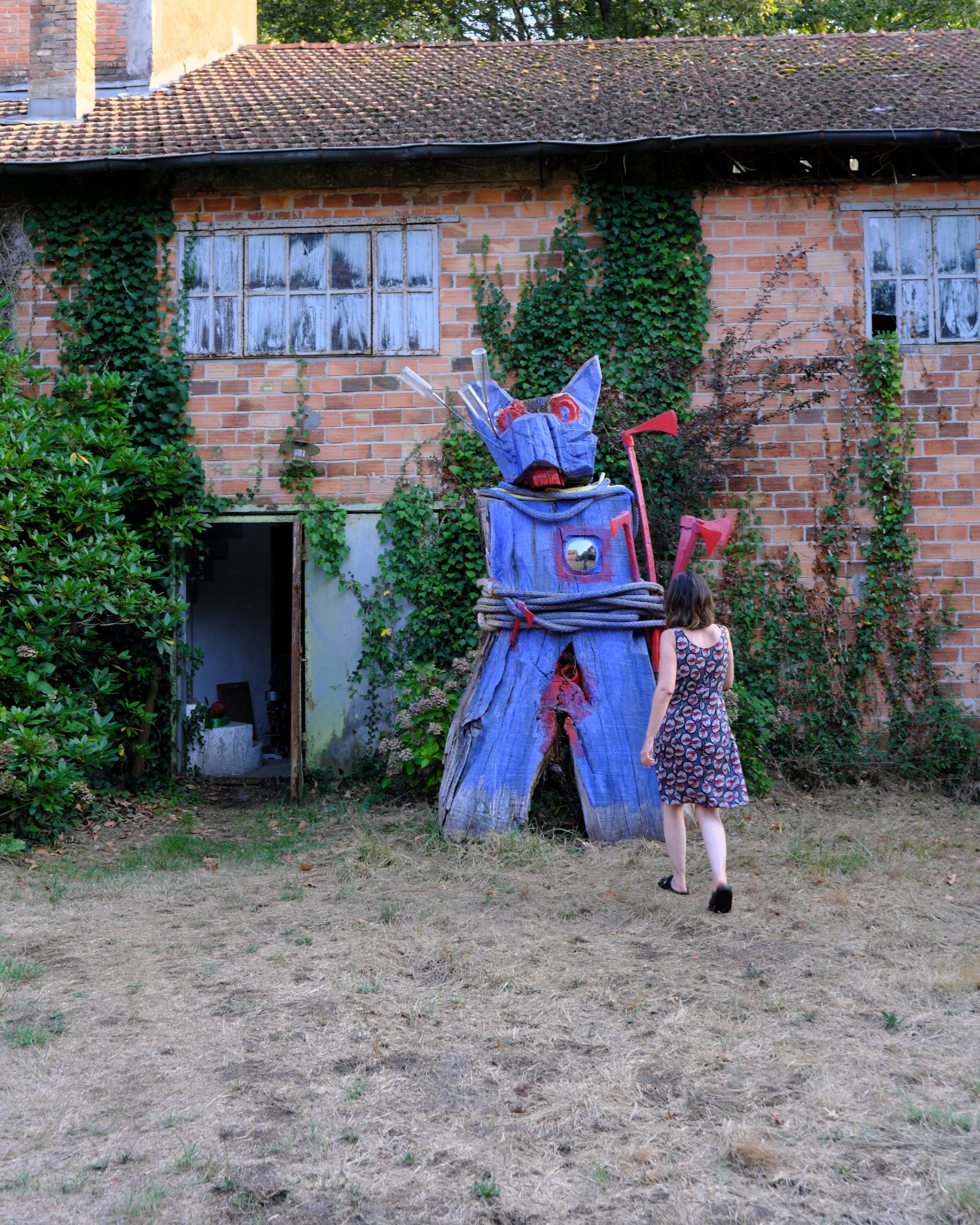 Châtaignier, tuyau d’arrosage, fer, corde, haches, bouteilles, pigments, 300 x 200 x 90 cm