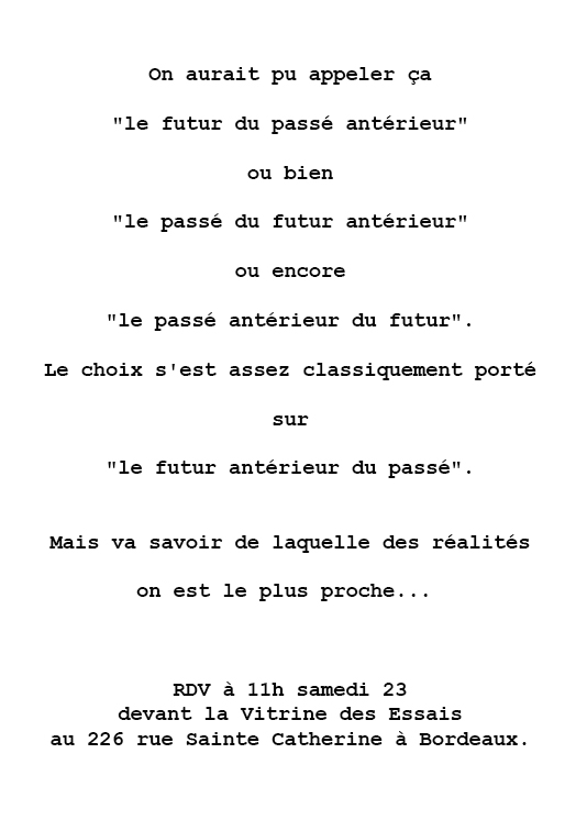 C’est à la vue des vitres vandalisées de la Vitrine des essais du lycée Montaigne que Sophie Mouron a eu l’idée d’intervenir directement sur cette « scène de crime ». La démarche de l’artiste souligne une réalité quotidienne, fugitive, banale que l’on ne remarque plus, met en lumière les détails invisibles de la ville et nous permet de voir ce que l’on ne voit plus. Son travail sur le temps, le paysage et le détail, souvent lui même imperceptible, invite le passant à une nouvelle perception du réel. Ici, c’est au travers de trois paysages, de trois temporalités, qu’elle engage les passants de la rue sainte Catherine à porter un regard nouveau sur l’accident, à déceler la poésie du commun