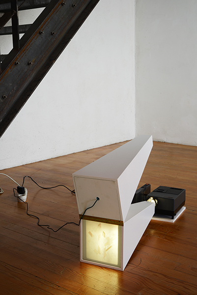 MDF, peinture, diapositive (Hotel Particulier, 1923, Theo van Doesburg and Cornelis van Eesteren), simulateur de télévision, verre acrylique