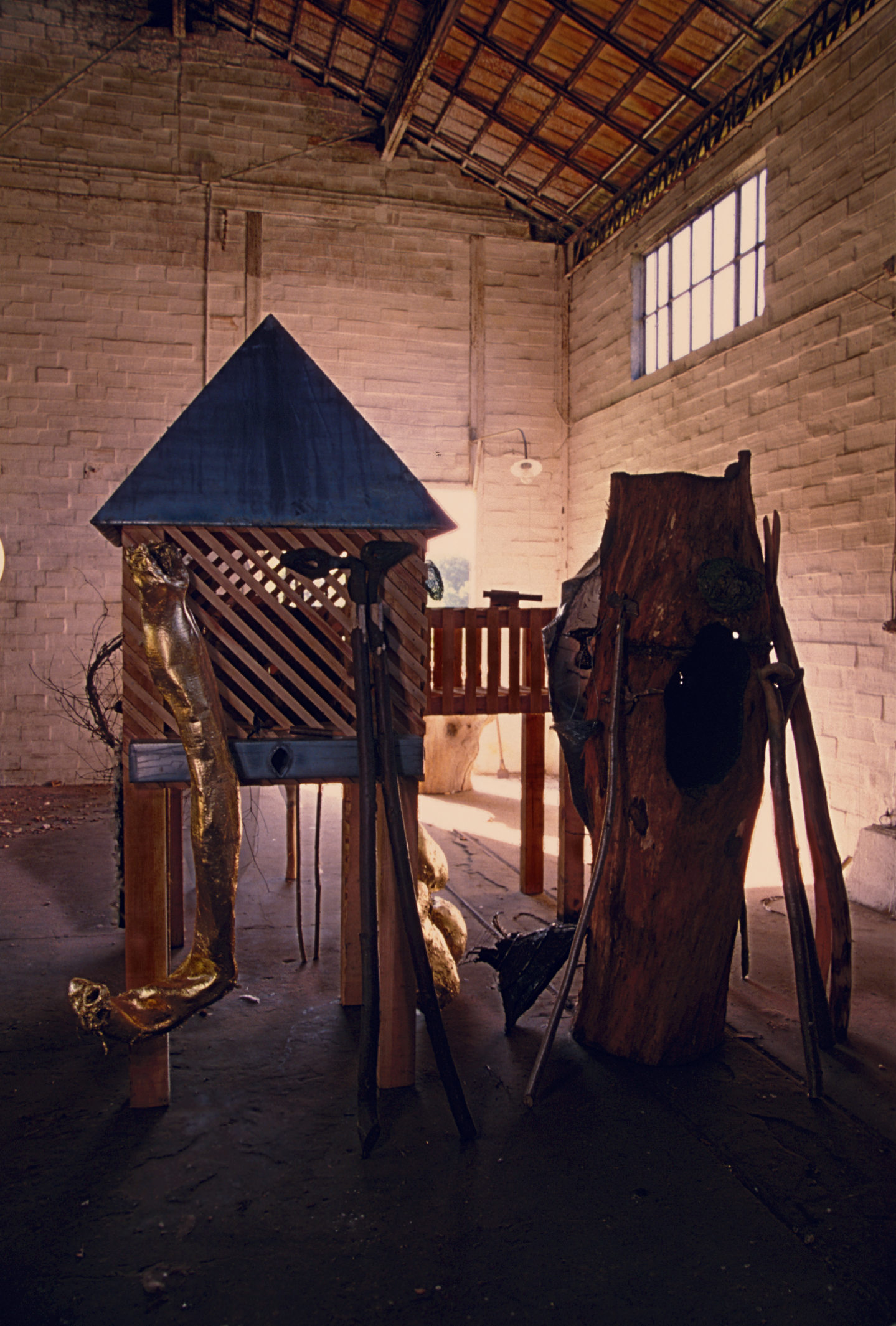 La Grande cabane est constituée de planches de pin, recouvertes de tôles ondulées. Elle ressemble à un simple appentis et abrite neufs « outils » emmanchés sur des branches d’arbres de taille et de formes différentes. De la branche représentant le manche ou de l’outil, il est difficile d’envisager lequel présida au choix de l’autre, conférant à ces objets une évidence, une alliance de la nature et de l’esprit.