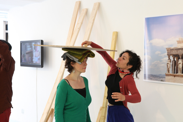 Les caryatides : un stéréotype sur lequel on pourrait s’appuyer pour faire un enjeu de micro-politique, etapprocher le thème de l’agora. Nous imaginons que nous pourrions détourner ces caryatides de leur servitude et les transformer en citoyennes : si les caryatides se retournaient les unes vers les autres, elles se regarderaient et feraient agora. Elles pourraient réfléchir politiquement à leur situation.