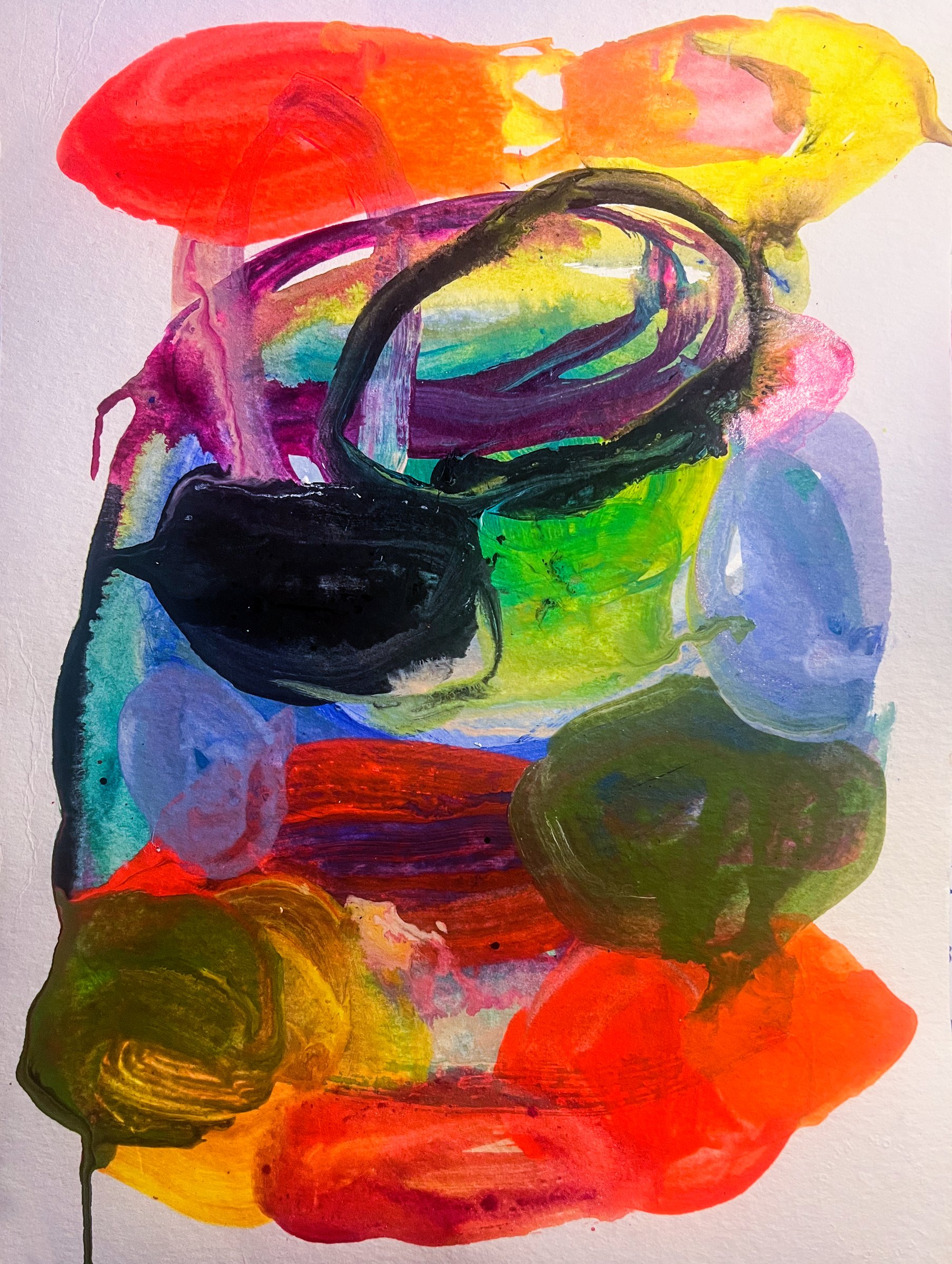 La série Poças — qui signifie « flacon d’eau » — explore les traces laissées par la couleur et l’eau. En utilisant l’acrylique diluée, les formes qu’elle présente sont comme des flaques qui se déploient librement, capturant un instant de vibration et de lumière.