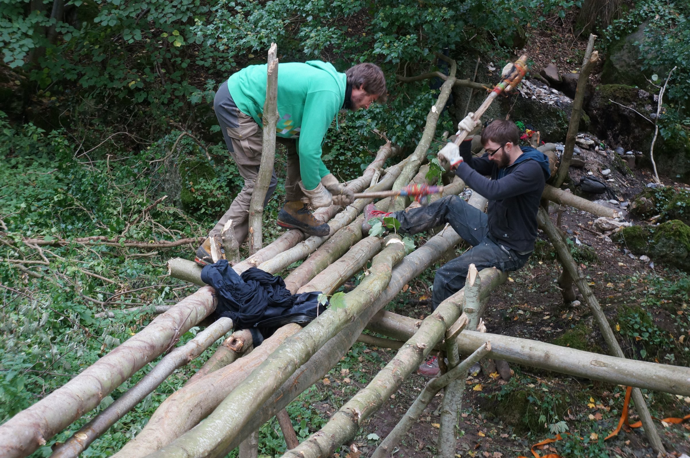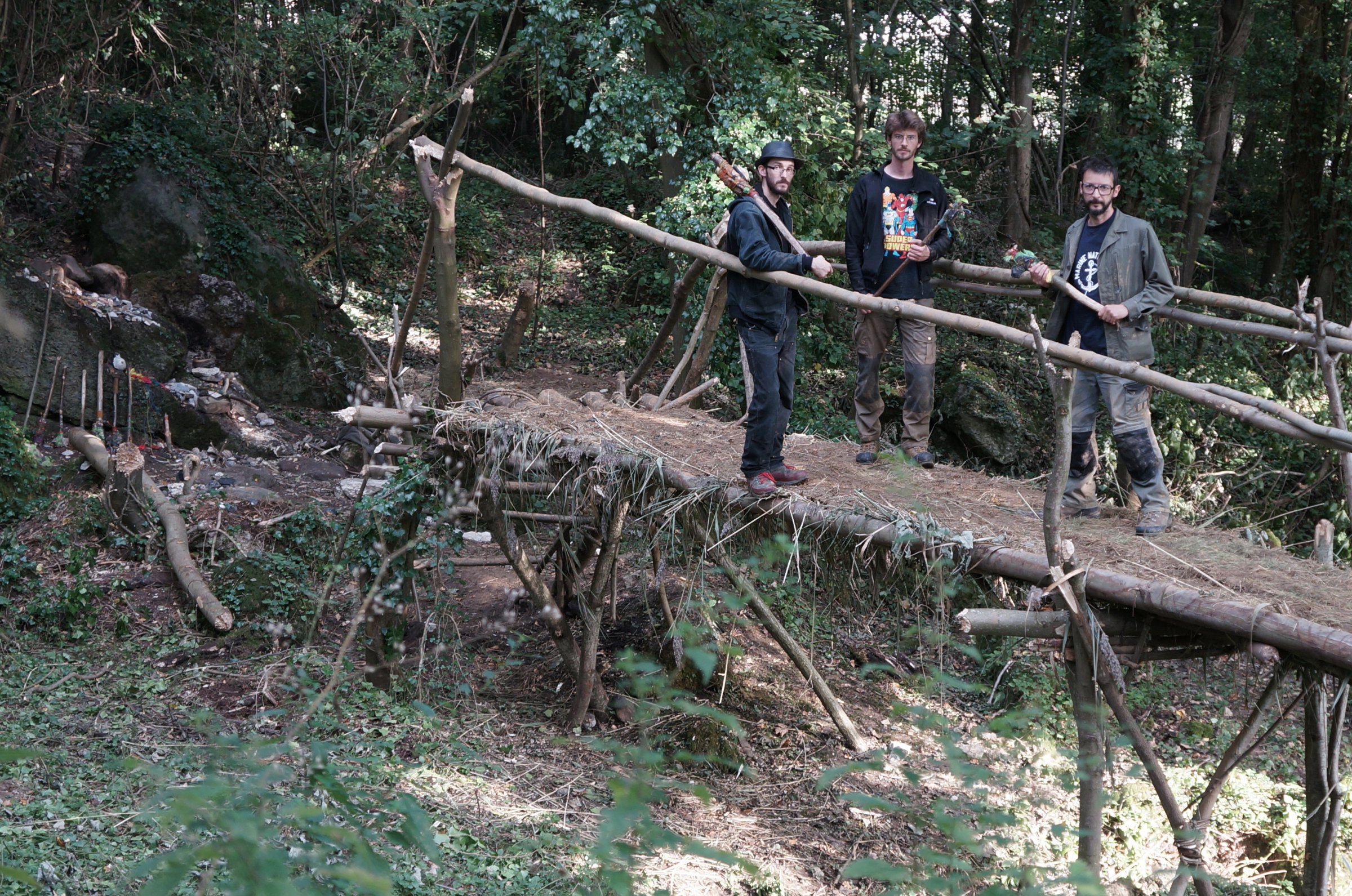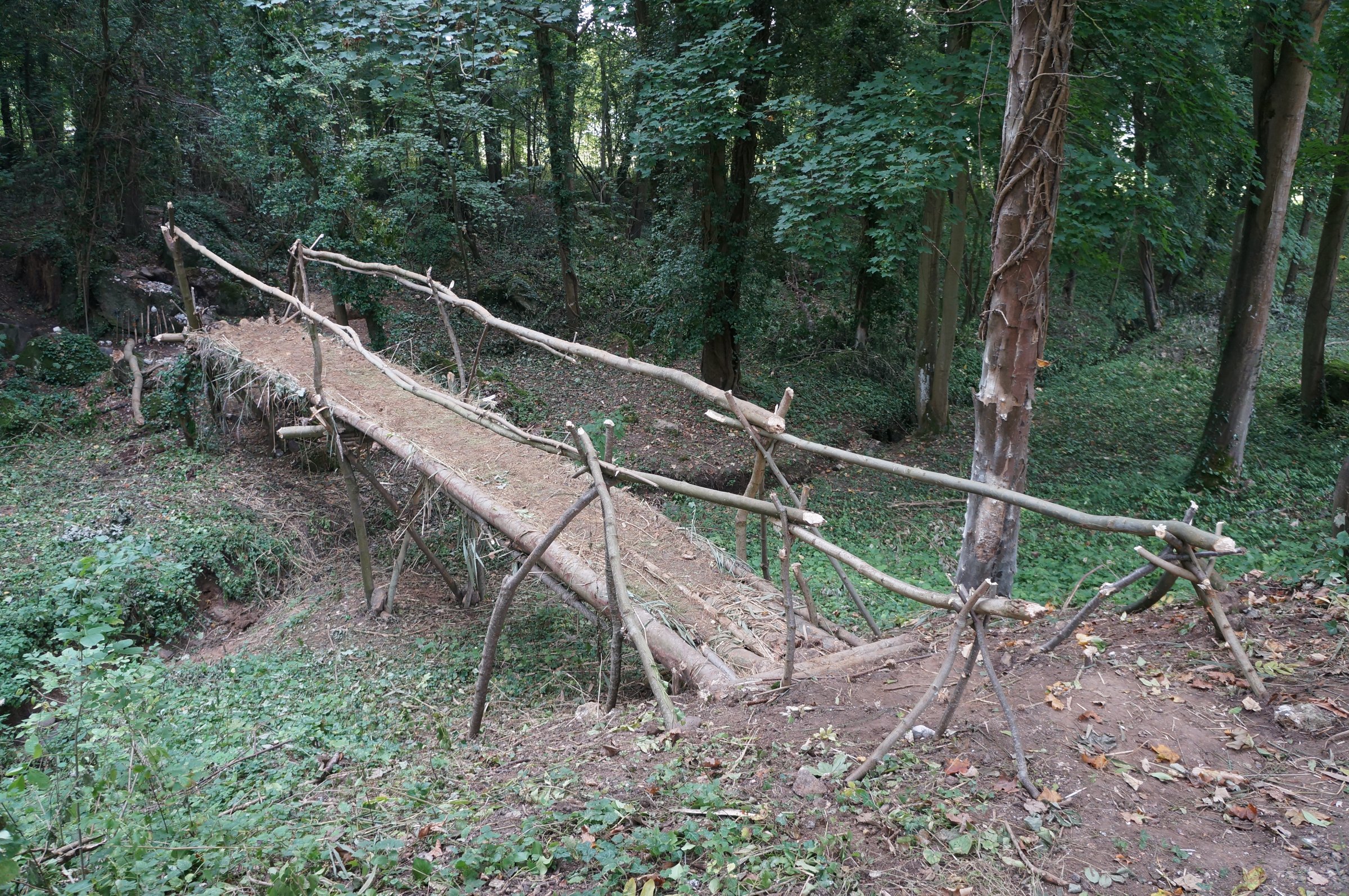 Après quelques essais, tous les assemblages des piliers ont été réalisés par coincements, en emboîtant trois fourches les unes dans les autres. Le tablier est fait de dix troncs de douze mètres posés dans la longueur, pour économiser les coupes, puis recouverts d’un revêtement en torchis.