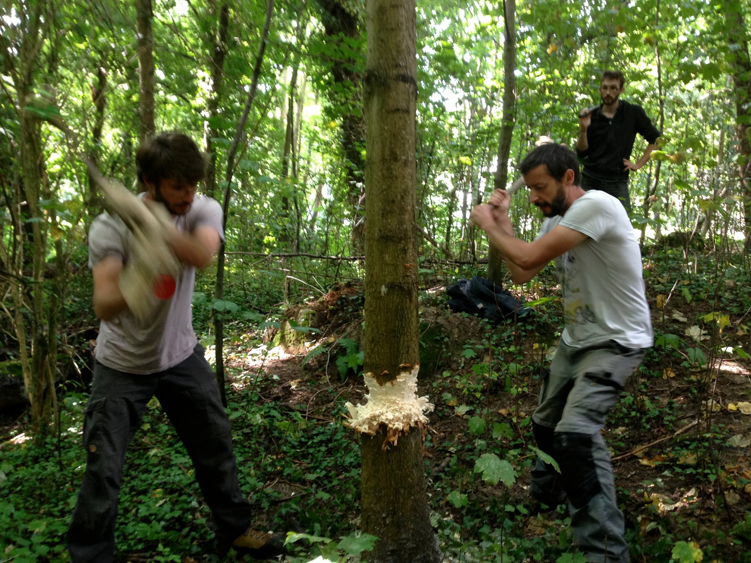 Dans un premier temps, il a fallu se procurer des silex et apprendre à les tailler pour en faire des haches. Il a fallu mettre au point la bonne technique pour couper un arbre puis réfléchir à un mode de construction qui ne nécessite pas de perçages.
